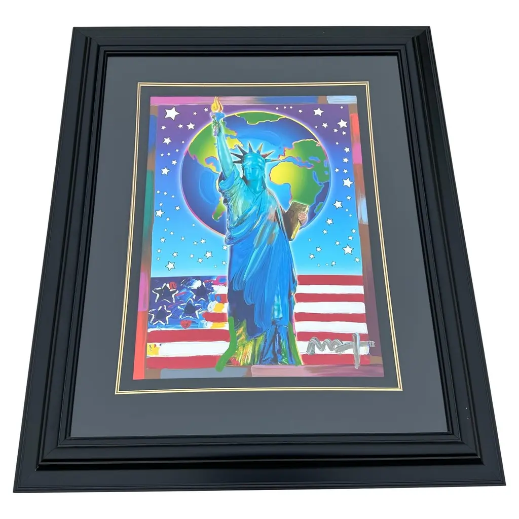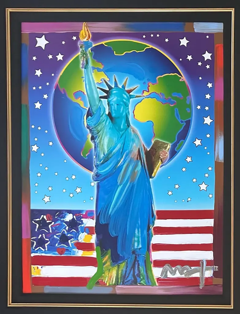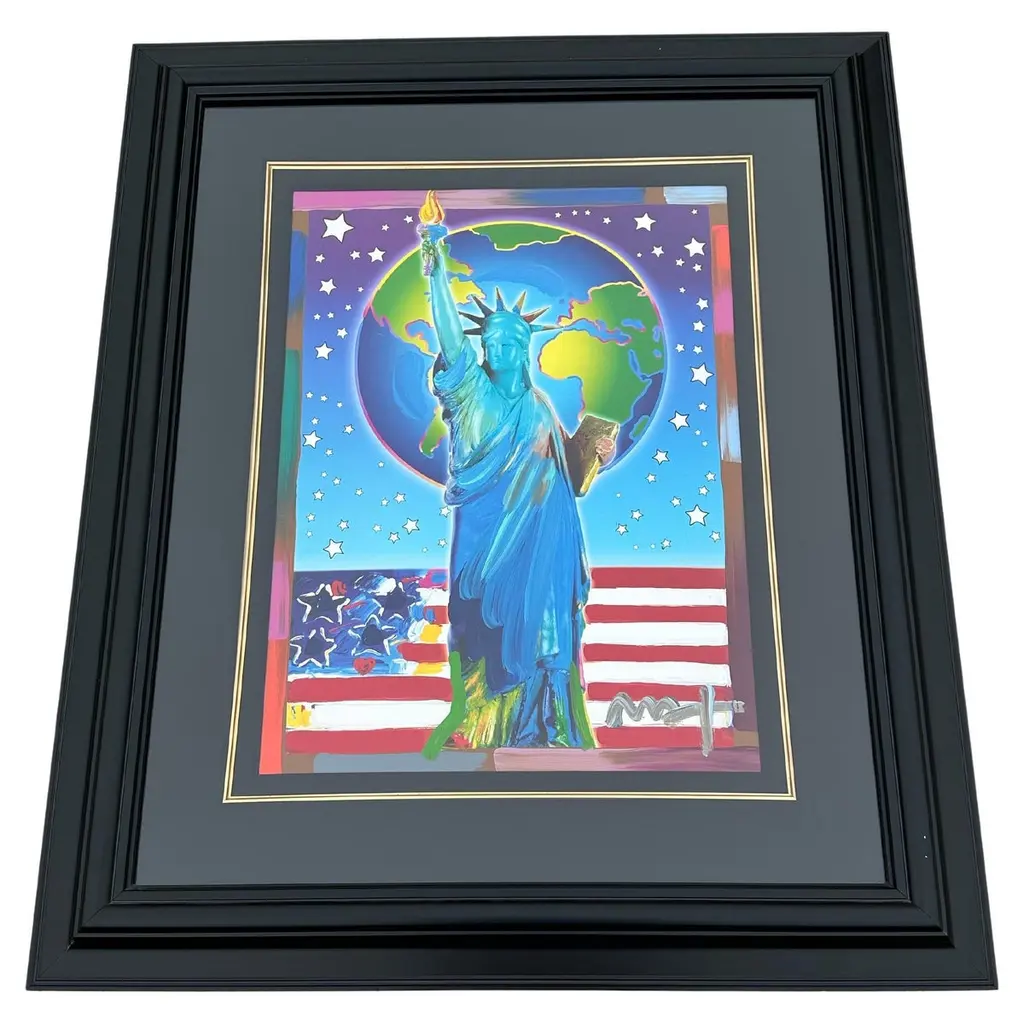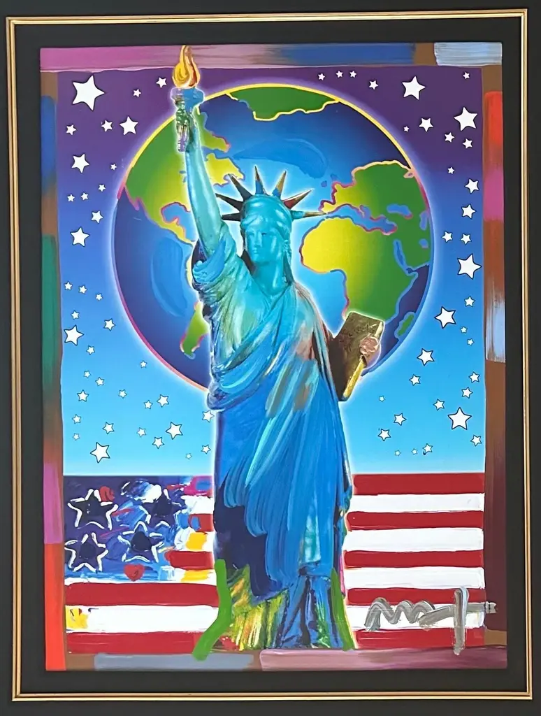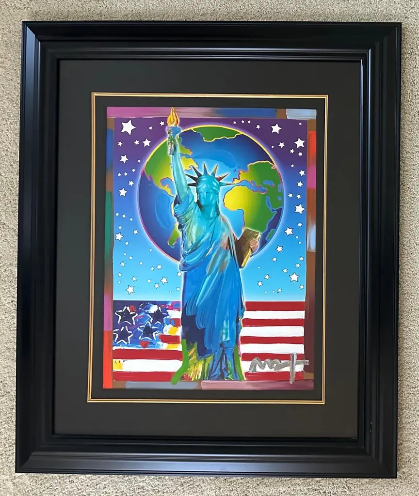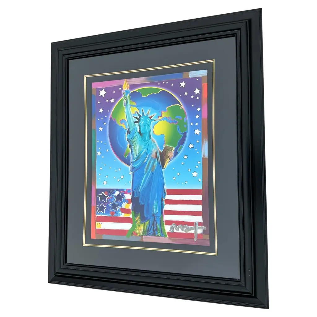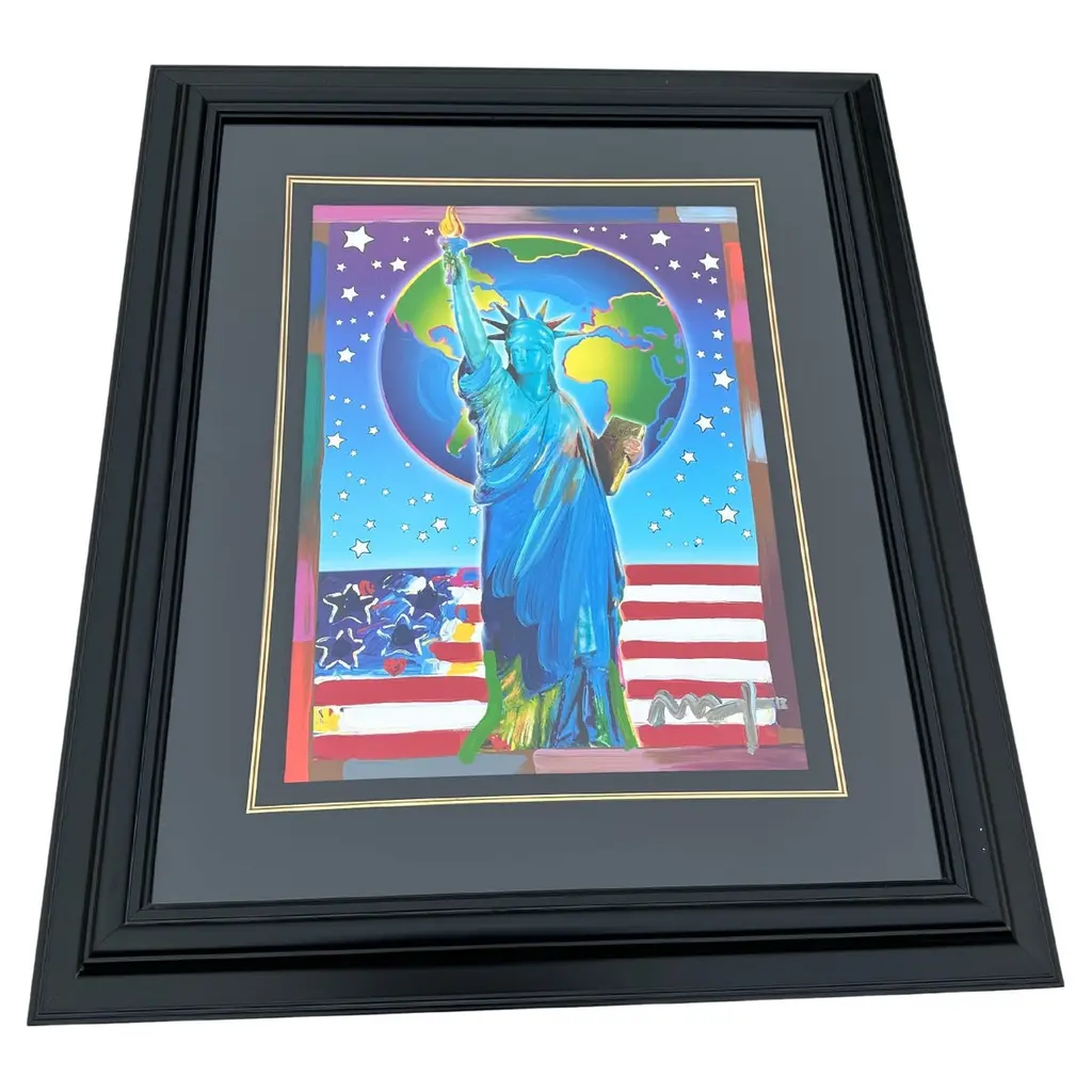 -Limited edition Peter Max "Peace on Earth II" mixed media with acrylic painting enhancements on a color lithograph-The art is hand signed by Peter Max in acrylic and the lithograph has been hand painted over and enhanced by hand. As a result of this process, each piece in the Patriotic Series Suite is a unique work; no two pieces have the same colors, and brush strokes applied the same way.-Colors are very vibrant and bright-Hand signed "Max" in acrylic in lower right-hand corner-Professionally framed and matted. Framed dimensions are 31.5" x 37.5"; image is 18" x 24".-Certificate of Authenticity from Park West GalleryPeter Max has evolved from a visionary Pop artist of the 1960s to a master of Neo-Expressionism. His vibrant and colorful works have become a lasting part of contemporary American culture and is synonymous with the spirit of the ‘60s and ‘70s. During his long career, the artist has painted for six U.S. presidents, was the official artist for the 2006 Winter Olympics U.S. team, and has created art for Woodstock, World Cups, U.S. Opens, Super Bowls and more.Peter Max (1937) was born in Berlin, Germany, traveled extensively in the world and settled in the United States. He is a living legend as an artist, known for his use of bright and vibrant colors. He is associated with pop art and is credited to have revolutionized the art of the 1960's with his "Cosmic 60's" style and deeply influenced the American counterculture. On July 4th, 1976, he began his Statue of Liberty series, leading to his effort with Lee Iacocca to help in the restoration of the Statue of Liberty. Peter is recently noted for his 911 series of art, which he did after the 2001 attack on America. He followed that up with his Patriotic Series of art. He is truly a giant in the art world!#4465RM