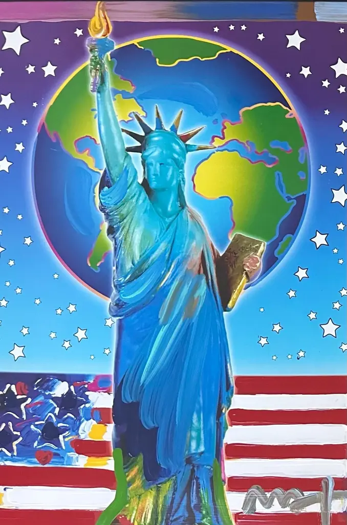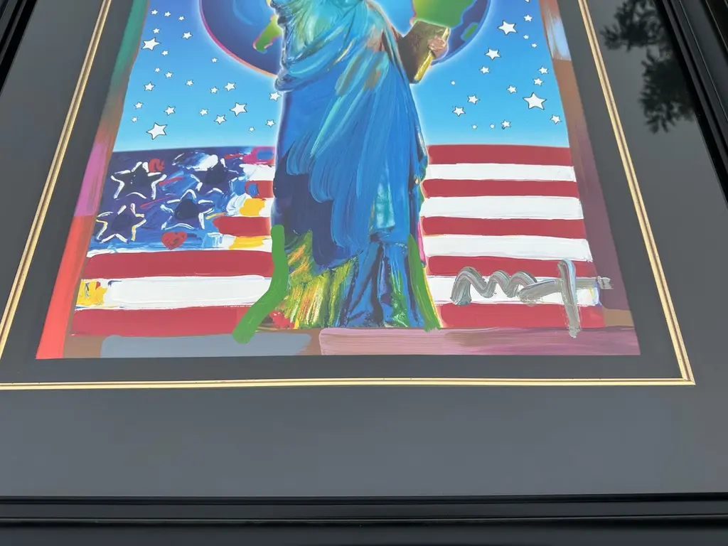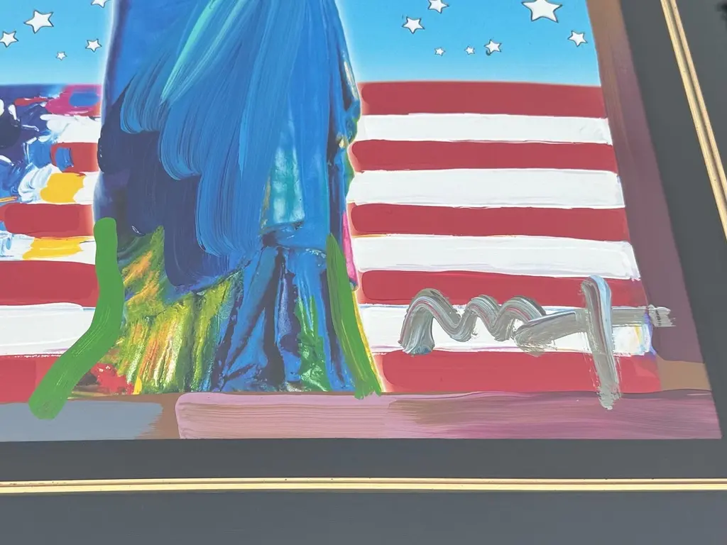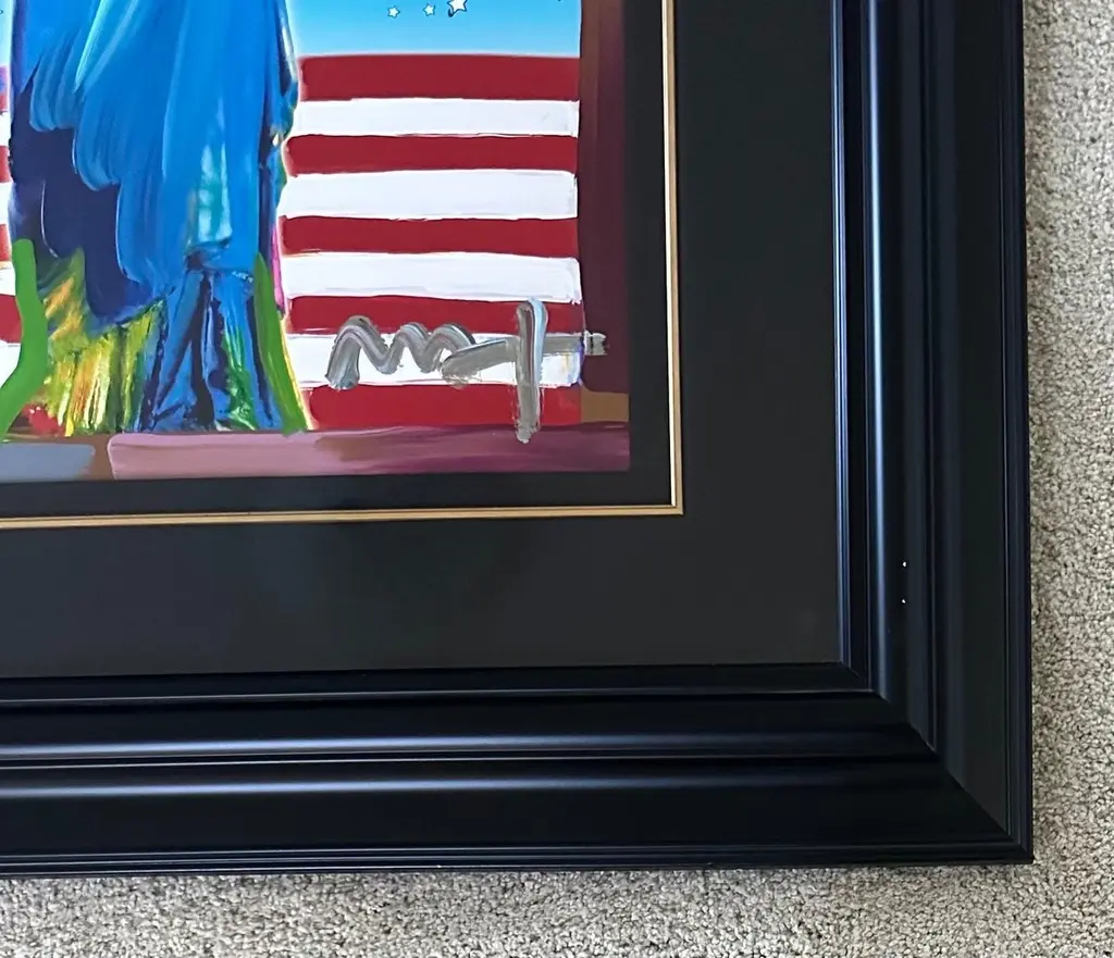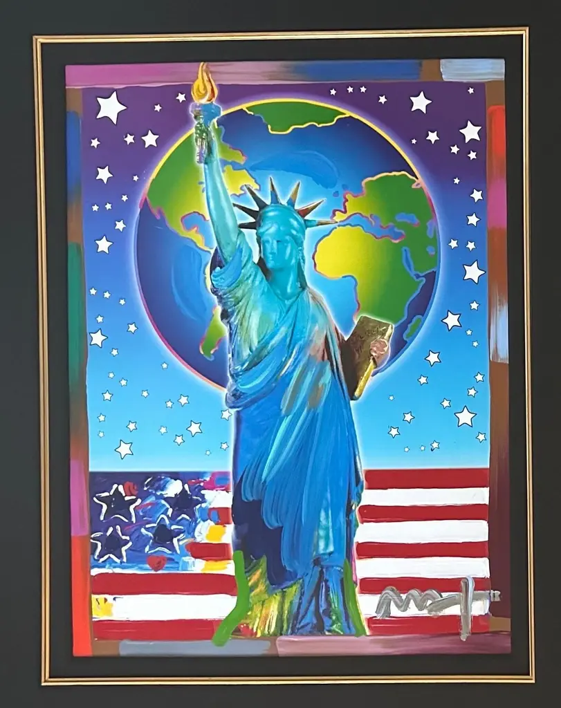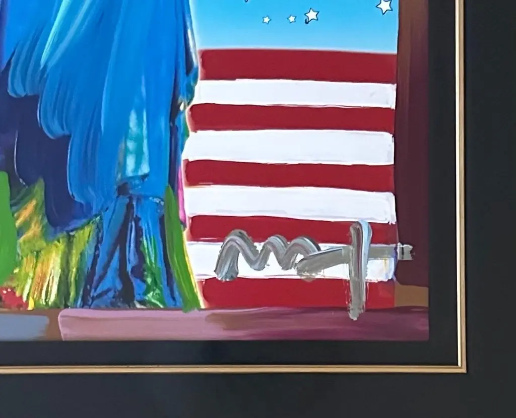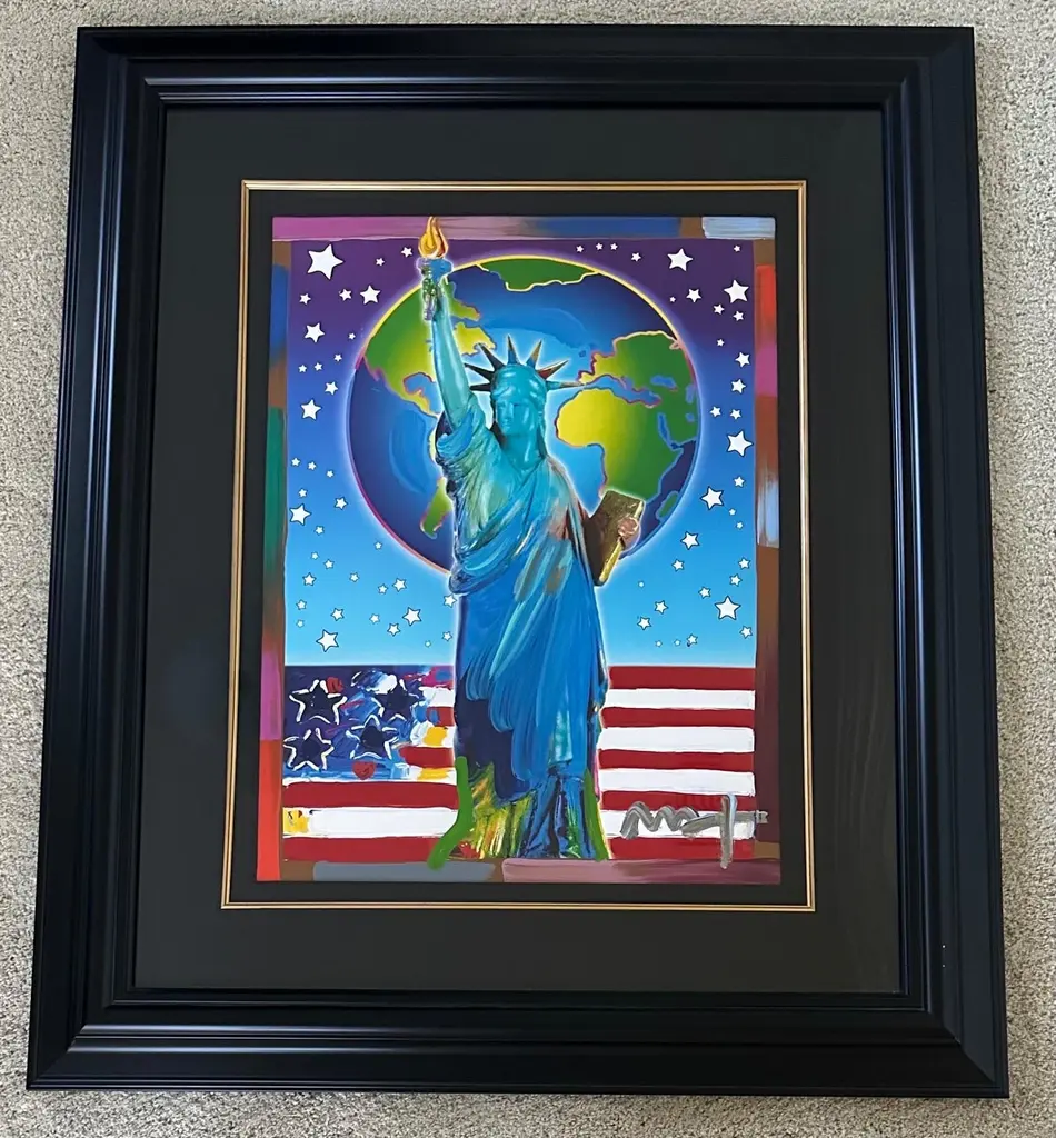 -Limited edition Peter Max "Peace on Earth II" mixed media with acrylic painting enhancements on a color lithograph-The art is hand signed by Peter Max in acrylic and the lithograph has been hand painted over and enhanced by hand. As a result of this process, each piece in the Patriotic Series Suite is a unique work; no two pieces have the same colors, and brush strokes applied the same way.-Colors are very vibrant and bright-Hand signed "Max" in acrylic in lower right-hand corner-Professionally framed and matted. Framed dimensions are 31.5" x 37.5"; image is 18" x 24".-Certificate of Authenticity from Park West GalleryPeter Max has evolved from a visionary Pop artist of the 1960s to a master of Neo-Expressionism. His vibrant and colorful works have become a lasting part of contemporary American culture and is synonymous with the spirit of the ‘60s and ‘70s. During his long career, the artist has painted for six U.S. presidents, was the official artist for the 2006 Winter Olympics U.S. team, and has created art for Woodstock, World Cups, U.S. Opens, Super Bowls and more.Peter Max (1937) was born in Berlin, Germany, traveled extensively in the world and settled in the United States. He is a living legend as an artist, known for his use of bright and vibrant colors. He is associated with pop art and is credited to have revolutionized the art of the 1960's with his "Cosmic 60's" style and deeply influenced the American counterculture. On July 4th, 1976, he began his Statue of Liberty series, leading to his effort with Lee Iacocca to help in the restoration of the Statue of Liberty. Peter is recently noted for his 911 series of art, which he did after the 2001 attack on America. He followed that up with his Patriotic Series of art. He is truly a giant in the art world!#4465RM