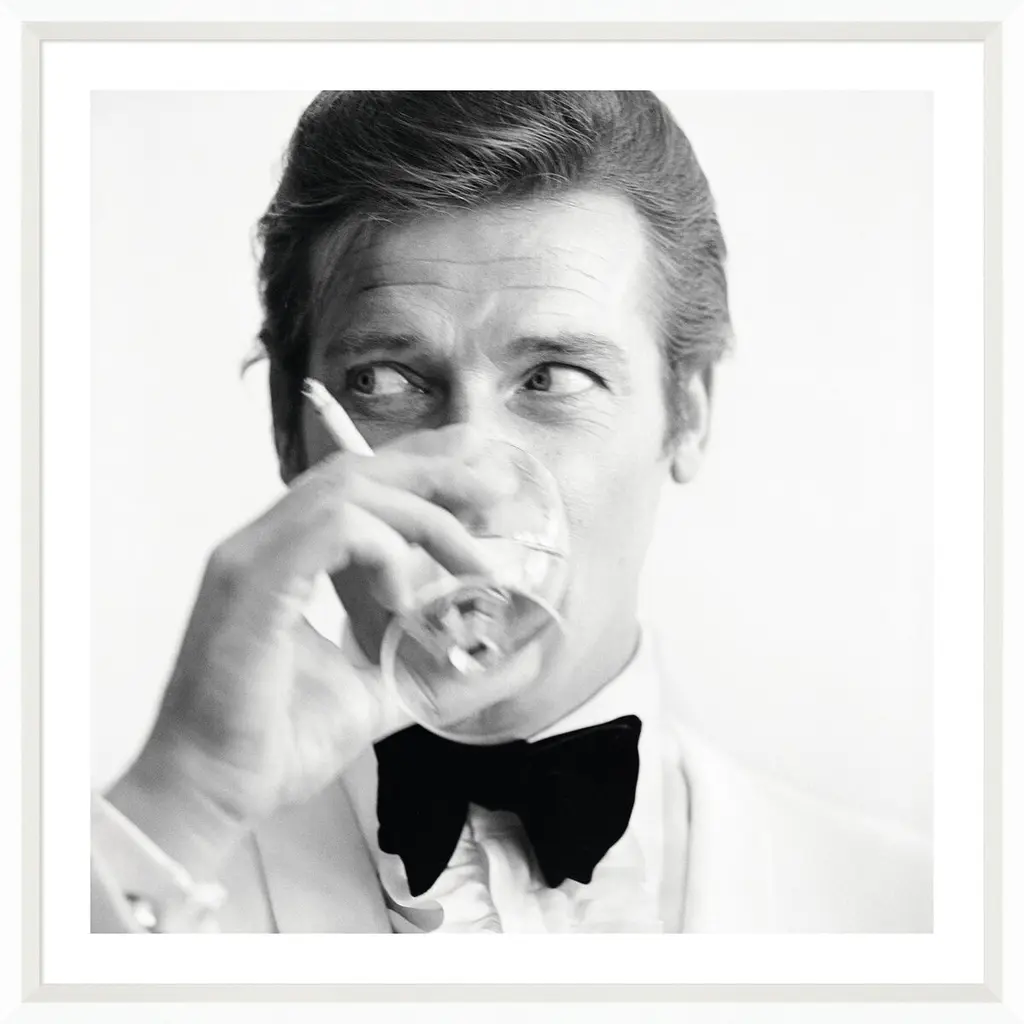 This iconic image from Peter Ruck captures the dashing Roger Moore, best known for his role as James Bond, as he enjoys a martini. Printed on archival paper, the photo arrives framed and ready to hang.