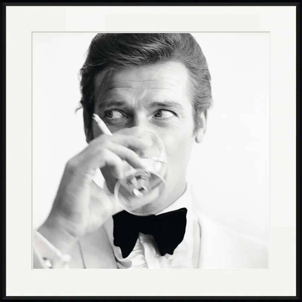 This iconic image from Peter Ruck captures the dashing Roger Moore, best known for his role as James Bond, as he enjoys a martini. Printed on archival paper, the photo arrives framed and ready to hang.