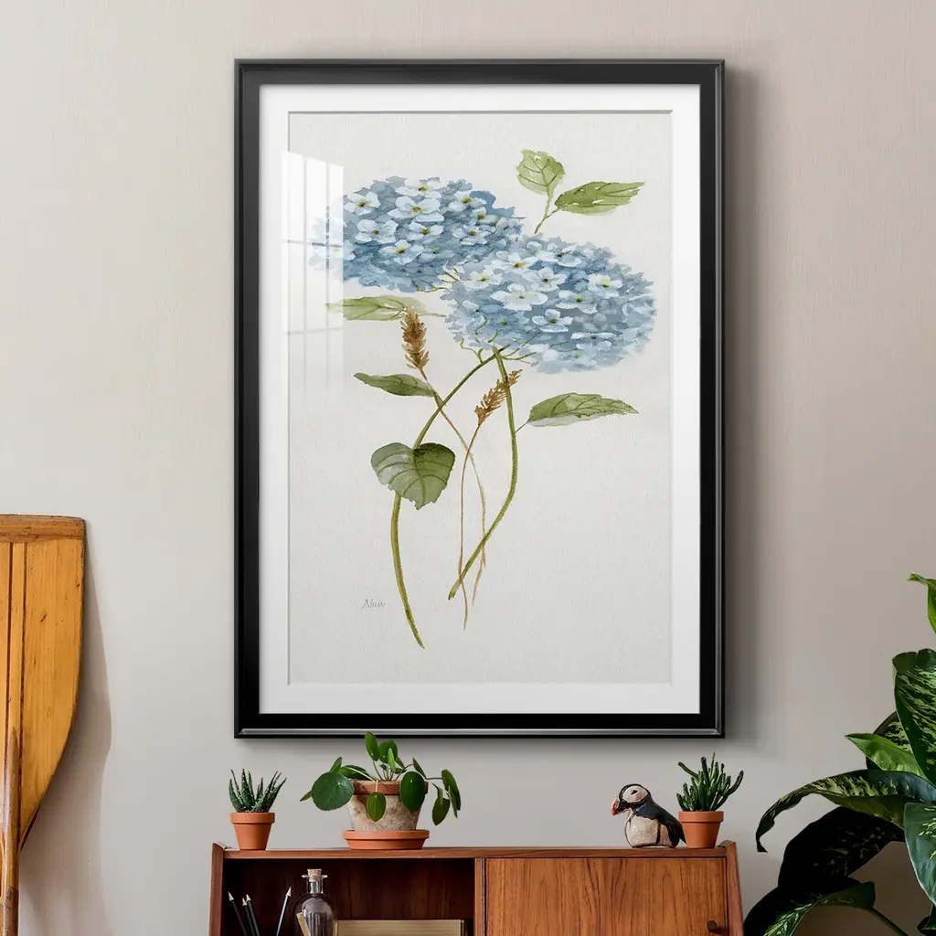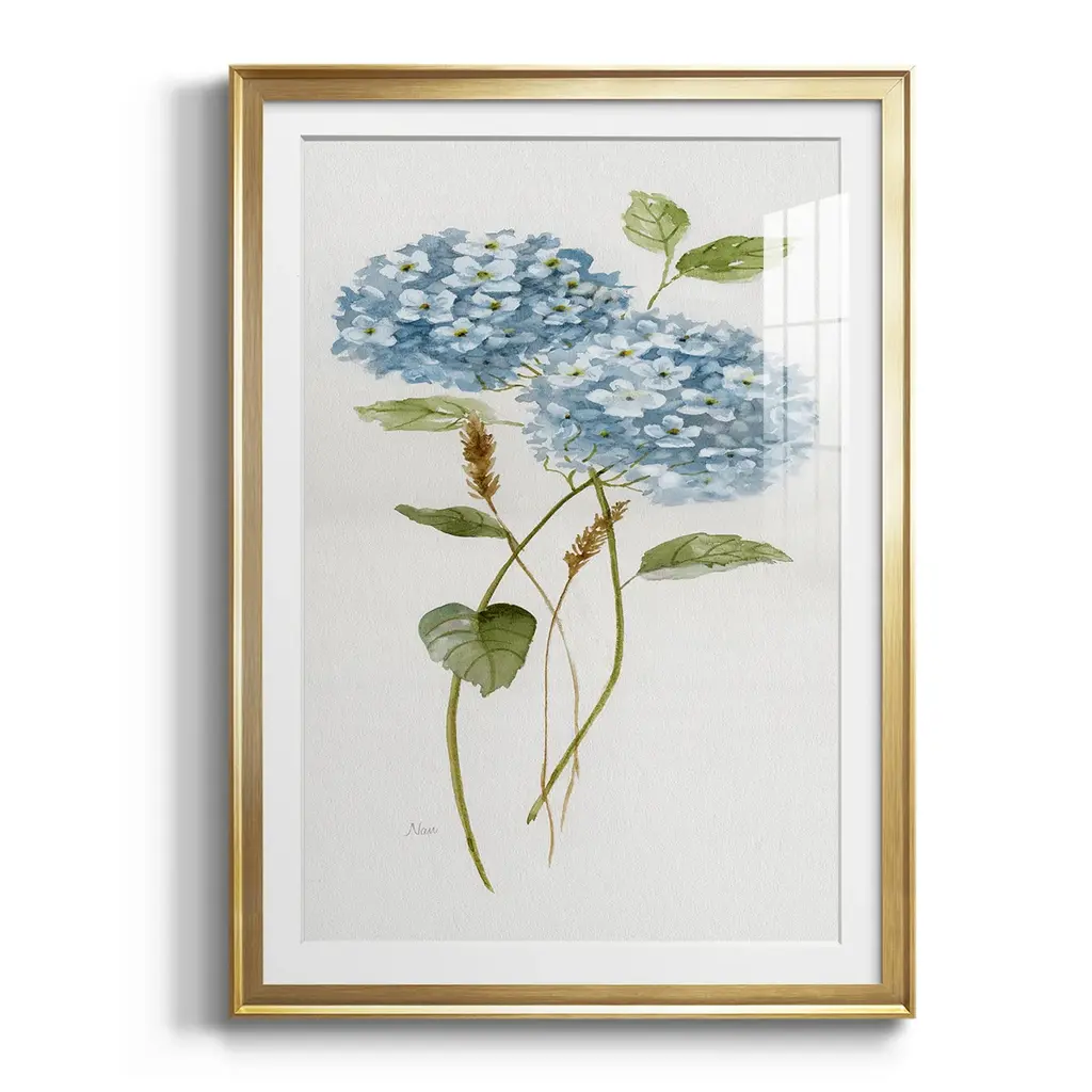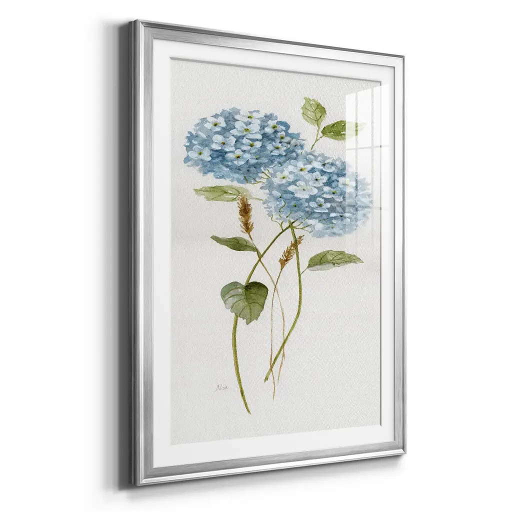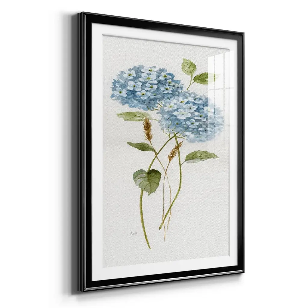 Petite Blue Hydrangea II Premium Framed Print - Ready to Hang A Premium Framed Print created to last. Framed in distressed wood and available in an array of sizes and colors Featuring a beveled a solid wood stretcher bar, each piece comes ready to hand 4 SIZES AVAILABLE 30.5''X42.5'' - Overall Size 26.5'X36.5'' - Overall Size 22.5''x30.5'' - Overall Size 18.5''x24.5'' - Overall Size Each piece is made to order. Each piece comes with hanging hardware. Made in the USA Ready to Hang Giclee Paper Print Acrylic Glass Beveled Matt Board