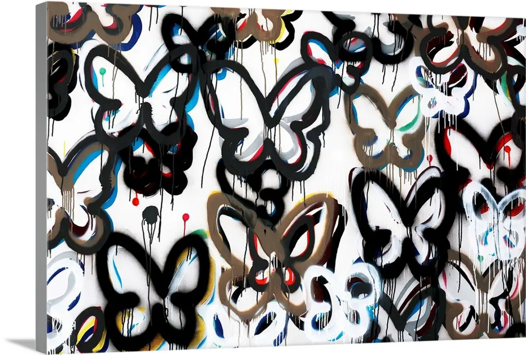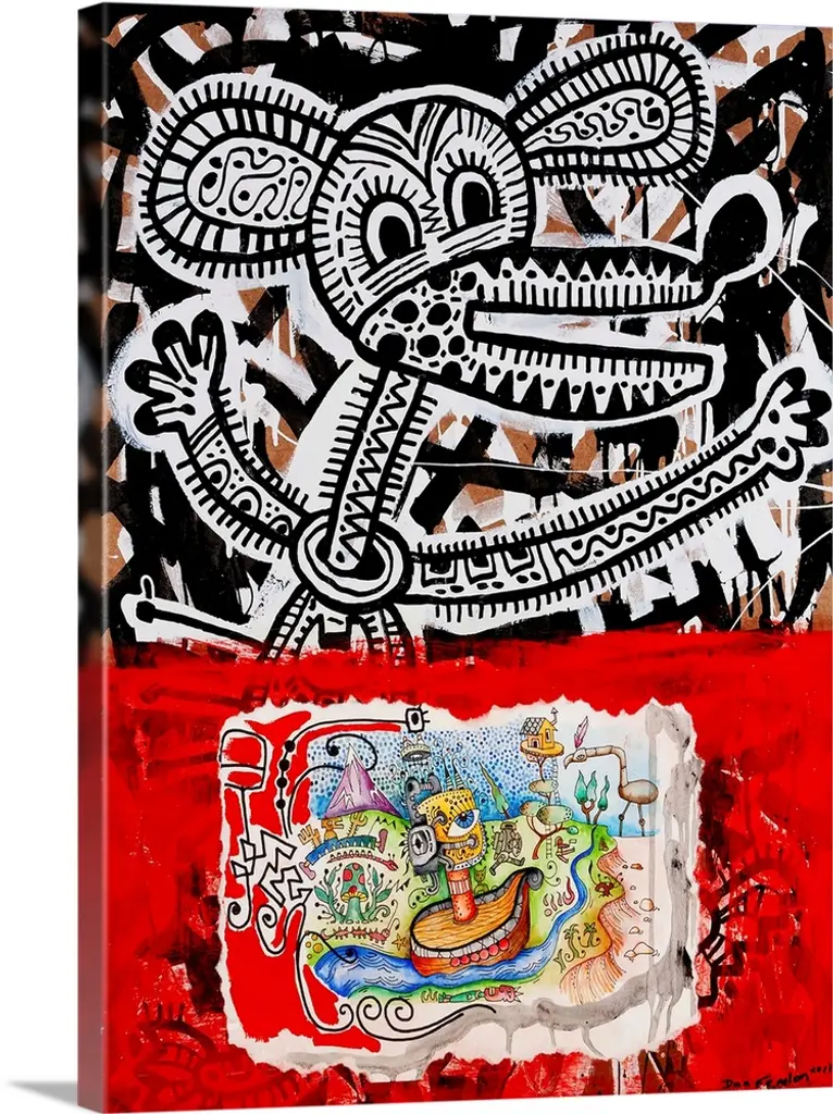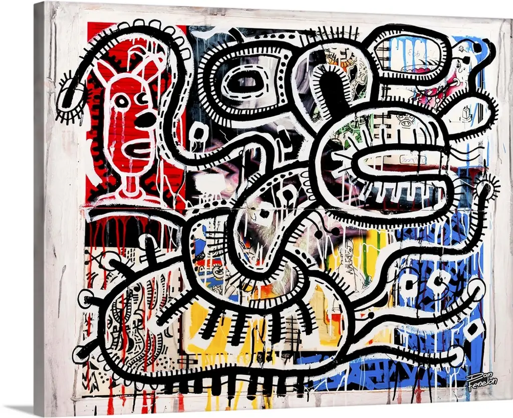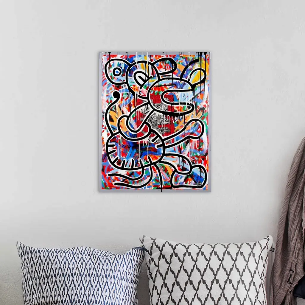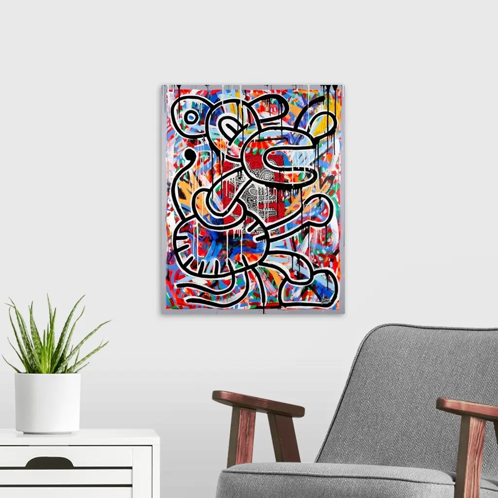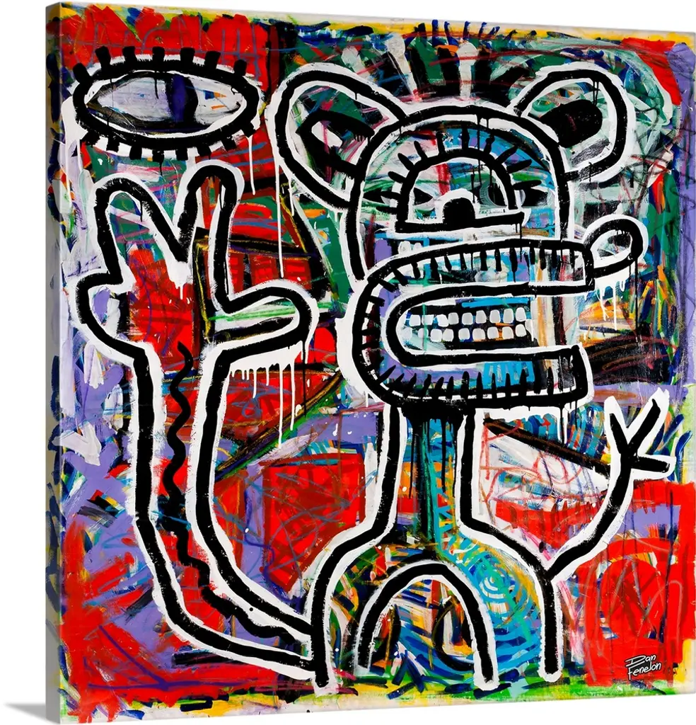 Contemporary abstract painting of a mouse like figure in an urban art spray can style.