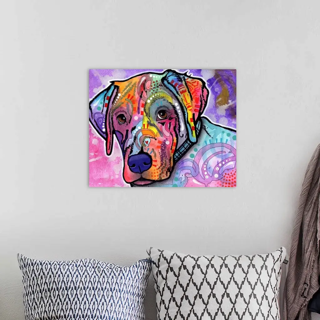 Colorful painting of a dog with abstract markings on a pink and purple background with gray paint splatter.