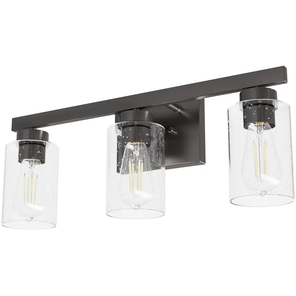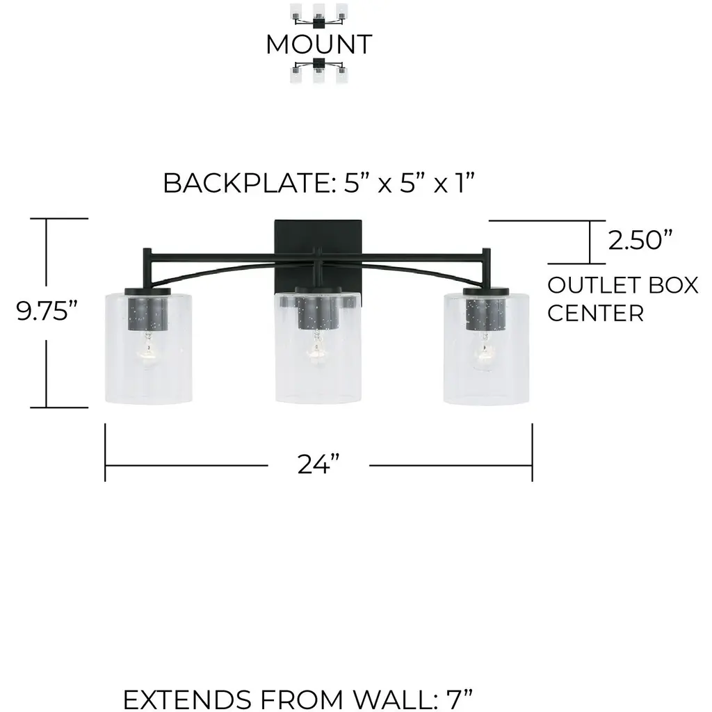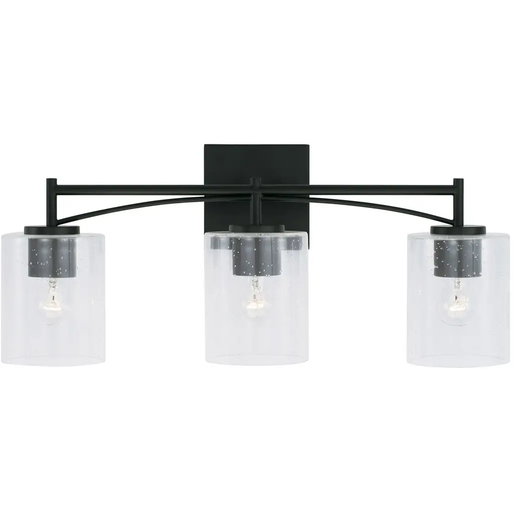 The sharp lines and artistic arches of the Peyton 3-Light Vanity are timelessly transitional. The muted tone of the Matte Black finish allows the seeded glass shade to take center stage. This fixture is available as a 2-light or 3-light.