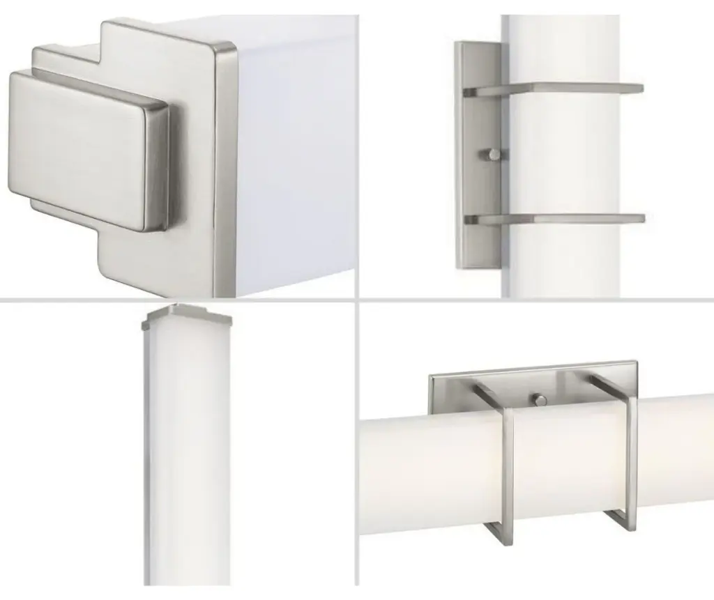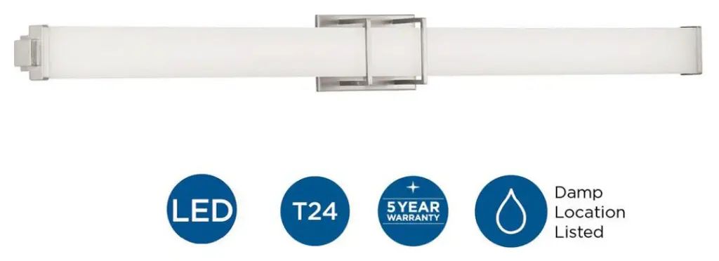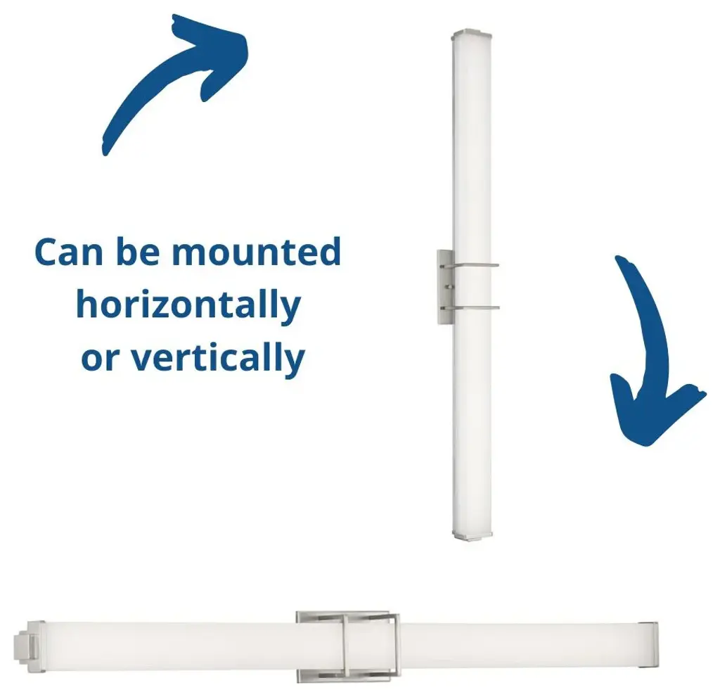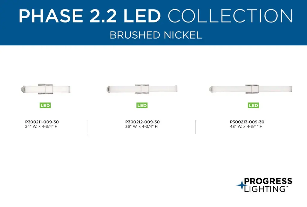 Phase 2.2 features a thin, acrylic shade framed by architectural accents in Brushed Nickel complete the design. This specially designed 486in. linear bath fixture delivers ambient light to surfaces free of shadows. Ideal for residential, commercial and multi-family applications. An integrated LED source provides energy and cost savings benefits. Can be installed vertically or horizontally.Lighting Information:Bulb type: LEDNumber of bulbs: 1Bulb(s) includedBulb wattage: 44Hardwire