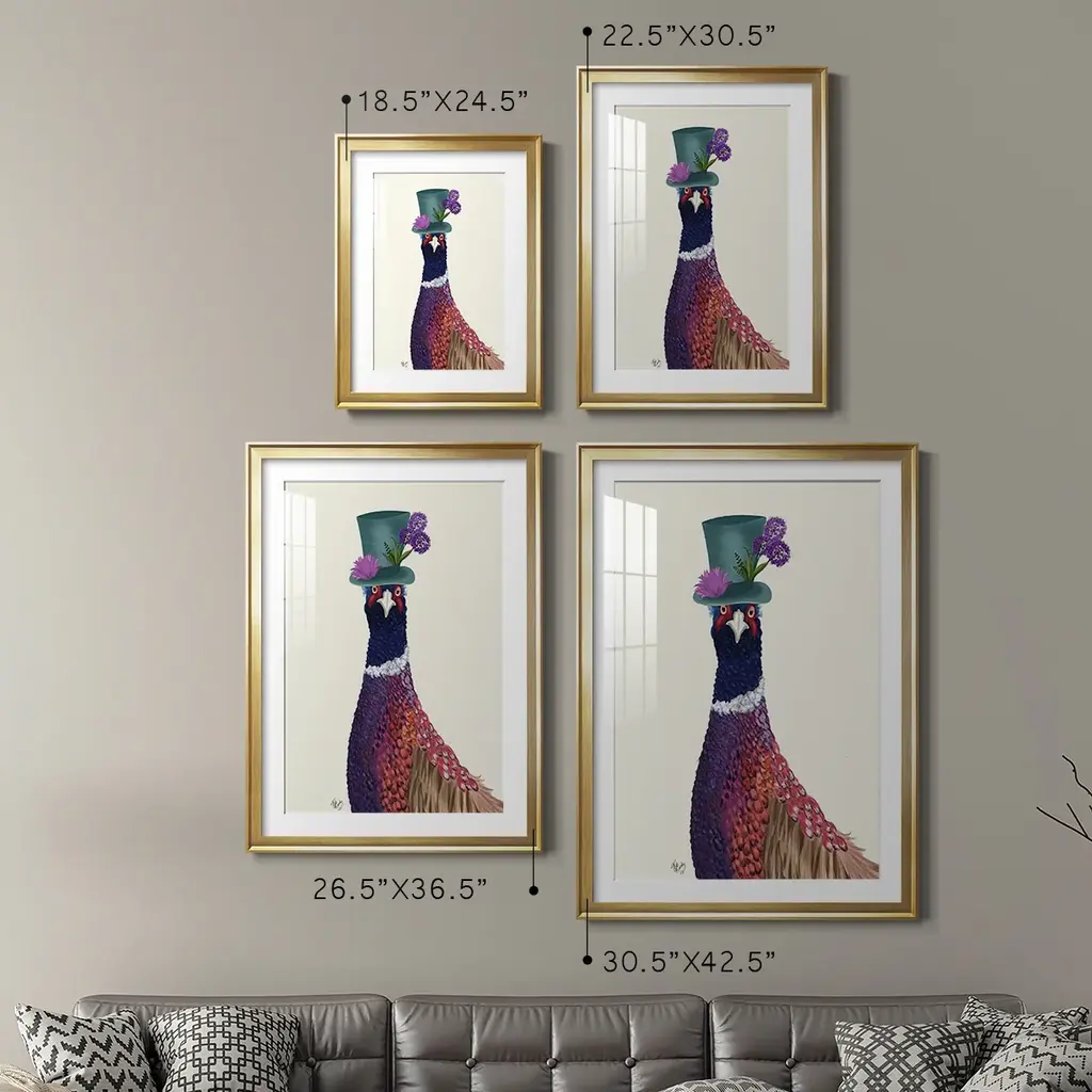 Pheasant in Blue Hat Premium Framed Print - Ready to Hang A Premium Framed Print created to last. Framed in distressed wood and available in an array of sizes and colors Featuring a beveled a solid wood stretcher bar, each piece comes ready to hand 4 SIZES AVAILABLE 30.5''X42.5'' - Overall Size 26.5'X36.5'' - Overall Size 22.5''x30.5'' - Overall Size 18.5''x24.5'' - Overall Size Each piece is made to order. Each piece comes with hanging hardware. Made in the USA Ready to Hang Giclee Paper Print Acrylic Glass Beveled Matt Board