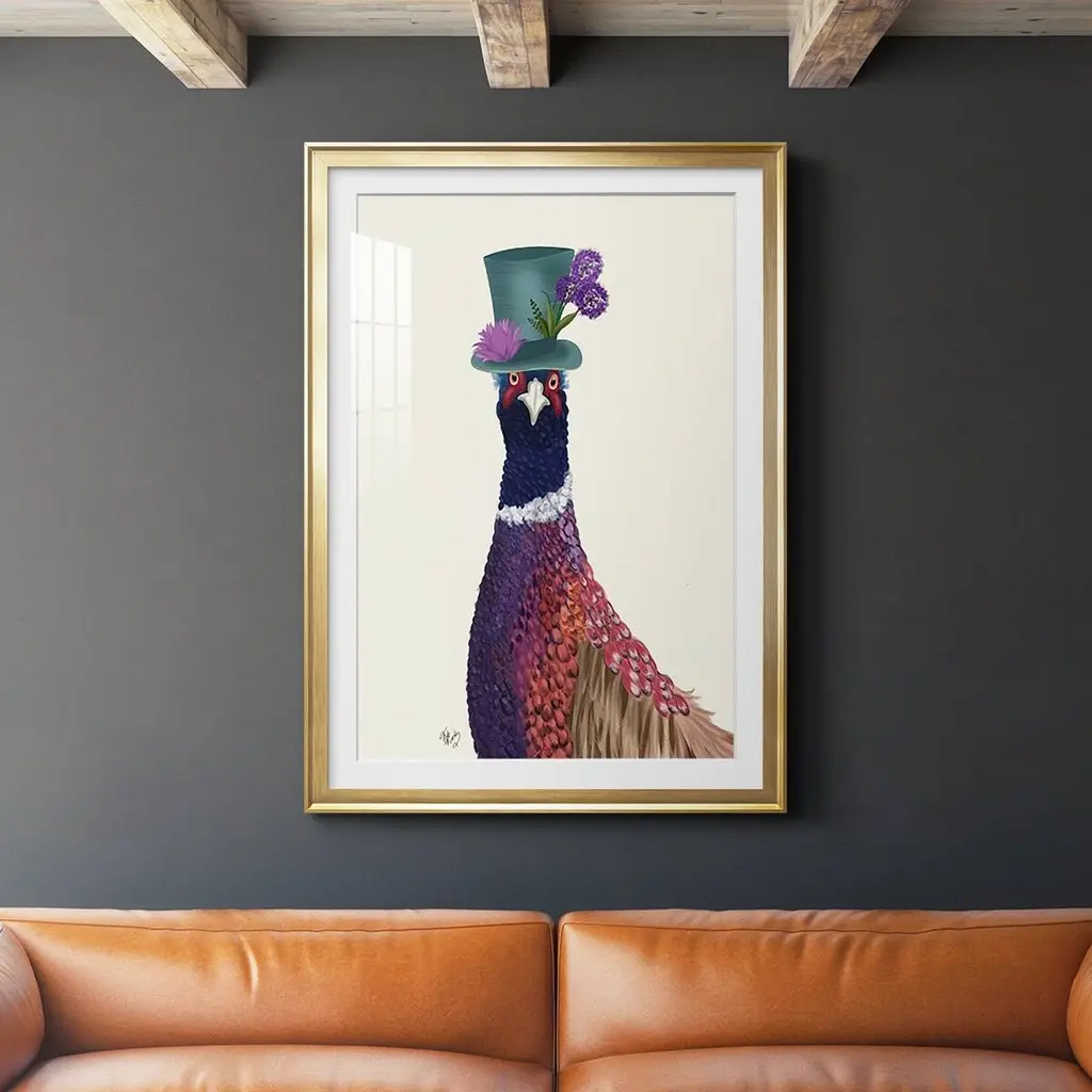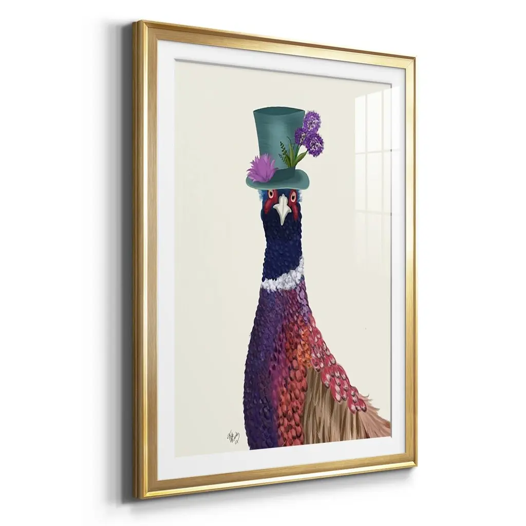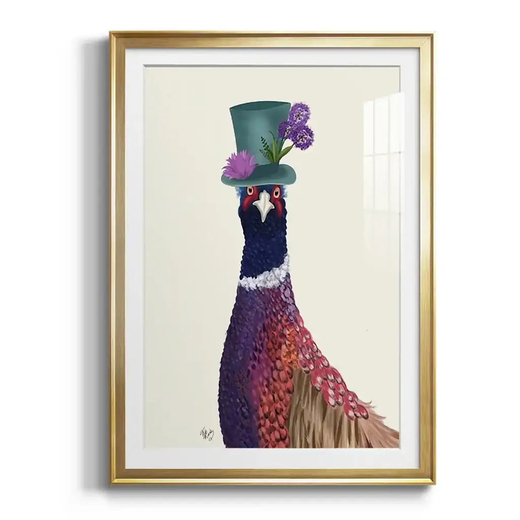 Pheasant in Blue Hat Premium Framed Print - Ready to Hang A Premium Framed Print created to last. Framed in distressed wood and available in an array of sizes and colors Featuring a beveled a solid wood stretcher bar, each piece comes ready to hand 4 SIZES AVAILABLE 30.5''X42.5'' - Overall Size 26.5'X36.5'' - Overall Size 22.5''x30.5'' - Overall Size 18.5''x24.5'' - Overall Size Each piece is made to order. Each piece comes with hanging hardware. Made in the USA Ready to Hang Giclee Paper Print Acrylic Glass Beveled Matt Board