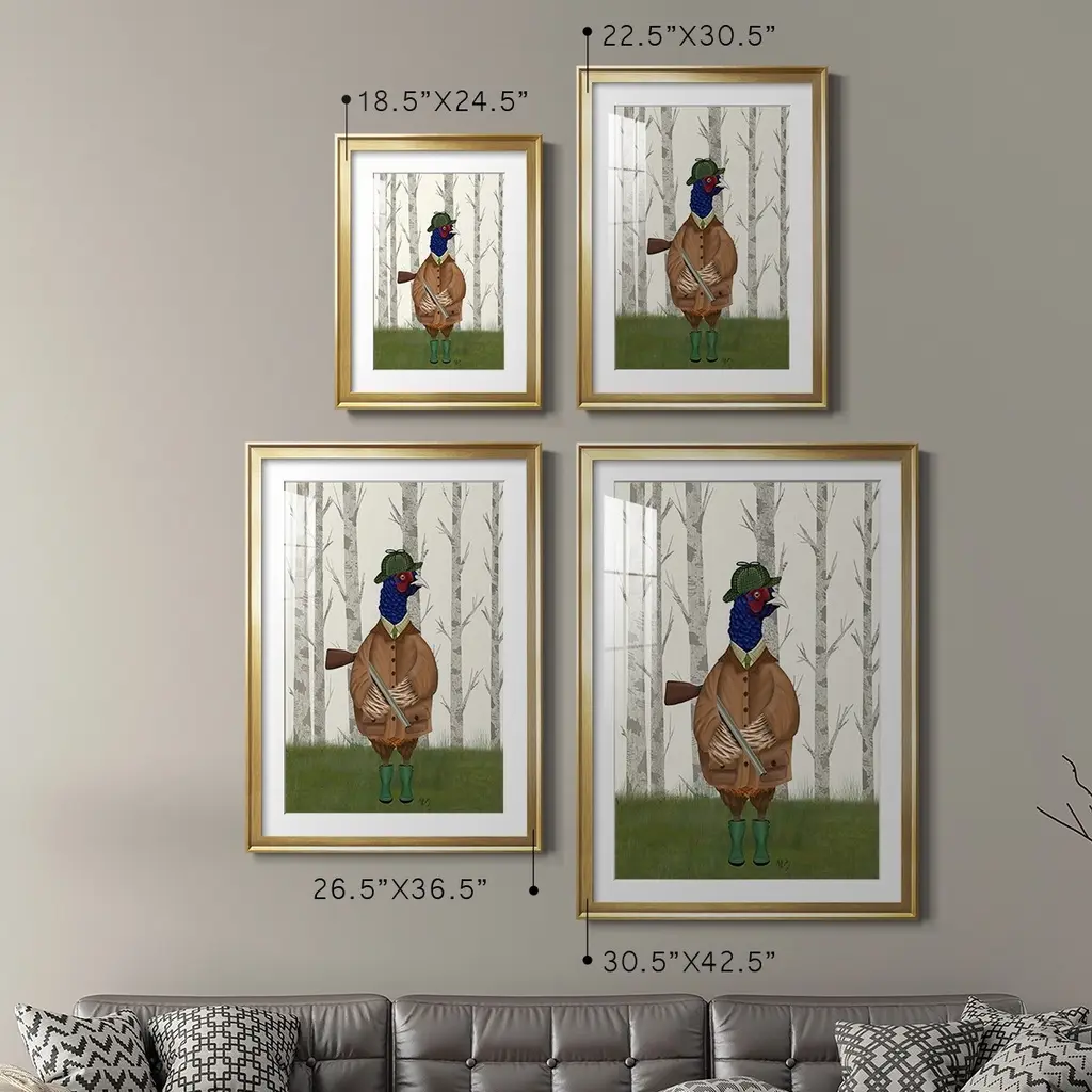 Pheasant Shooting Party 3 Premium Framed Print - Ready to Hang A Premium Framed Print created to last. Framed in distressed wood and available in an array of sizes and colors Featuring a beveled a solid wood stretcher bar, each piece comes ready to hand 4 SIZES AVAILABLE 30.5''X42.5'' - Overall Size 26.5'X36.5'' - Overall Size 22.5''x30.5'' - Overall Size 18.5''x24.5'' - Overall Size Each piece is made to order. Each piece comes with hanging hardware. Made in the USA Ready to Hang Giclee Paper Print Acrylic Glass Beveled Matt Board