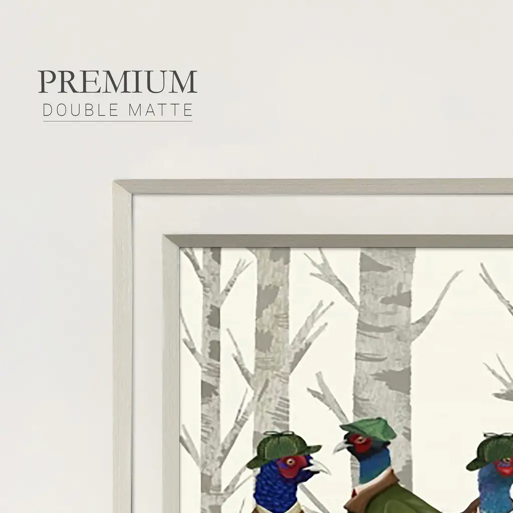 Pheasant Shooting Party Group 3Premium Framed Print A framed cold pressed paper print featuring superior double matting and quality frame. 2 SIZES AVAILABLE 16''X16''' - Overall Size 20''X20''' - Overall Size Each piece is made to order. Each piece comes with hanging hardware. Made in the USA Ready to Hang Giclee Paper Print Plexiglass Beveled Matt Board Double Matte Board