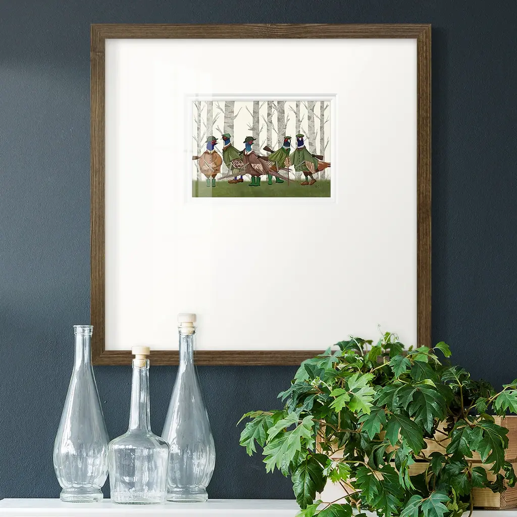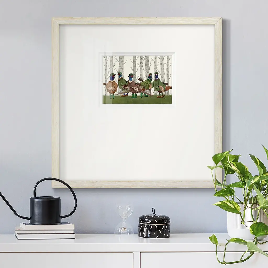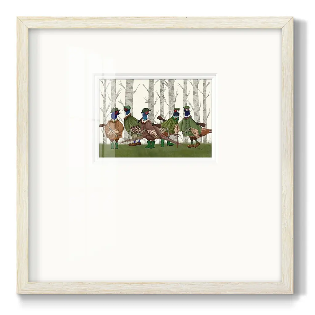 Pheasant Shooting Party Group 3Premium Framed Print A framed cold pressed paper print featuring superior double matting and quality frame. 2 SIZES AVAILABLE 16''X16''' - Overall Size 20''X20''' - Overall Size Each piece is made to order. Each piece comes with hanging hardware. Made in the USA Ready to Hang Giclee Paper Print Plexiglass Beveled Matt Board Double Matte Board