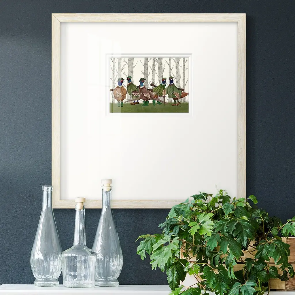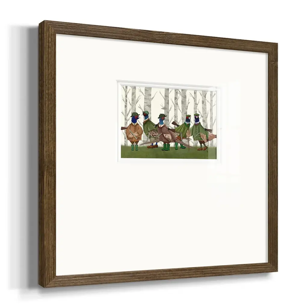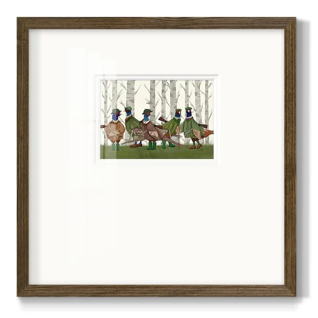 Pheasant Shooting Party Group 3Premium Framed Print A framed cold pressed paper print featuring superior double matting and quality frame. 2 SIZES AVAILABLE 16''X16''' - Overall Size 20''X20''' - Overall Size Each piece is made to order. Each piece comes with hanging hardware. Made in the USA Ready to Hang Giclee Paper Print Plexiglass Beveled Matt Board Double Matte Board