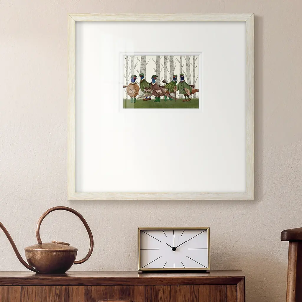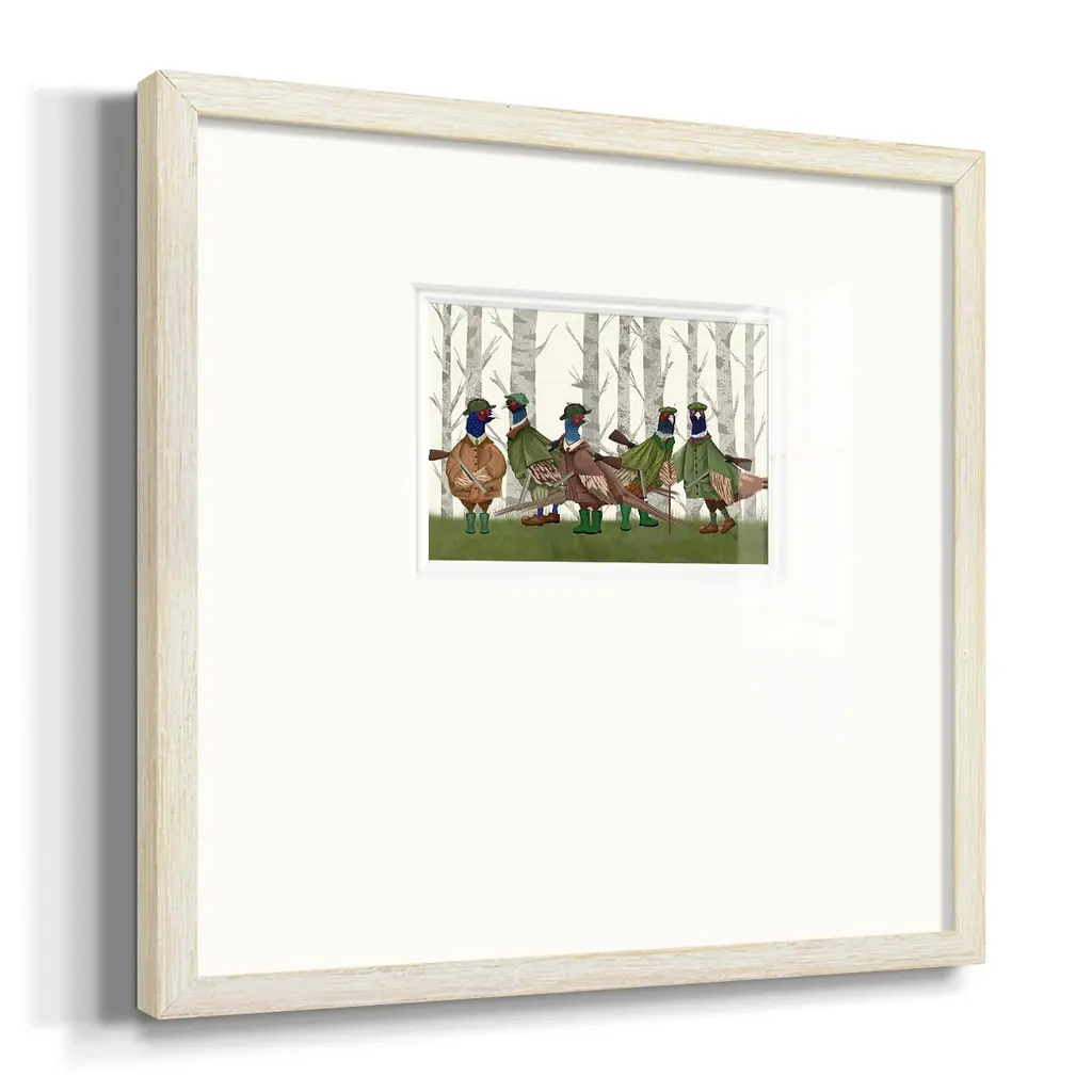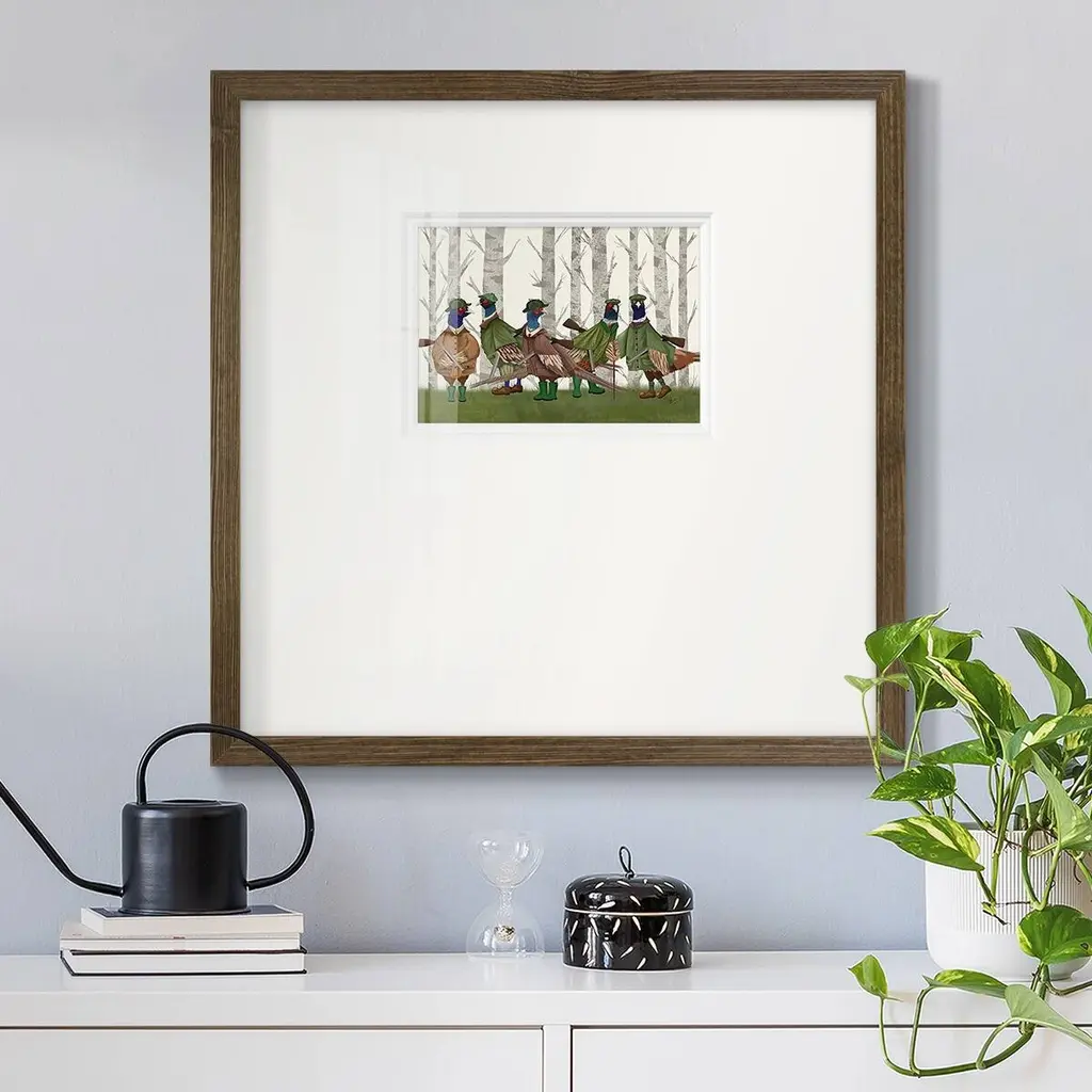 Pheasant Shooting Party Group 3Premium Framed Print A framed cold pressed paper print featuring superior double matting and quality frame. 2 SIZES AVAILABLE 16''X16''' - Overall Size 20''X20''' - Overall Size Each piece is made to order. Each piece comes with hanging hardware. Made in the USA Ready to Hang Giclee Paper Print Plexiglass Beveled Matt Board Double Matte Board