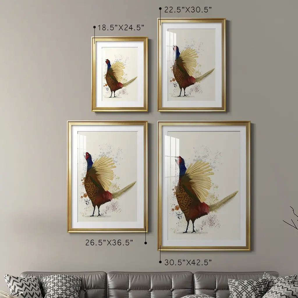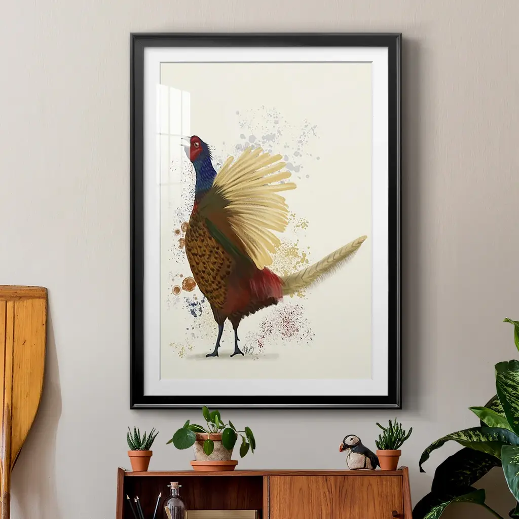 Pheasant Splash 8 Premium Framed Print - Ready to Hang A Premium Framed Print created to last. Framed in distressed wood and available in an array of sizes and colors Featuring a beveled a solid wood stretcher bar, each piece comes ready to hand 4 SIZES AVAILABLE 30.5''X42.5'' - Overall Size 26.5'X36.5'' - Overall Size 22.5''x30.5'' - Overall Size 18.5''x24.5'' - Overall Size Each piece is made to order. Each piece comes with hanging hardware. Made in the USA Ready to Hang Giclee Paper Print Acrylic Glass Beveled Matt Board