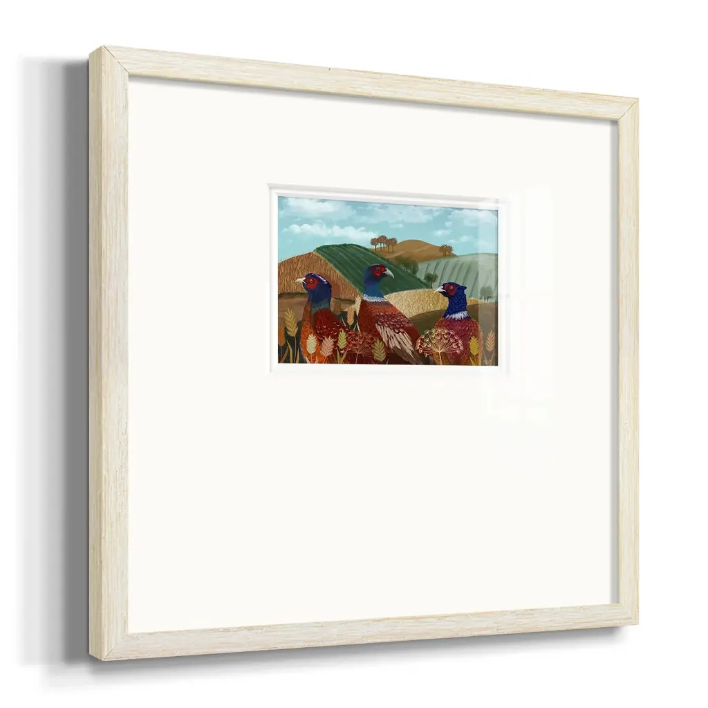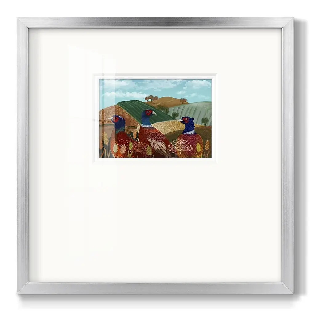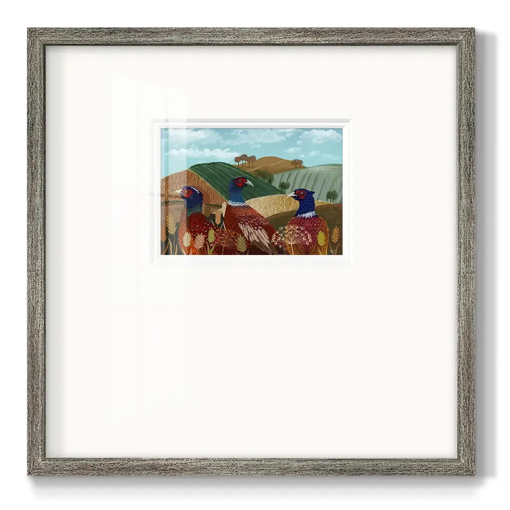 Pheasant Trio in FieldPremium Framed Print A framed cold pressed paper print featuring superior double matting and quality frame. 2 SIZES AVAILABLE 16''X16''' - Overall Size 20''X20''' - Overall Size Each piece is made to order. Each piece comes with hanging hardware. Made in the USA Ready to Hang Giclee Paper Print Plexiglass Beveled Matt Board Double Matte Board