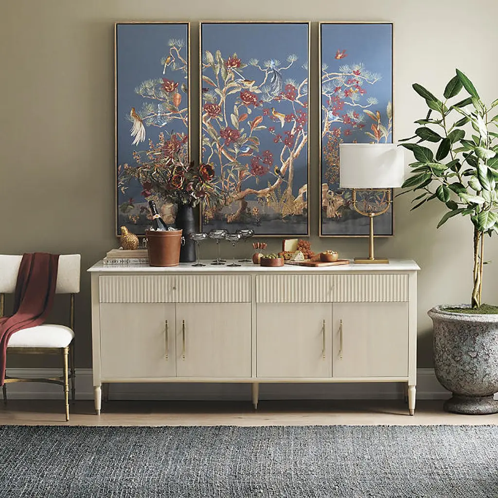 Bring nature-inspired color and movement to a favorite room with art evoking East Asian artistic traditions. Rich stylized colors and textures set atop a stunning blue backdrop for a stylish and cheerful decoration. Designed as a stunning triptych featuring high-quality giclée prints on canvas. High-quality giclée prints on canvas Modern giclée printing methods replicate the artist's original work Wood frames Ready to hang (D-ring hangers) Clean with a soft, dry cloth Made in USA A Frontgate exclusive. At Frontgate, our primary focus is quality. We guarantee that every product we sell will stand up to the supreme test – our customers' satisfaction. To learn more about our policies, visit our Shipping & Processing, Returns & Exchanges and Warranty & Price Guarantee pages. How to Hang Wall Art Single Piece Position the artwork so its center is at eye level, about 60 inches from the floor. If placing above furniture, leave a gap of 4–6 inches between the furniture and the bottom of the frame. Multiple Pieces Consider a pair of or several artworks as a single cohesive display. Center the entire arrangement at eye level, around 60 inches from the floor to the middle of the group, with 2–5 inches between each artwork. Gallery Wall Center the main focus of your gallery wall at eye level, approximately 60 inches from the floor. Space additional frames 2–5 inches apart. Bring nature-inspired color and movement to a favorite room with art evoking East Asian artistic traditions. Rich stylized colors and textures set atop a stunning blue backdrop for a stylish and cheerful decoration. Designed as a stunning triptych featuring high-quality giclée prints on canvas. High-quality giclée prints on canvas Modern giclée printing methods replicate the artist's original work Wood frames Ready to hang (D-ring hangers) Clean with a soft, dry cloth Made in USA A Frontgate exclusive. At Frontgate, our primary focus is quality. We guarantee that every product we sell will stand up to the supreme test – our customers' satisfaction. To learn more about our policies, visit our Shipping & Processing, Returns & Exchanges and Warranty & Price Guarantee pages. How to Hang Wall Art Single Piece Position the artwork so its center is at eye level, about 60 inches from the floor. If placing above furniture, leave a gap of 4–6 inches between the furniture and the bottom of the frame. Multiple Pieces Consider a pair of or several artworks as a single cohesive display. Center the entire arrangement at eye level, around 60 inches from the floor to the middle of the group, with 2–5 inches between each artwork. Gallery Wall Center the main focus of your gallery wall at eye level, approximately 60 inches from the floor. Space additional frames 2–5 inches apart. How to Hang Wall Art Single Piece Position the artwork so its center is at eye level, about 60 inches from the floor. If placing above furniture, leave a gap of 4–6 inches between the furniture and the bottom of the frame. Multiple Pieces Consider a pair of or several artworks as a single cohesive display. Center the entire arrangement at eye level, around 60 inches from the floor to the middle of the group, with 2–5 inches between each artwork. Gallery Wall Center the main focus of your gallery wall at eye level, approximately 60 inches from the floor. Space additional frames 2–5 inches apart. How to Hang Wall Art How to Hang Wall Art Single Piece Position the artwork so its center is at eye level, about 60 inches from the floor. If placing above furniture, leave a gap of 4–6 inches between the furniture and the bottom of the frame. Multiple Pieces Consider a pair of or several artworks as a single cohesive display. Center the entire arrangement at eye level, around 60 inches from the floor to the middle of the group, with 2–5 inches between each artwork. Gallery Wall Center the main focus of your gallery wall at eye level, approximately 60 inches from the floor. Space additional frames 2–5 inches apart. Single Piece Position the artwork so its center is at eye level, about 60 inches from the floor. If placing above furniture, leave a gap of 4–6 inches between the furniture and the bottom of the frame. Multiple Pieces Consider a pair of or several artworks as a single cohesive display. Center the entire arrangement at eye level, around 60 inches from the floor to the middle of the group, with 2–5 inches between each artwork. Gallery Wall Center the main focus of your gallery wall at eye level, approximately 60 inches from the floor. Space additional frames 2–5 inches apart.