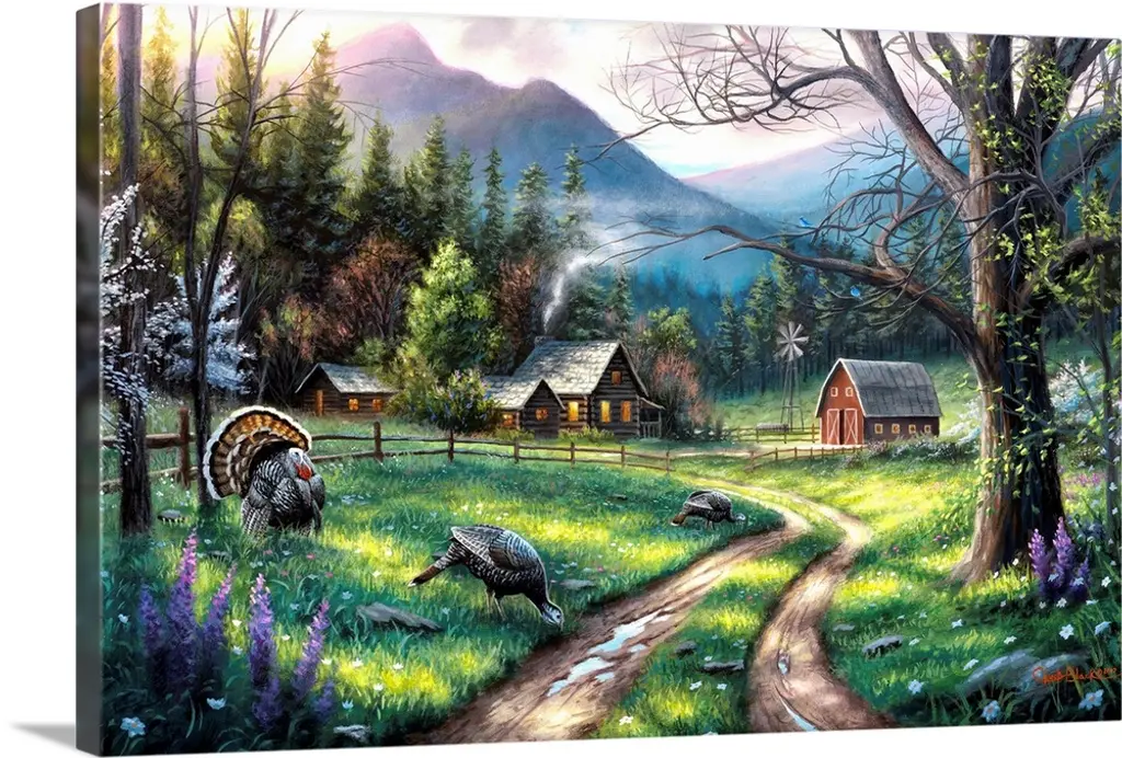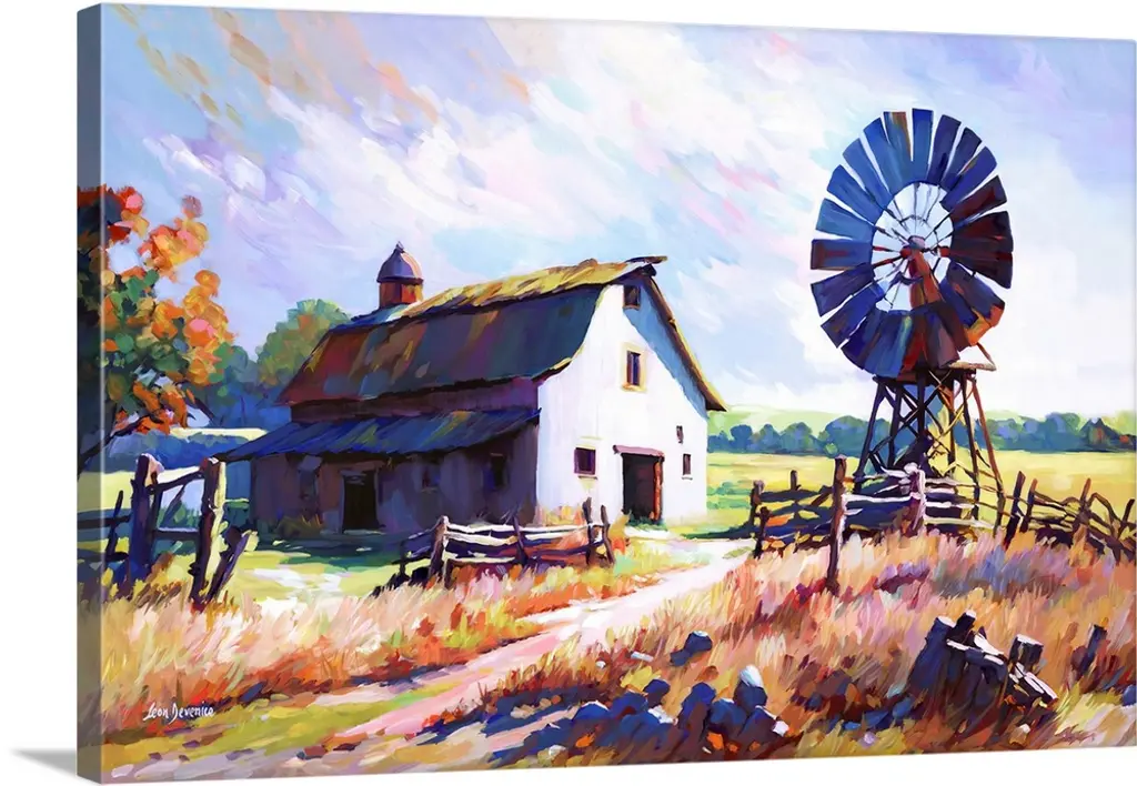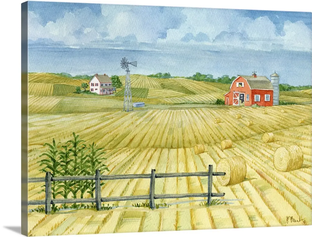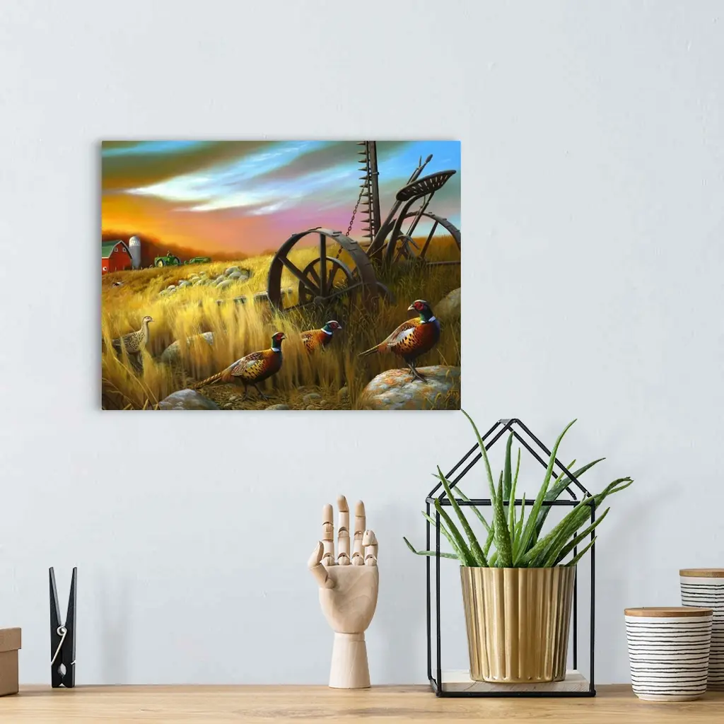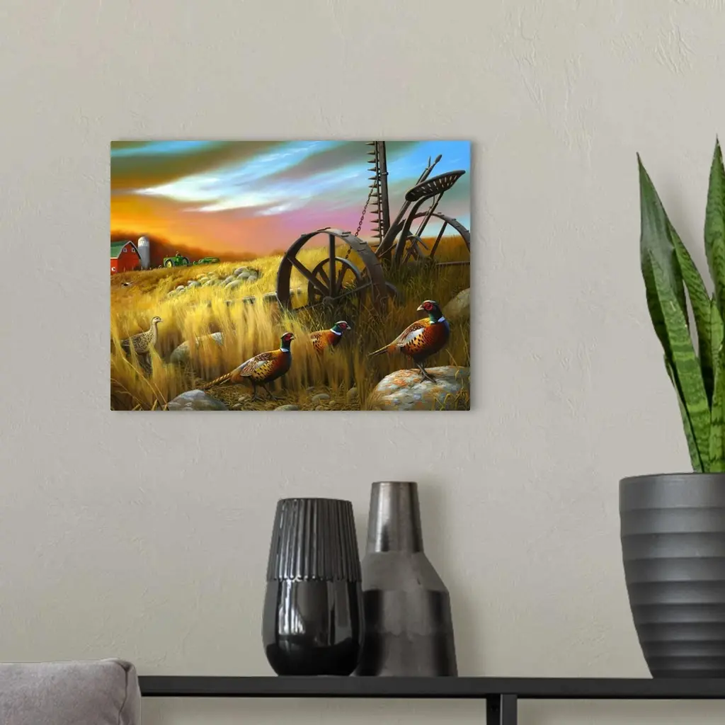 A piece of contemporary artwork of a farm with the barn and a tractor in the background and pheasants drawn in the foreground.