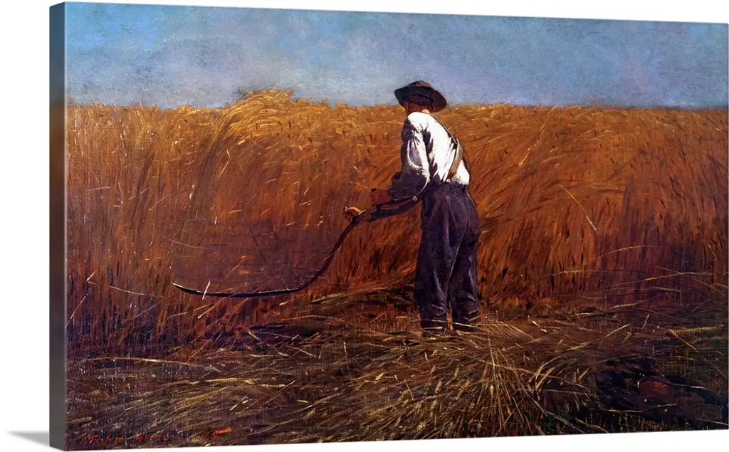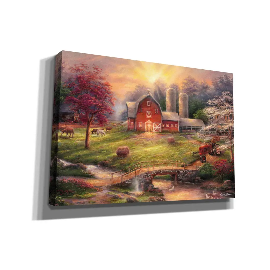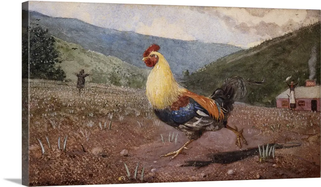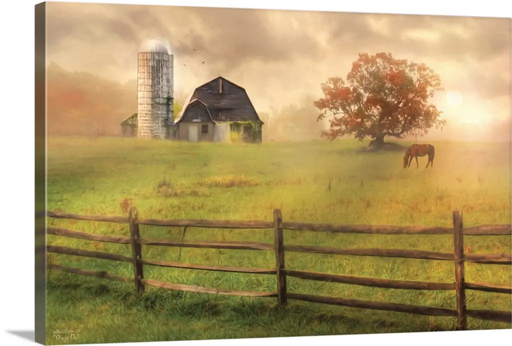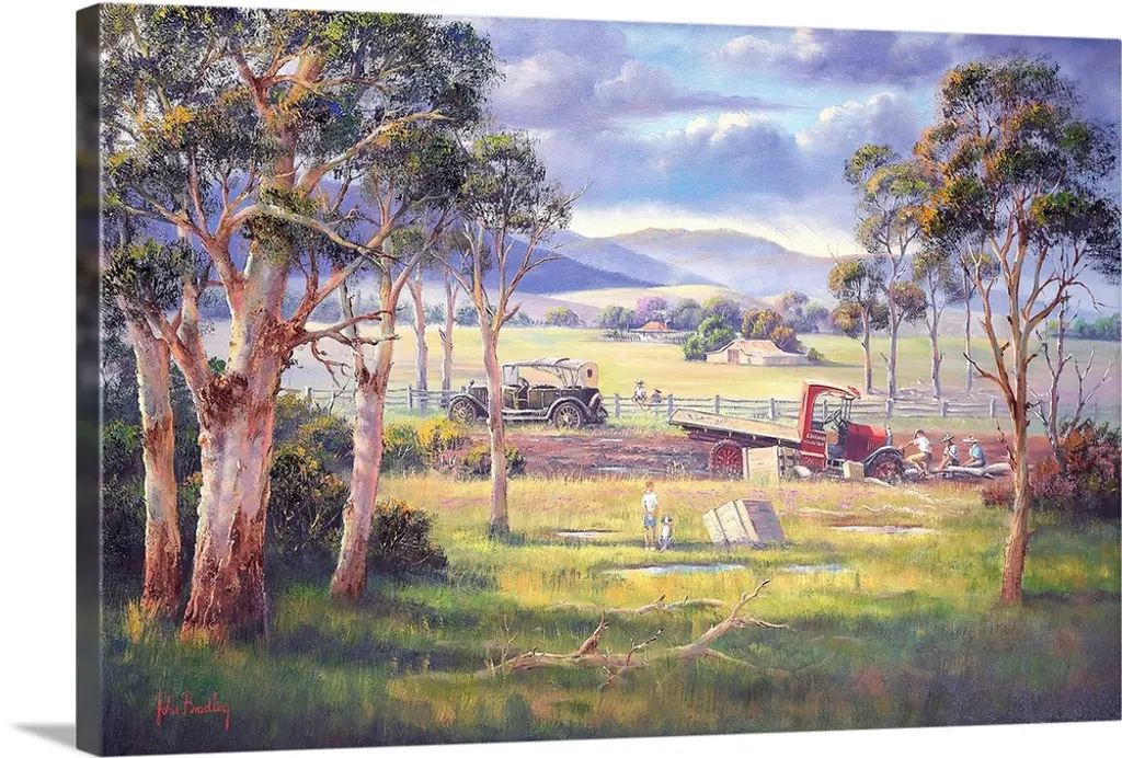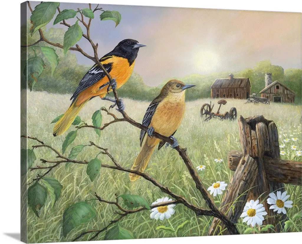 A piece of contemporary artwork of a farm with the barn and a tractor in the background and pheasants drawn in the foreground.