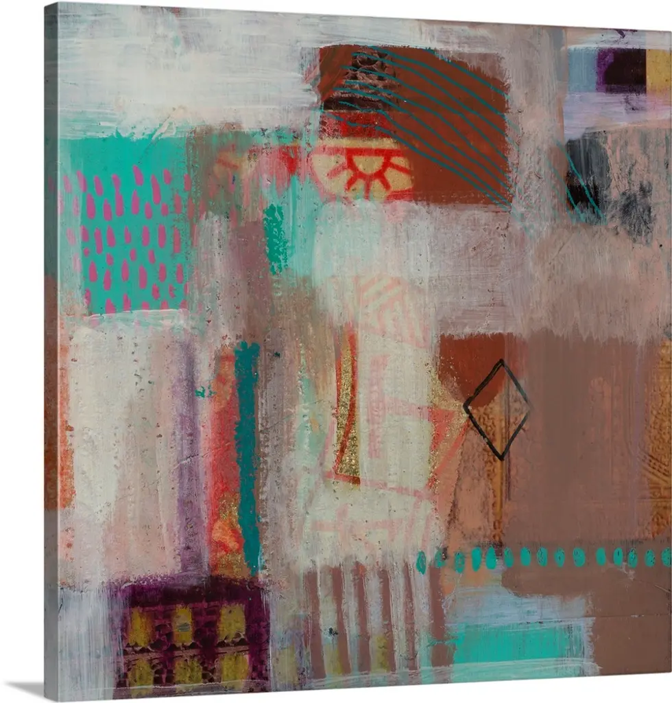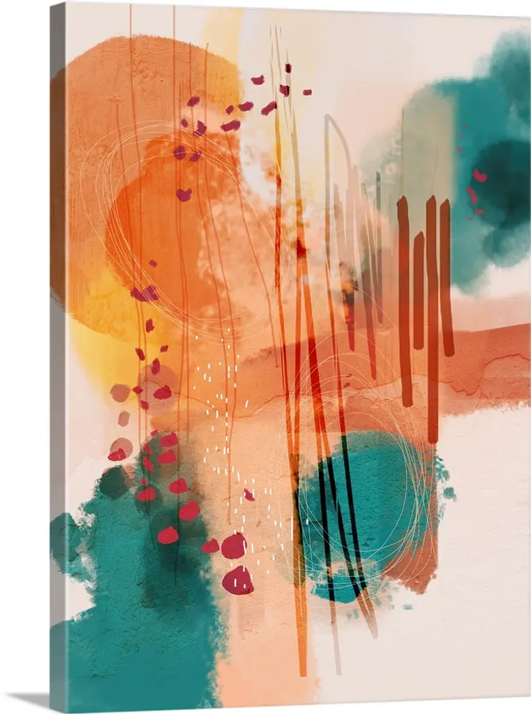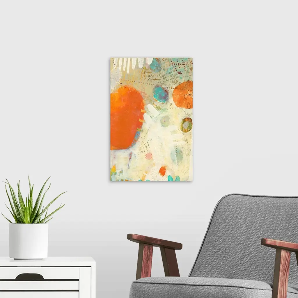 Mod abstract artwork in bright orange, teal, and off-white.