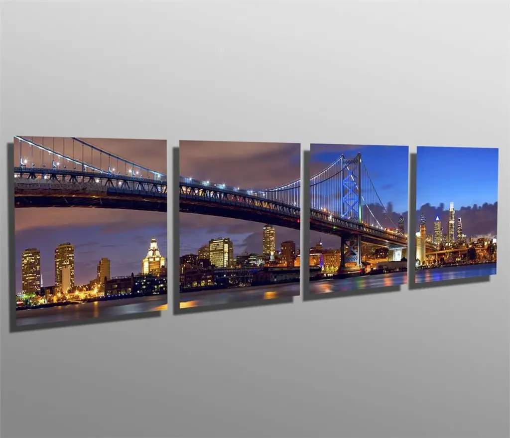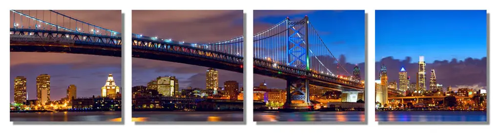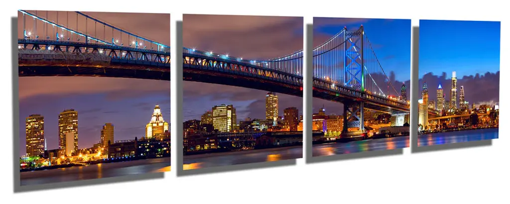 80"œ x 20"œ total size. Ready To Hang! (4 pieces - 20"œ x 20"œ each). 4 Panel Split, Panoramic Metal Print of Philadelphia Skyline & Ben Franklin bridge on Delaware river. Modern metal wall art for home or office wall decor & interior design. Printed on Luxurious, HD aluminum glossy metal panels. Multi panel art.. HD aluminum panels. Metal print wall art. Includes Shadow Wall Mount on the back.• Aluminum Metal Wall Art• Made in USA• Ready to hang - No assembly required• Shadow mount hardware on the back• 0.045"œ thick HD Aluminum Panels• Scratch resistant, glossy finish• Superb color clarity, luxurious prints• Epson printing process• For indoor or moisture rich environment use• Easy to clean. Gently wipe with microfiber cloth.