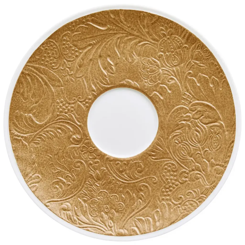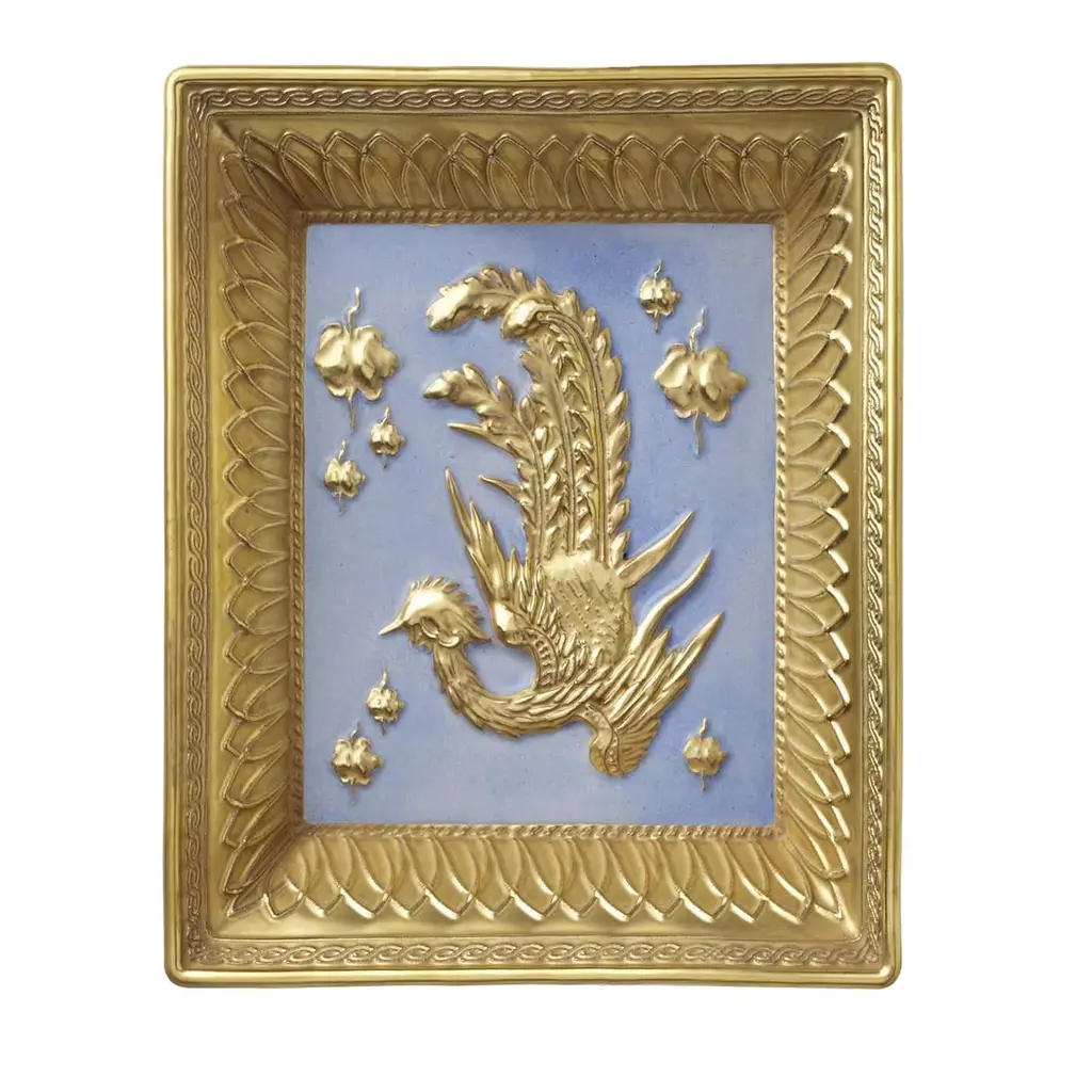 A regal phoenix, a mythological symbol of re-birth, graces the surface of this elegant vide poche. A true work of art, this piece is crafted of fine porcelain and adorned with a royal blue background to create a unique contrast with the precious 24k gold of the central scene and of the splendid rim with its textured decorations.