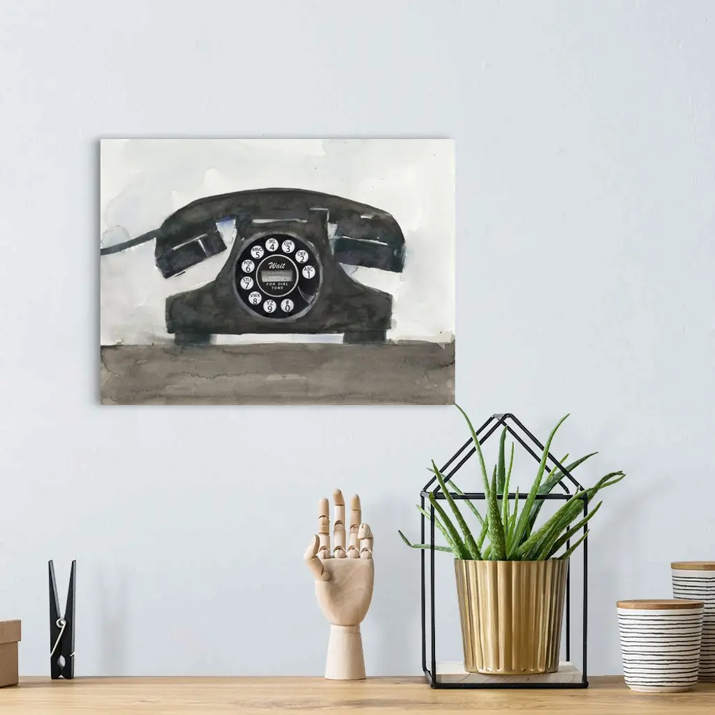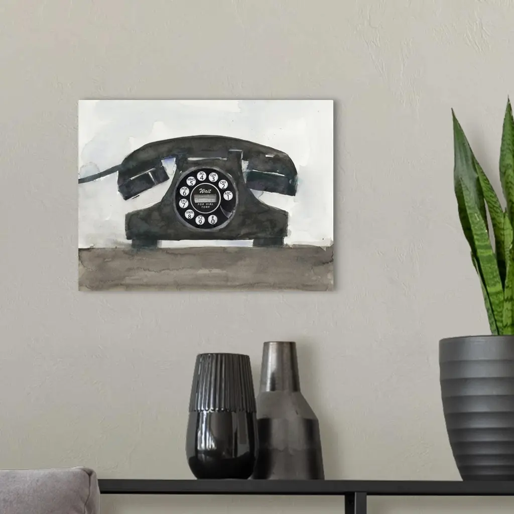 Decorative painting of a black old telephone with a circular dial pad.