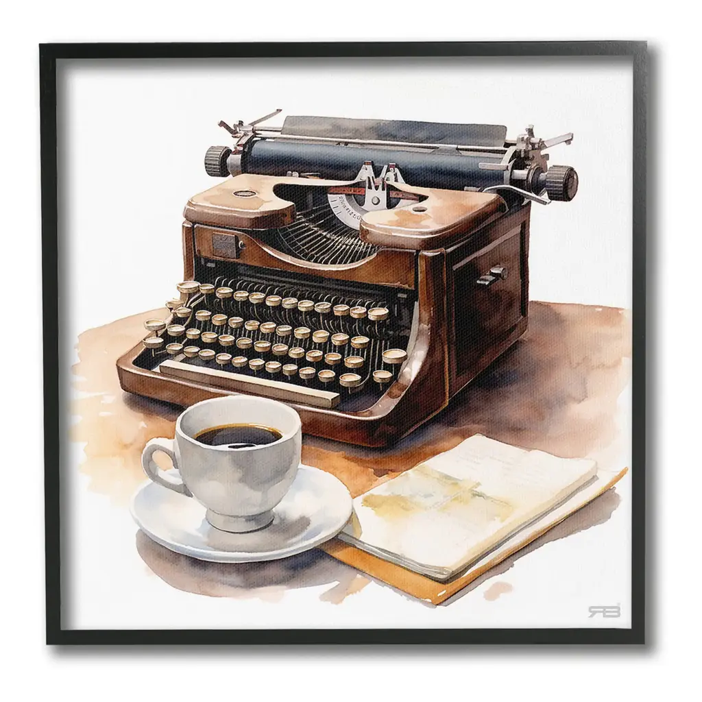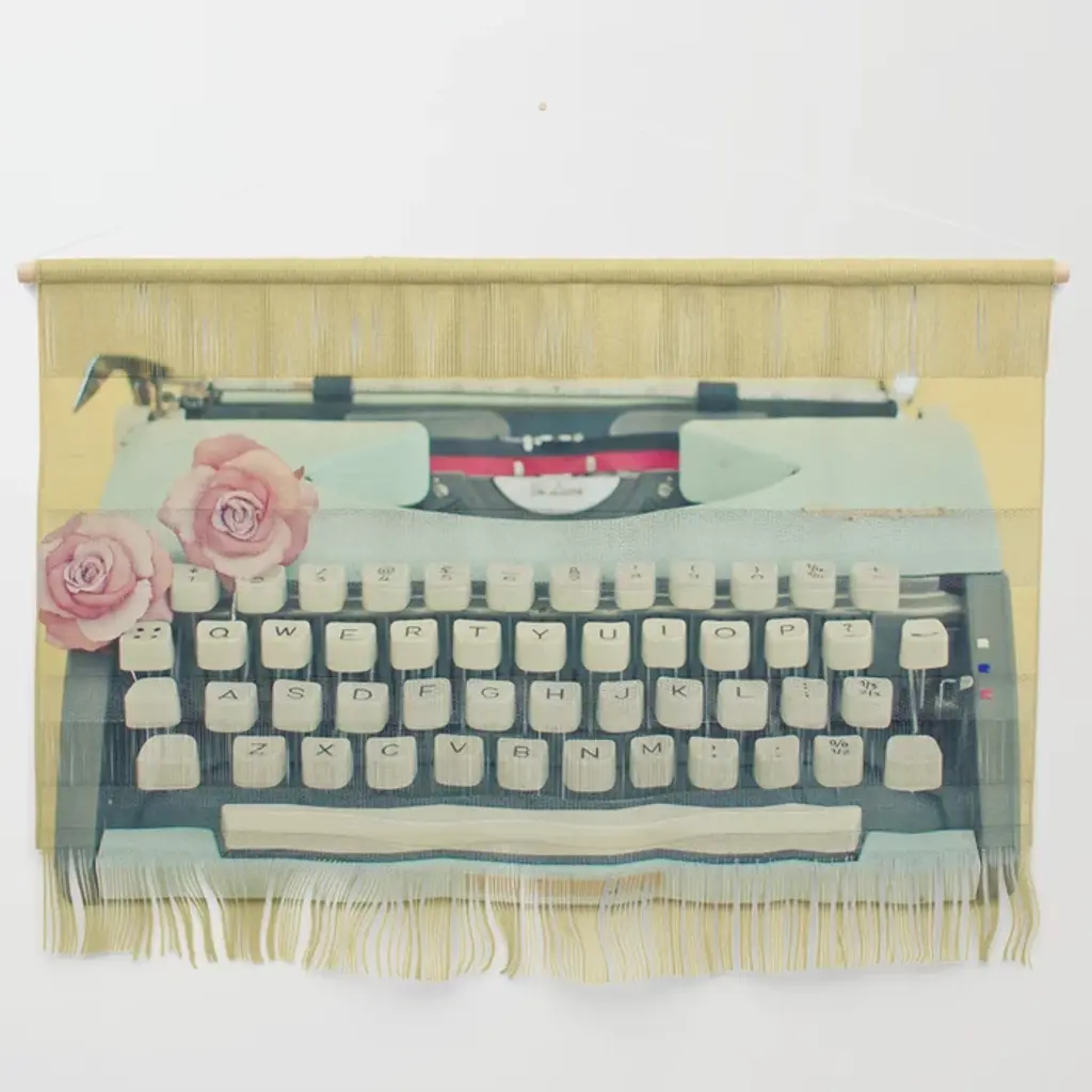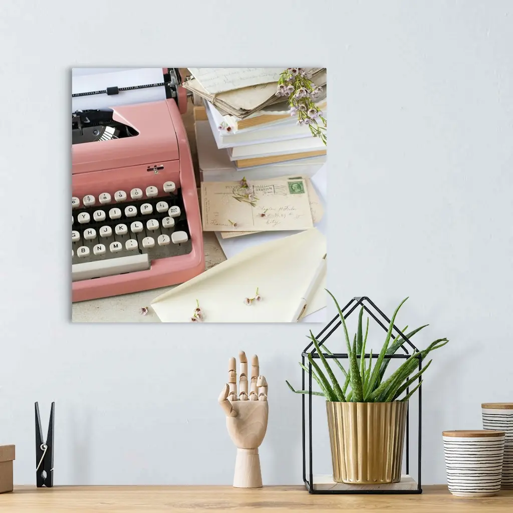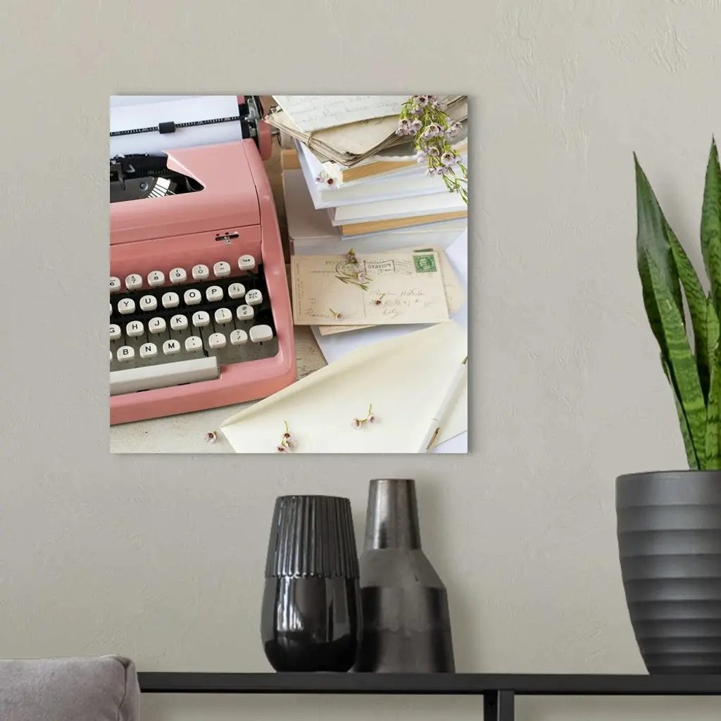 A pink typewriter surrounded by old books, letters and dried flowers in this square shaped, decorative photo art.