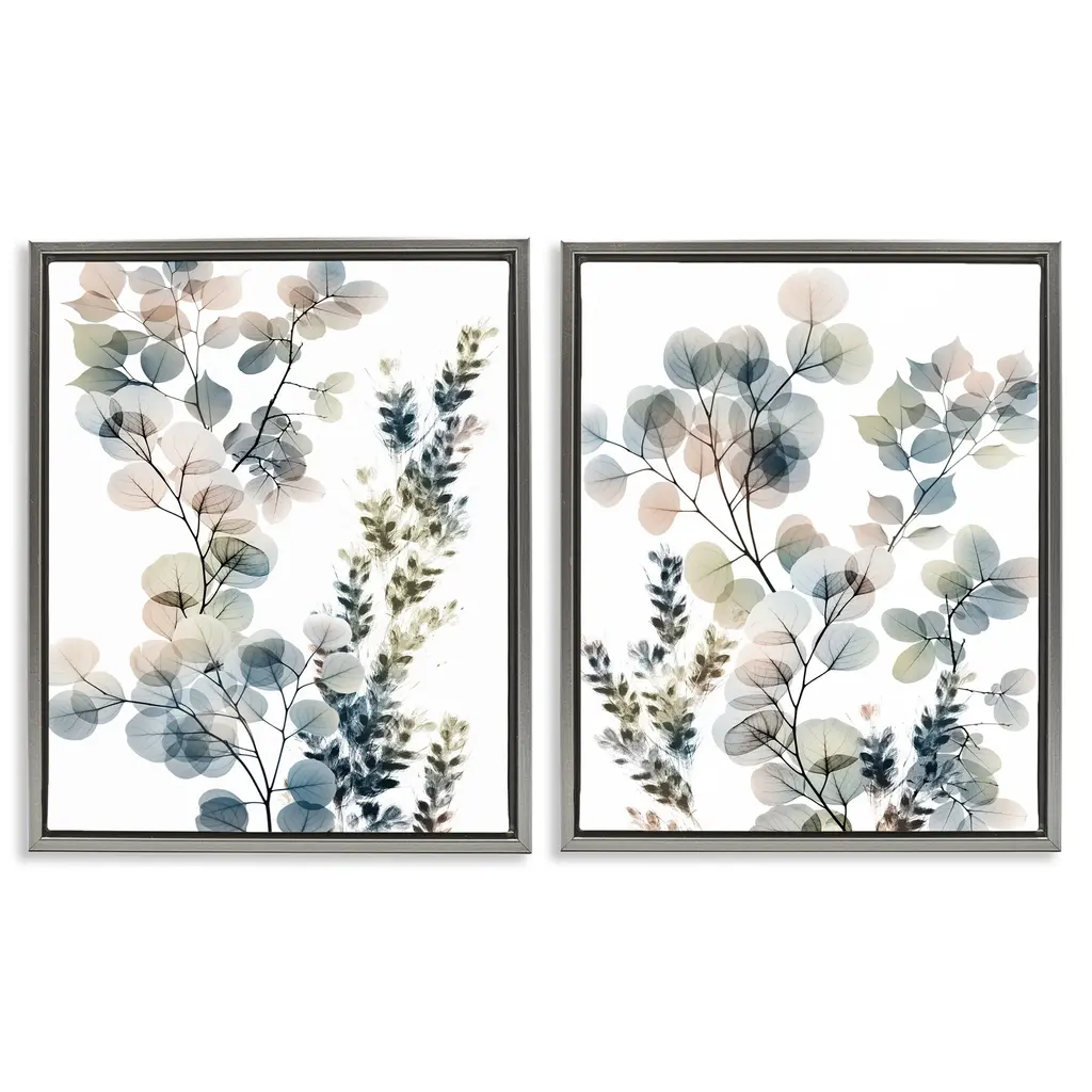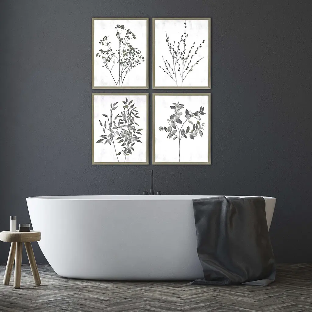 Stark florals are framed in a sleek champagne gold wood moulding.
