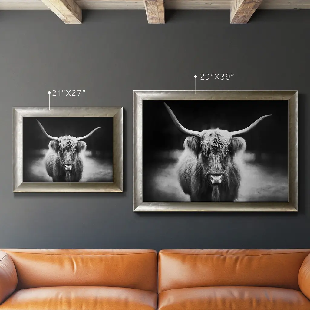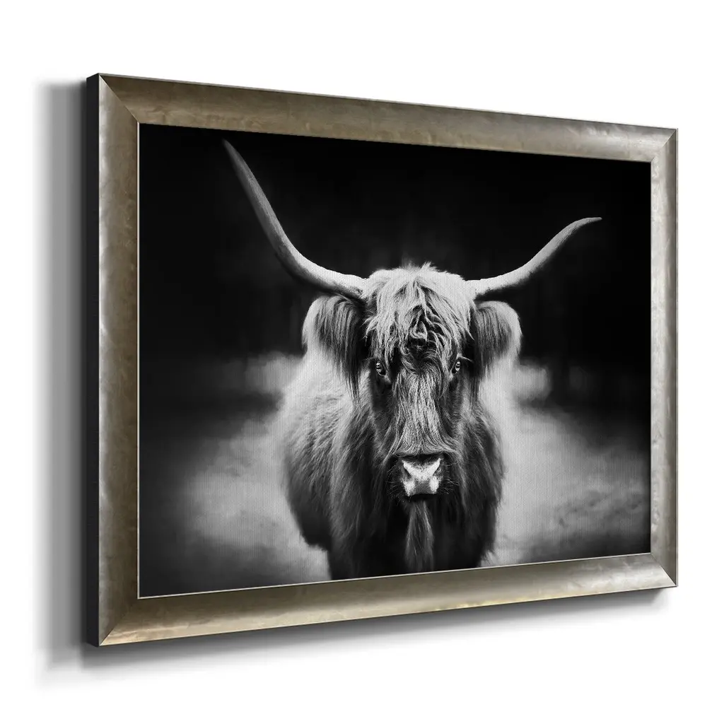 Photography Study Highland Cattle Premium Framed Canvas- Ready to Hang A Premium Framed Canvas created to last. Framed in distressed wood and available in an array of sizes and colors Featuring a beveled a solid wood stretcher bar, each piece comes ready to hand 3 SIZES AVAILABLE 16''X20'' - Overall Size 18'X27'' - Overall Size 24''x36'' - Overall Size Each piece is made to order. Each piece comes with hanging hardware. Made in the USA Ready to Hang Giclee Paper Print Acrylic Glass Beveled Matt Board