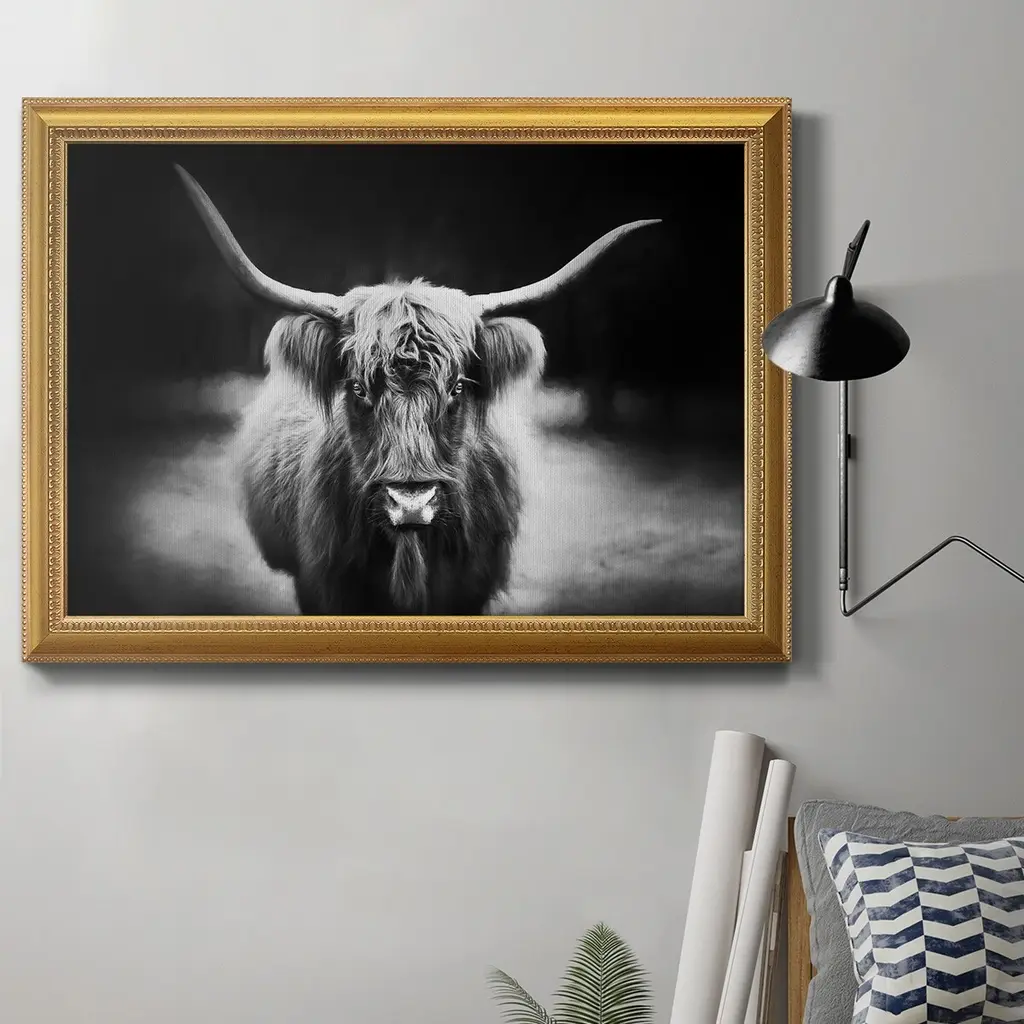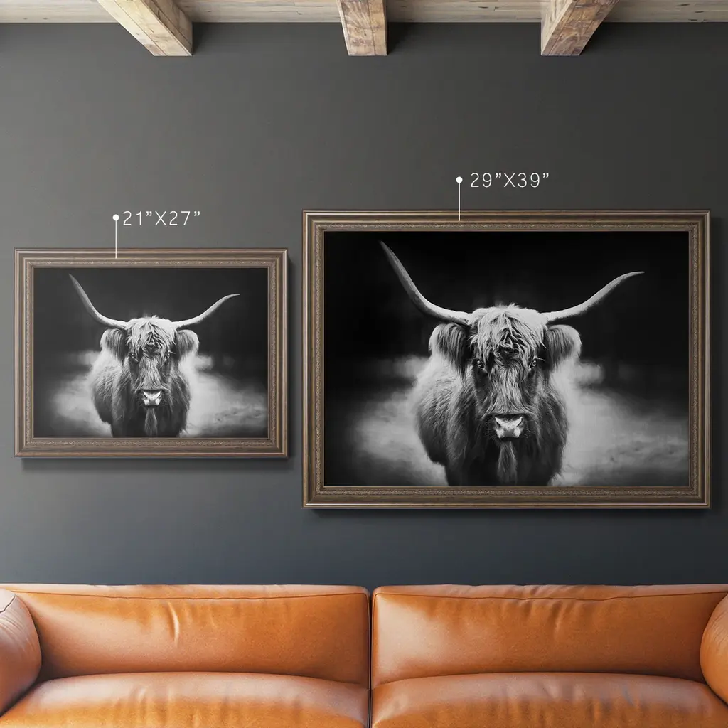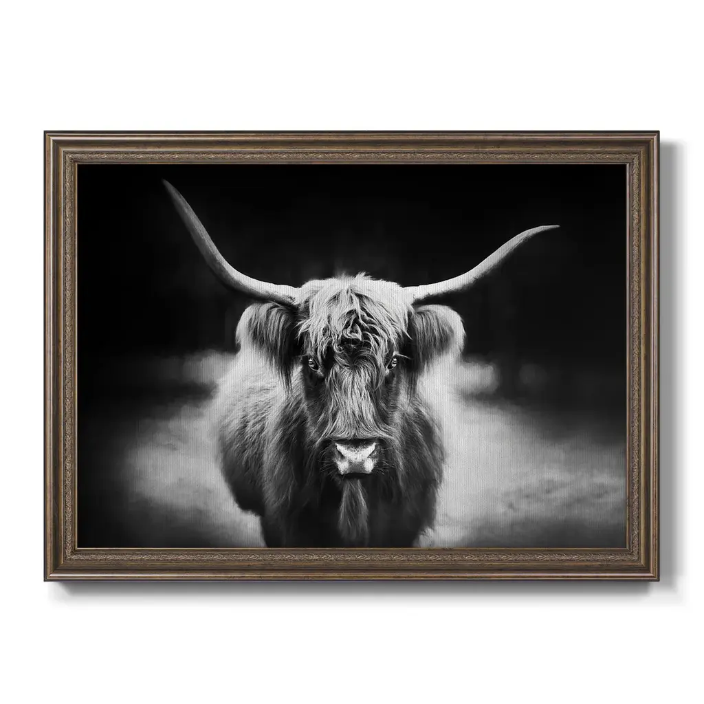 Photography Study Highland Cattle Premium Framed Canvas- Ready to Hang A Premium Framed Canvas created to last. Framed in distressed wood and available in an array of sizes and colors Featuring a beveled a solid wood stretcher bar, each piece comes ready to hand 3 SIZES AVAILABLE 16''X20'' - Overall Size 18'X27'' - Overall Size 24''x36'' - Overall Size Each piece is made to order. Each piece comes with hanging hardware. Made in the USA Ready to Hang Giclee Paper Print Acrylic Glass Beveled Matt Board