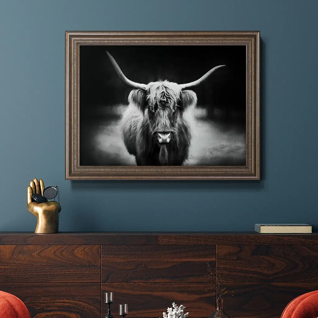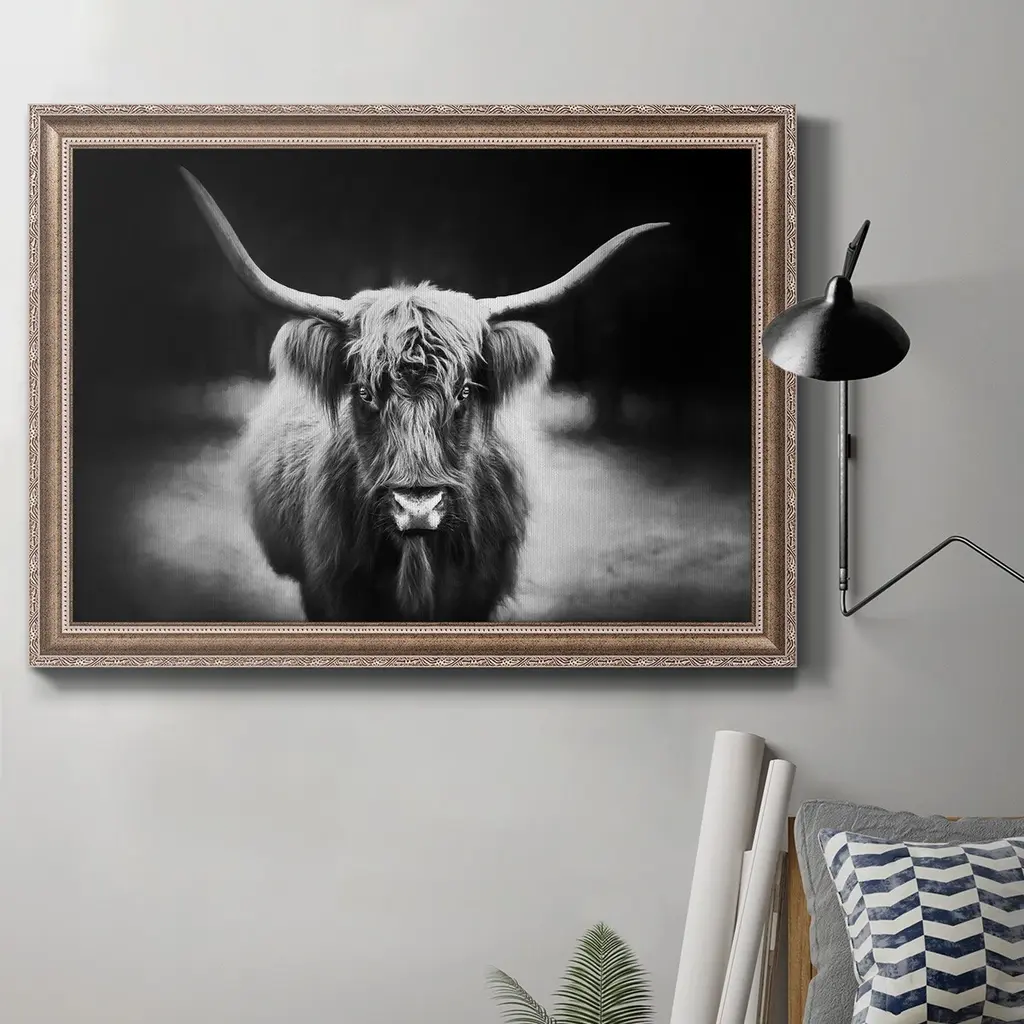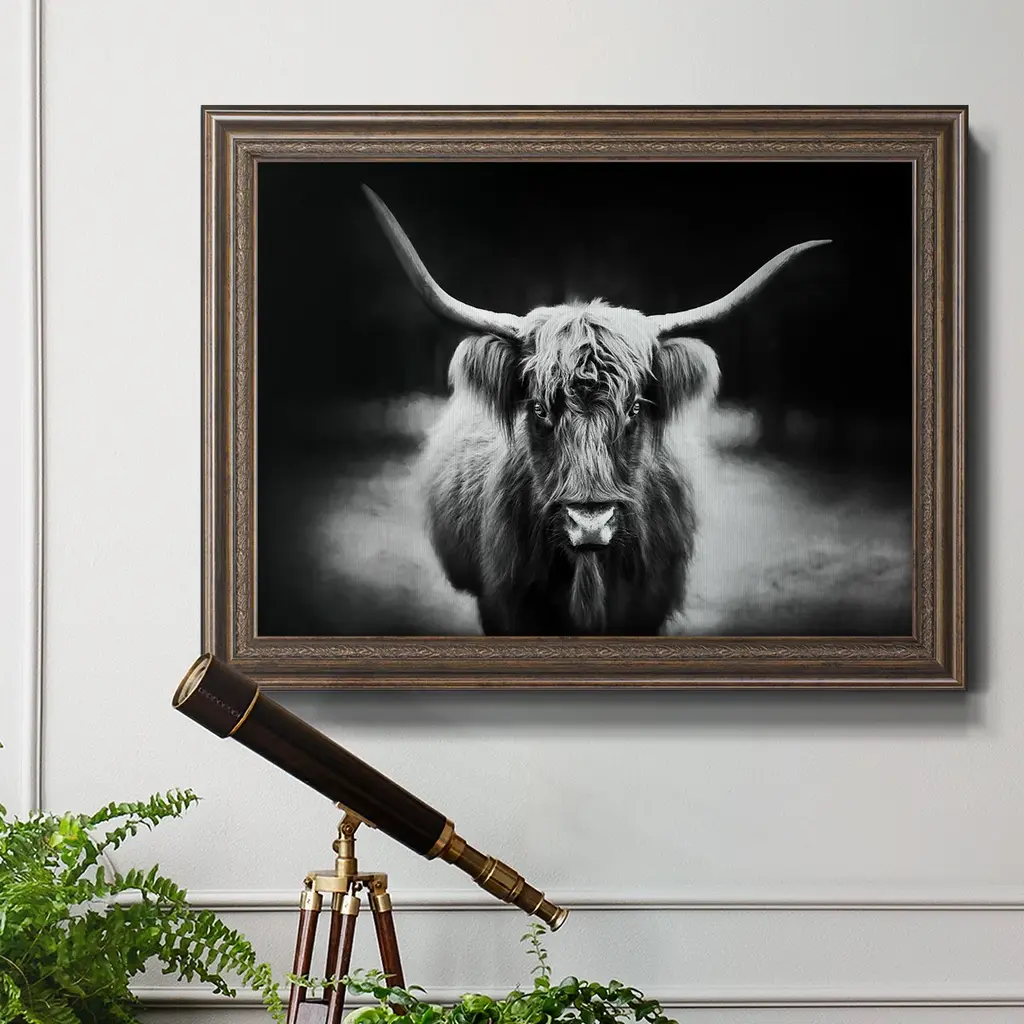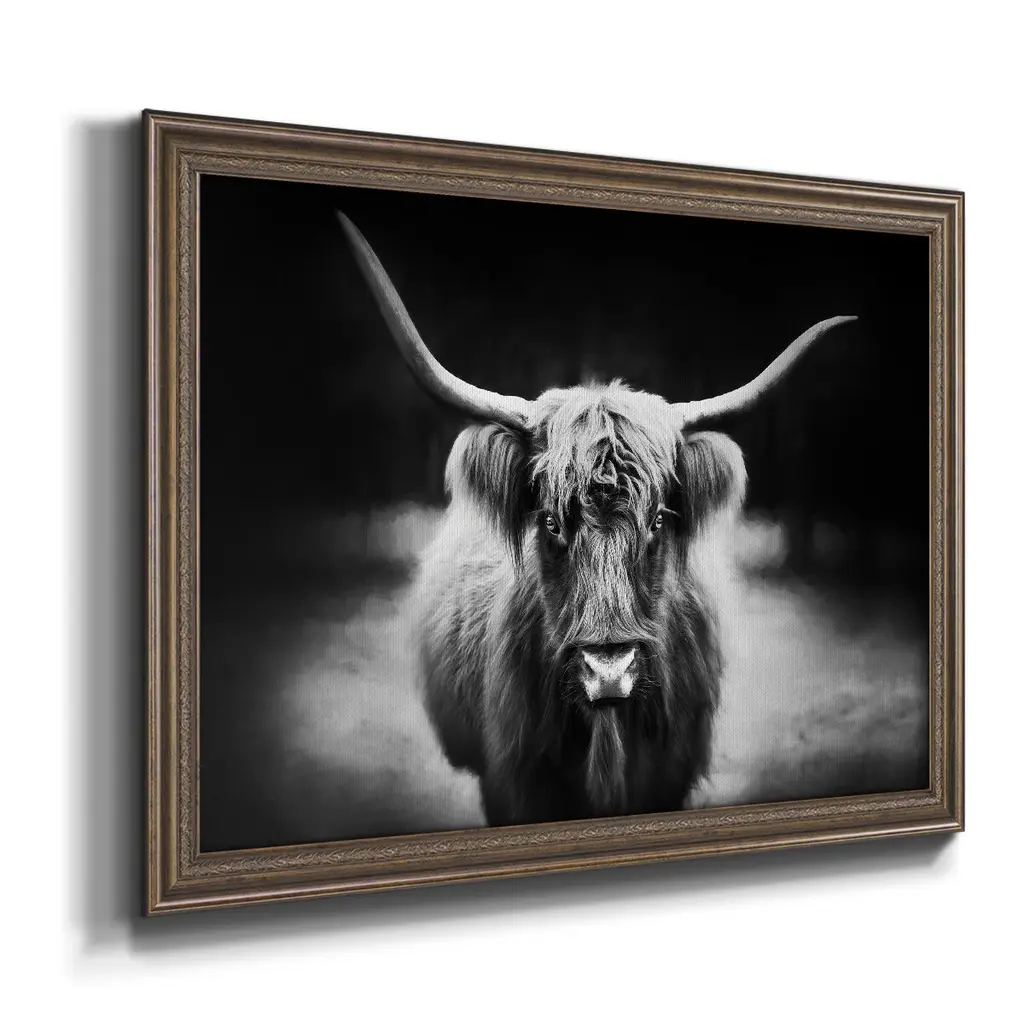Photography Study Highland Cattle Premium Framed Canvas- Ready to Hang A Premium Framed Canvas created to last. Framed in distressed wood and available in an array of sizes and colors Featuring a beveled a solid wood stretcher bar, each piece comes ready to hand 3 SIZES AVAILABLE 16''X20'' - Overall Size 18'X27'' - Overall Size 24''x36'' - Overall Size Each piece is made to order. Each piece comes with hanging hardware. Made in the USA Ready to Hang Giclee Paper Print Acrylic Glass Beveled Matt Board