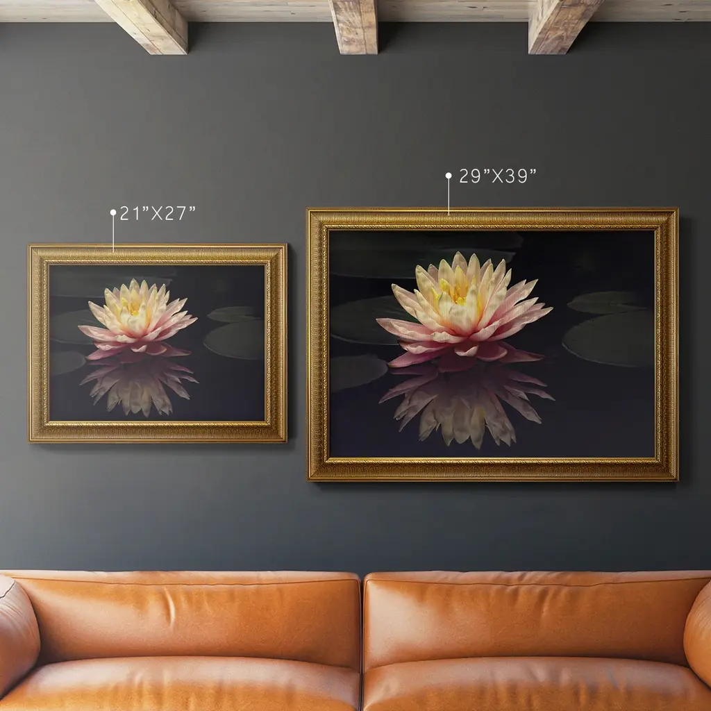 Photography Study Water Lily Premium Framed Canvas- Ready to Hang A Premium Framed Canvas created to last. Framed in distressed wood and available in an array of sizes and colors Featuring a beveled a solid wood stretcher bar, each piece comes ready to hand 3 SIZES AVAILABLE 16''X20'' - Overall Size 18'X27'' - Overall Size 24''x36'' - Overall Size Each piece is made to order. Each piece comes with hanging hardware. Made in the USA Ready to Hang Giclee Paper Print Acrylic Glass Beveled Matt Board