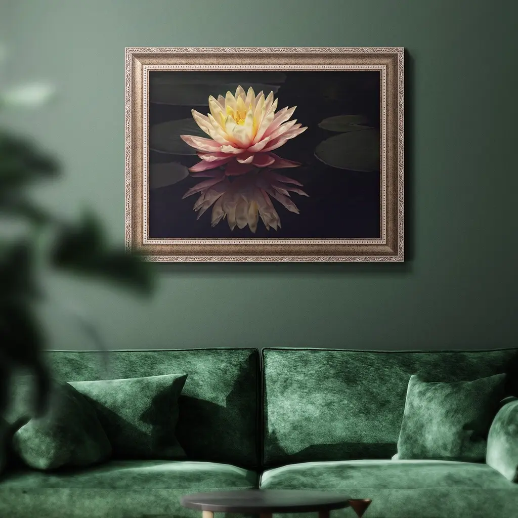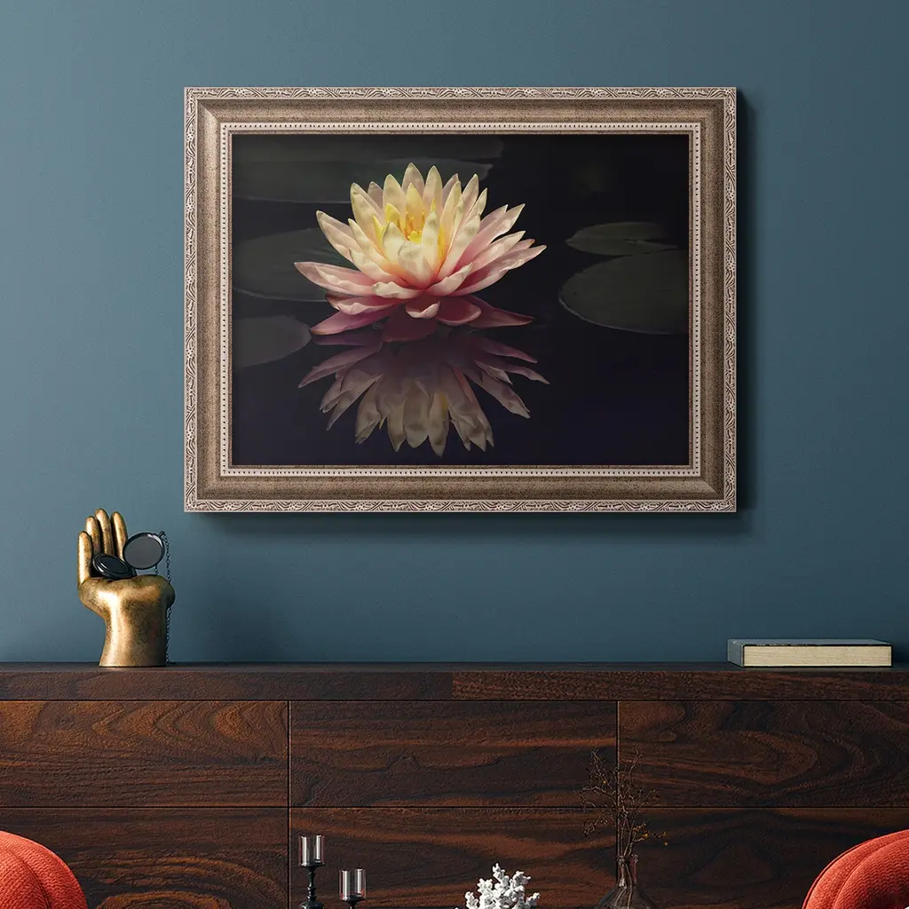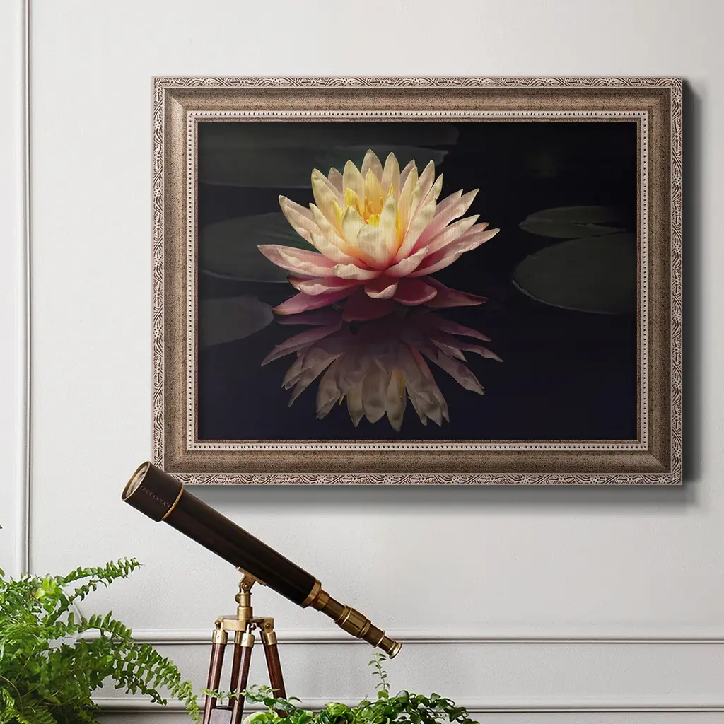 Photography Study Water Lily Premium Framed Canvas- Ready to Hang A Premium Framed Canvas created to last. Framed in distressed wood and available in an array of sizes and colors Featuring a beveled a solid wood stretcher bar, each piece comes ready to hand 3 SIZES AVAILABLE 16''X20'' - Overall Size 18'X27'' - Overall Size 24''x36'' - Overall Size Each piece is made to order. Each piece comes with hanging hardware. Made in the USA Ready to Hang Giclee Paper Print Acrylic Glass Beveled Matt Board