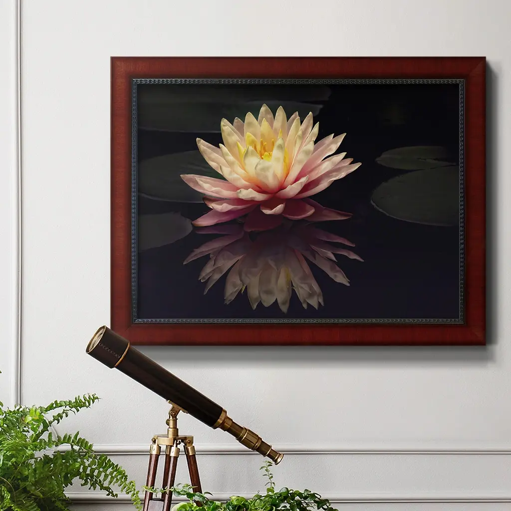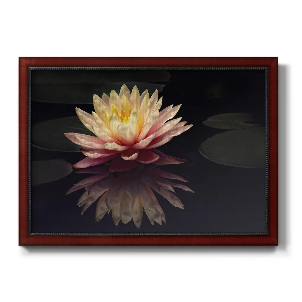 Photography Study Water Lily Premium Framed Canvas- Ready to Hang A Premium Framed Canvas created to last. Framed in distressed wood and available in an array of sizes and colors Featuring a beveled a solid wood stretcher bar, each piece comes ready to hand 3 SIZES AVAILABLE 16''X20'' - Overall Size 18'X27'' - Overall Size 24''x36'' - Overall Size Each piece is made to order. Each piece comes with hanging hardware. Made in the USA Ready to Hang Giclee Paper Print Acrylic Glass Beveled Matt Board