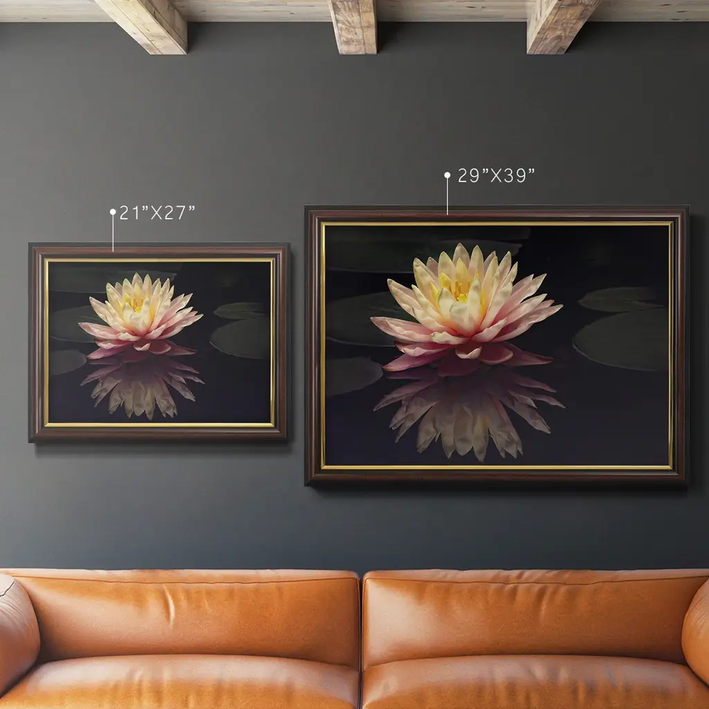 Photography Study Water Lily Premium Framed Canvas- Ready to Hang A Premium Framed Canvas created to last. Framed in distressed wood and available in an array of sizes and colors Featuring a beveled a solid wood stretcher bar, each piece comes ready to hand 3 SIZES AVAILABLE 16''X20'' - Overall Size 18'X27'' - Overall Size 24''x36'' - Overall Size Each piece is made to order. Each piece comes with hanging hardware. Made in the USA Ready to Hang Giclee Paper Print Acrylic Glass Beveled Matt Board
