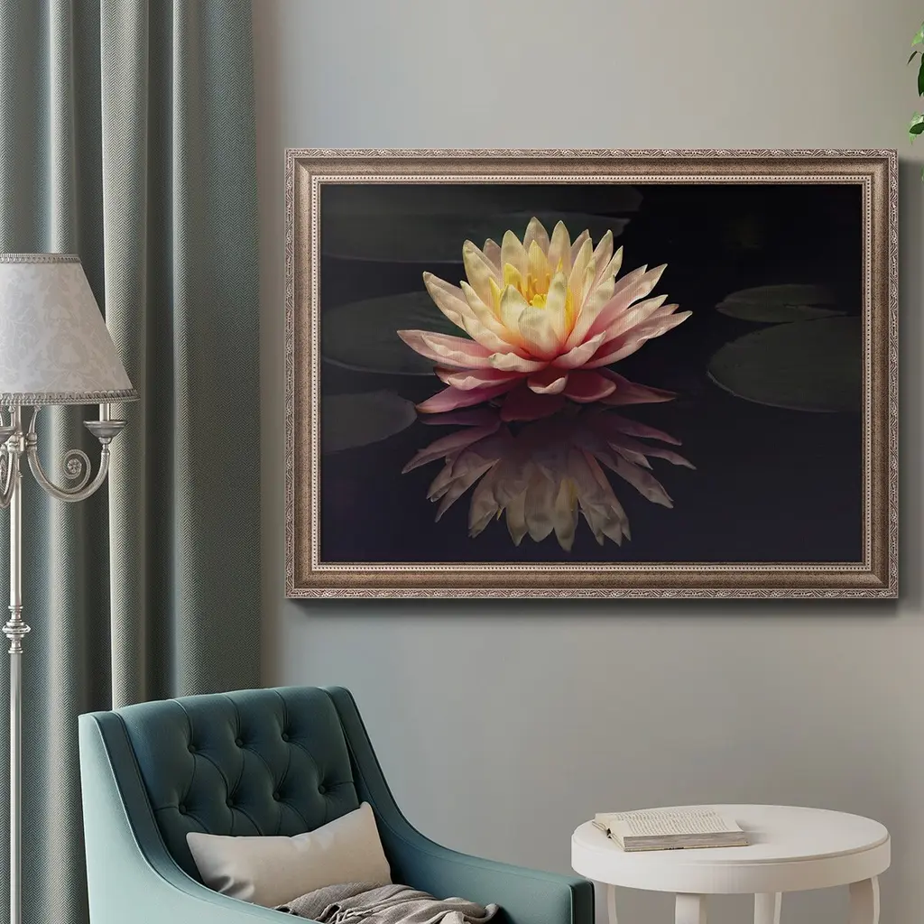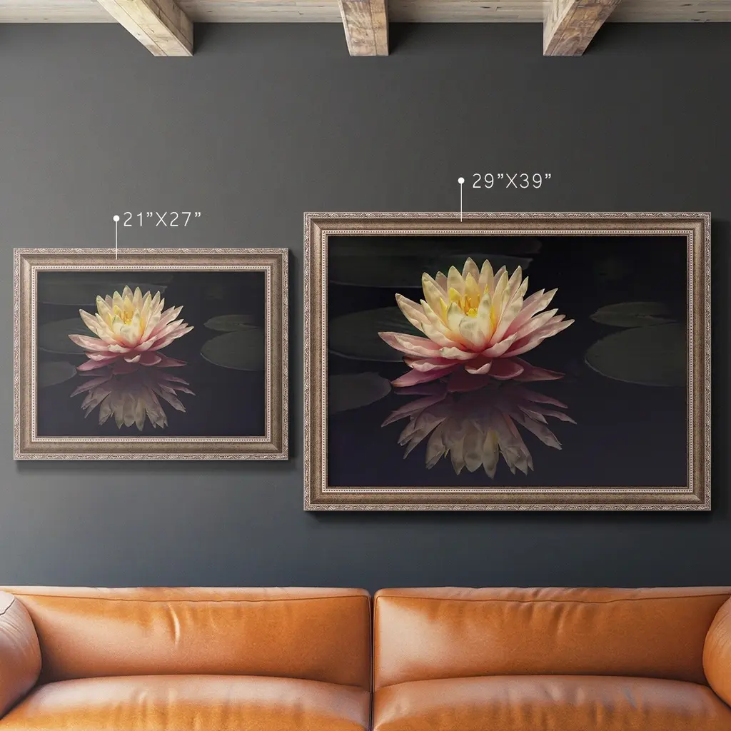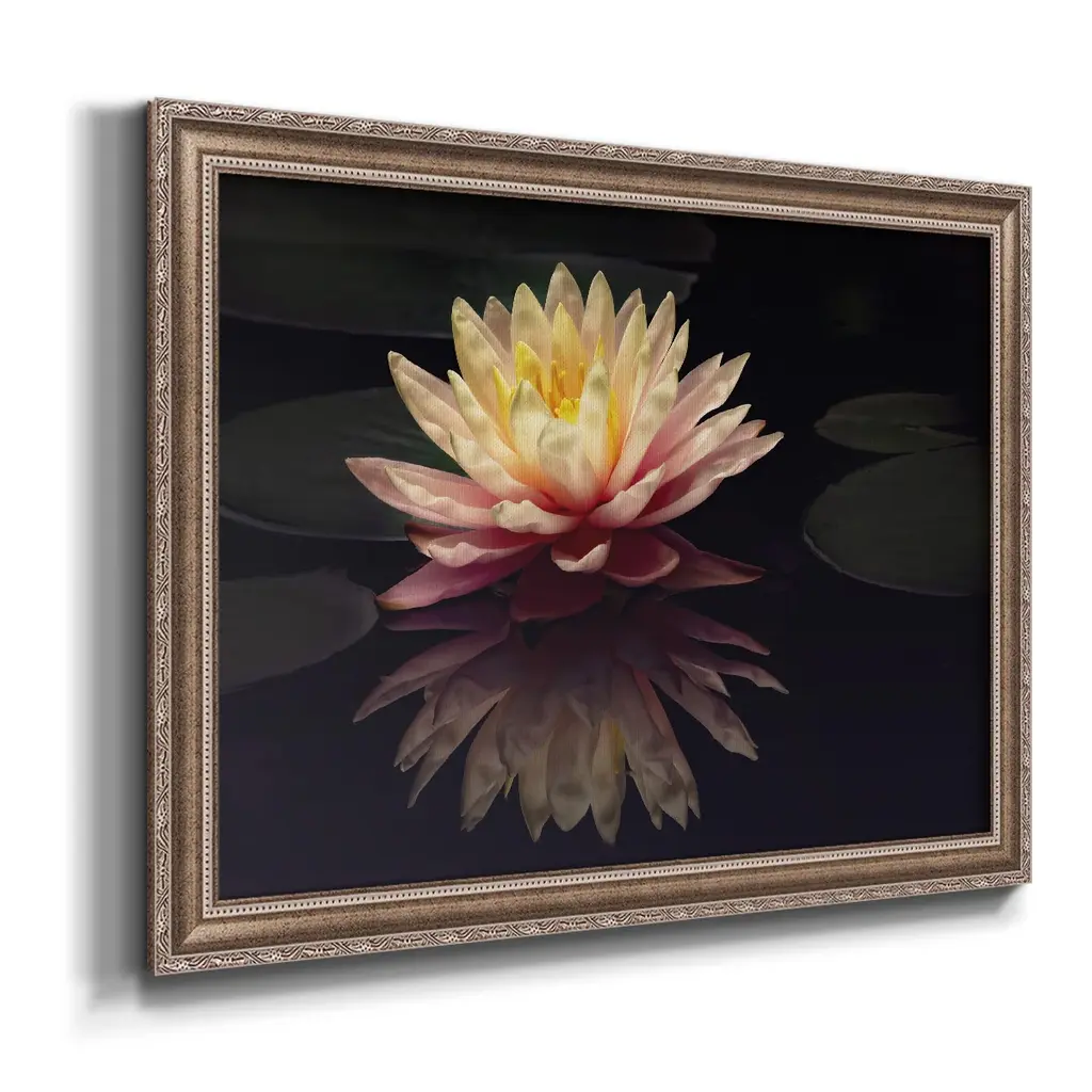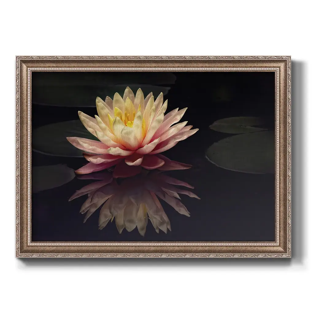 Photography Study Water Lily Premium Framed Canvas- Ready to Hang A Premium Framed Canvas created to last. Framed in distressed wood and available in an array of sizes and colors Featuring a beveled a solid wood stretcher bar, each piece comes ready to hand 3 SIZES AVAILABLE 16''X20'' - Overall Size 18'X27'' - Overall Size 24''x36'' - Overall Size Each piece is made to order. Each piece comes with hanging hardware. Made in the USA Ready to Hang Giclee Paper Print Acrylic Glass Beveled Matt Board