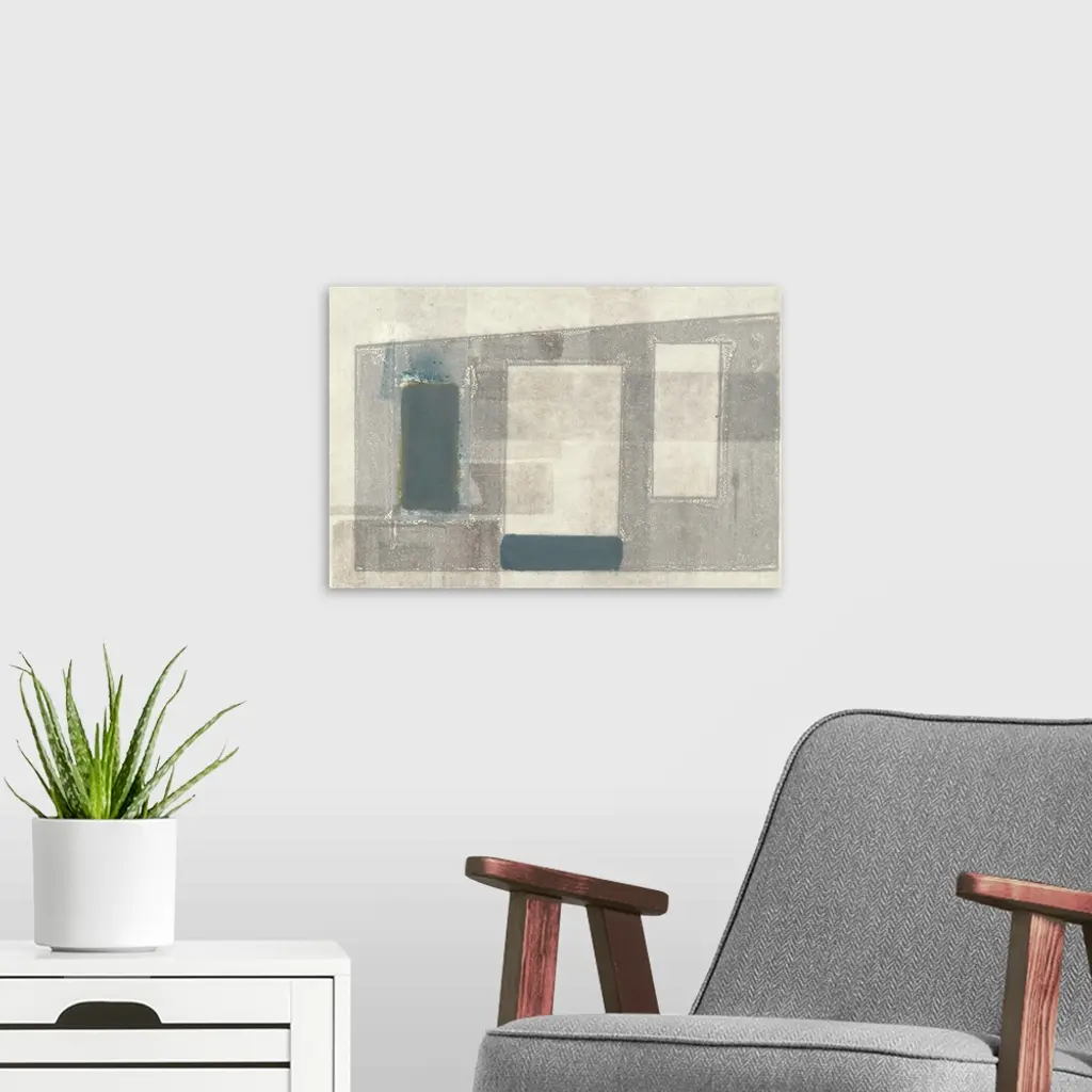 This contemporary artwork features overlapping angular shapes with distressed textures.