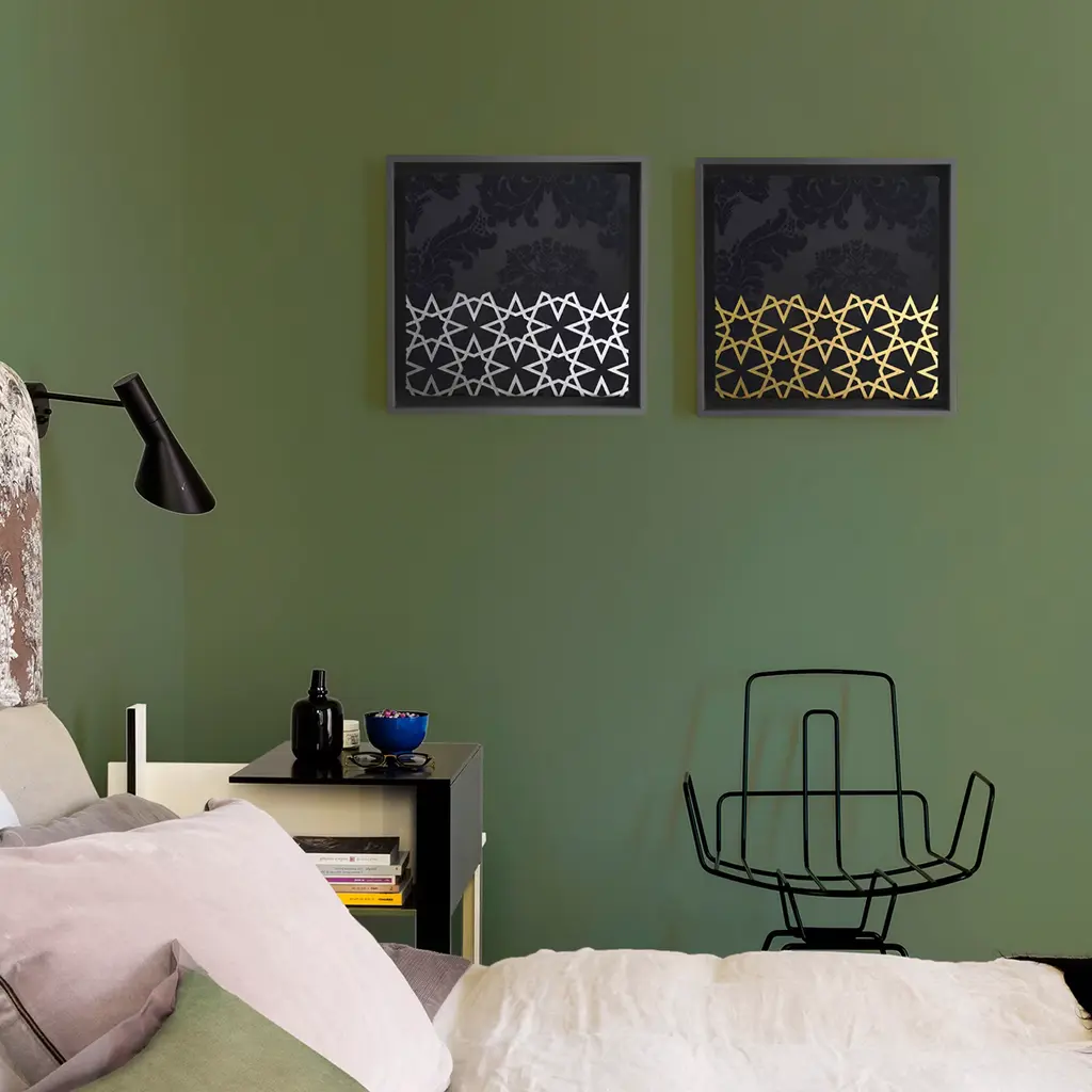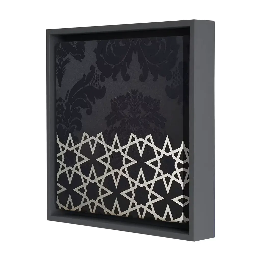 A smaller version of the Grande Contrappunto Collection, this stunning panel by Amelia Corvino takes inspiration from the musical term indicating the merging of different melodies, known as the counterpoint ("contrappunto" in Italian). Fashioned of the most refined Venetian black damask, its classic Western fabric motif is contrasted with a silver geometric pattern typical of the Islamic tradition, thus representing the art of the East. The wooden frame is available upon request.