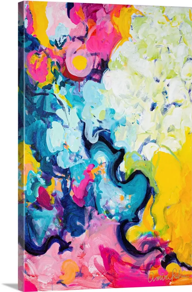 An abstract floral painting of a large vase of bright colored flowers blending together in small streaks of paint.