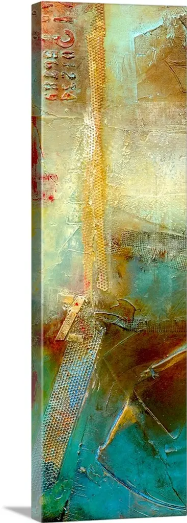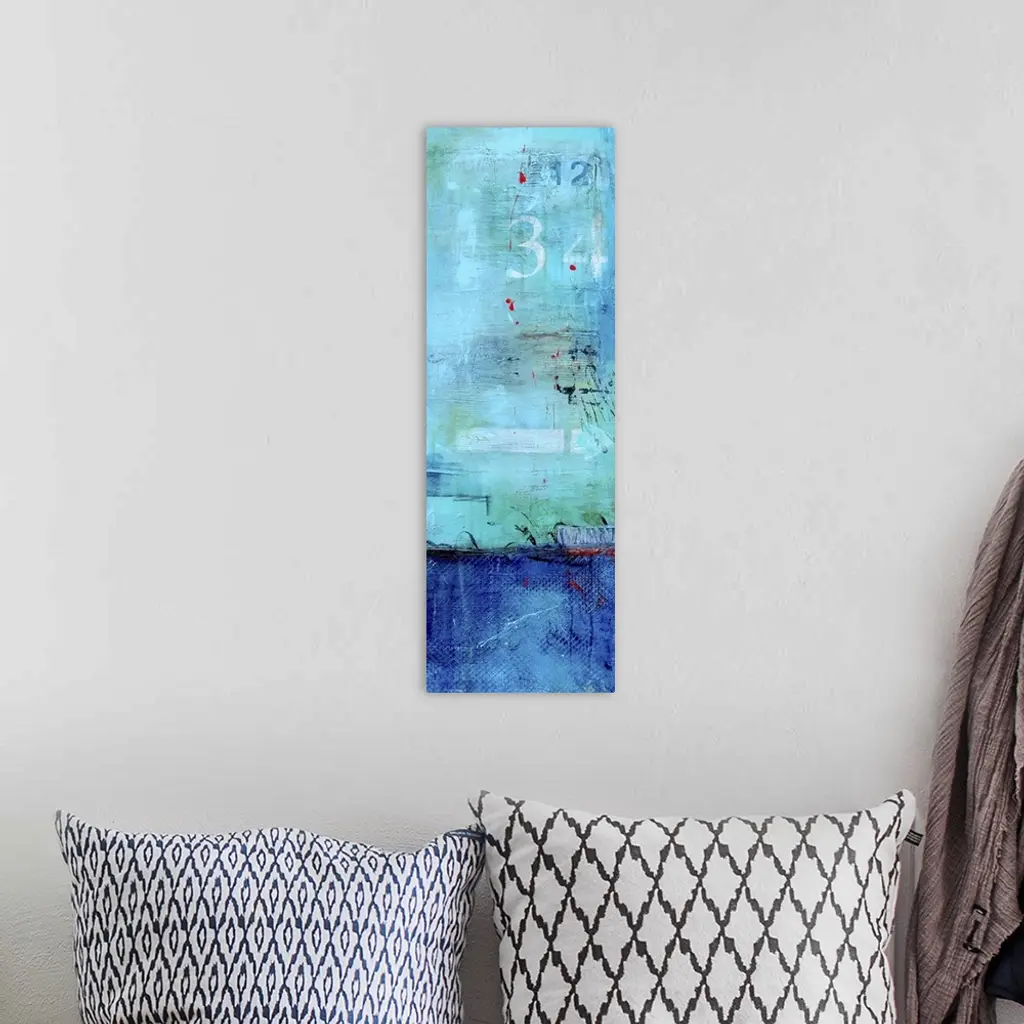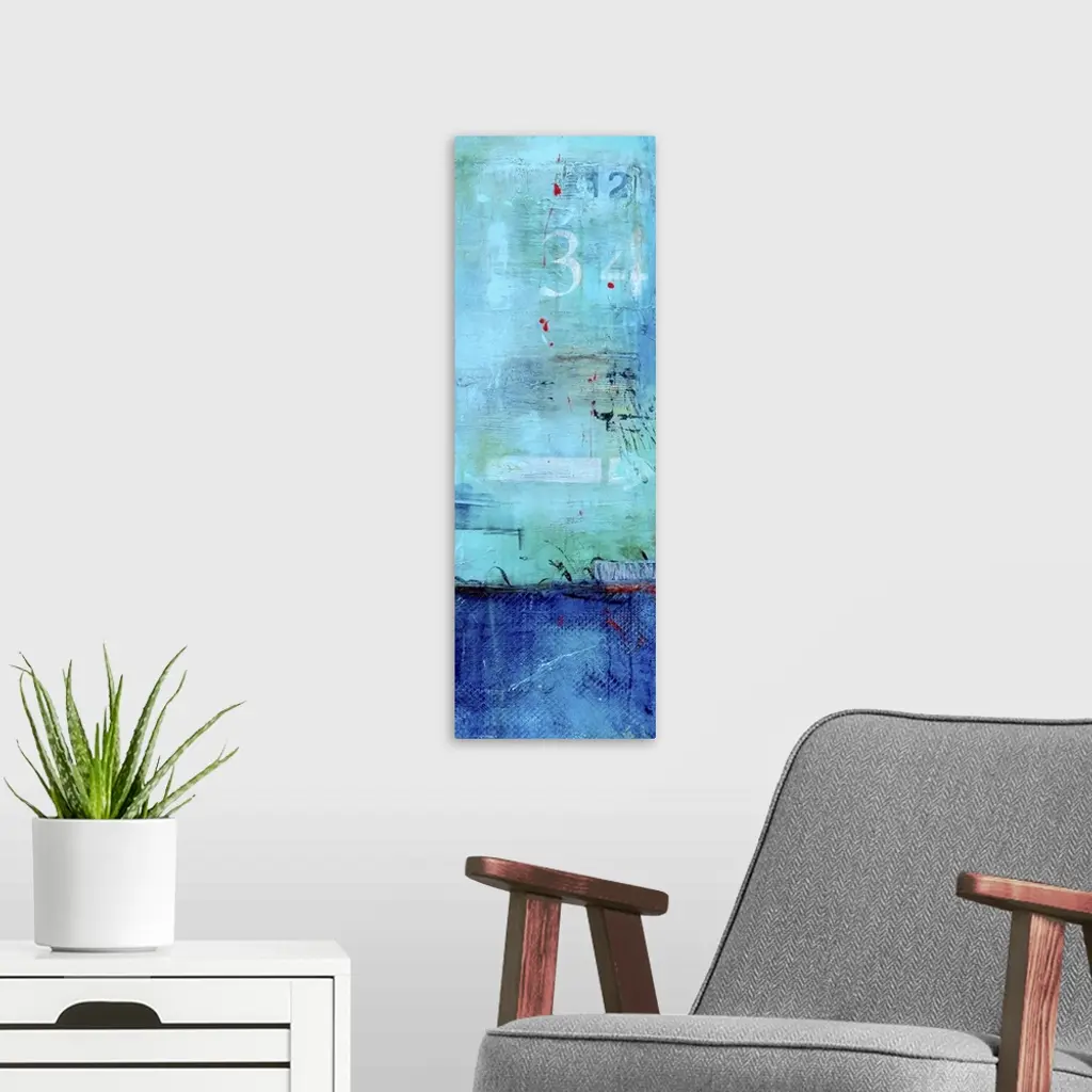 Contemporary abstract painting using two vibrant blue tones contrasting one another with stenciled lettering toward the top.