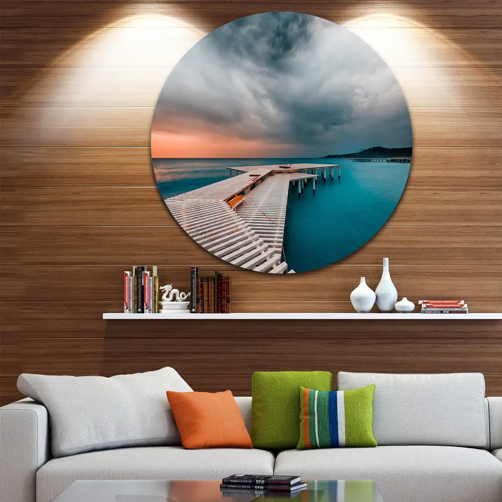 Bring Contemporary Abstraction to your home with this large Circle Metal wall art. This Pier in Ocean in Cloudy Day Metal Artwork makes it the focal point of any room or office. - White Gloss Coating ensures colors are extra vibrant with light reflection.- Aluminum grade Sheet Metal with 1 inch mounting frame on the back giving the illusion that the artwork is floating on the wall..- Mounting Brackets are included along with instructions.- High Quality Digital images are created directly into a glossy aluminum panel producing a stunning and captivating print into the glossy finish of the metal.- Water, Fire and Scratch resistant HD Aluminum panels.- Looks better than any photo paper and guaranteed to last at least 20 years- Easy to clean with a microfiber cloth. Colors are far superior to regular Canvas Art. - Easy to Hang