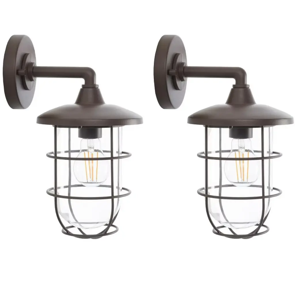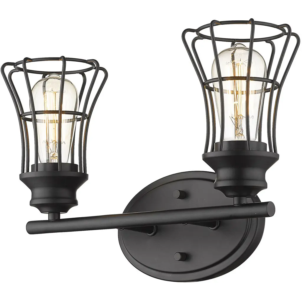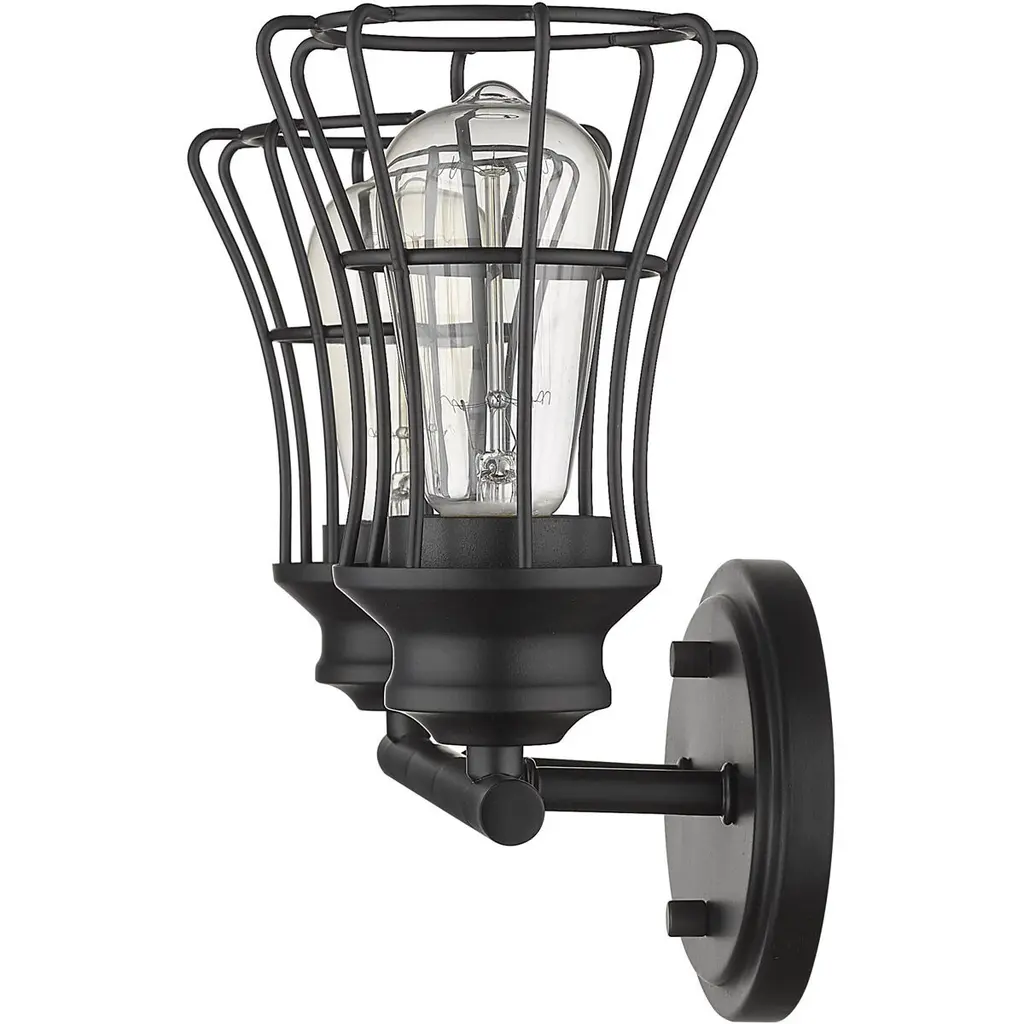 Piers features metal framework reminiscent of the workshop with soft styling that is perfect for the bath. The oil-rubbed bronze or matte black finish continues onto the metal cage shades. Piers may be mounted in an upward or downward position.