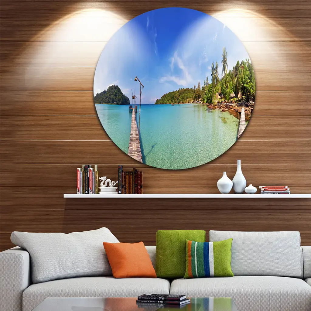 Bring Contemporary Abstraction to your home with this large Circle Metal wall art. This Piers and Palm Trees on Island Metal Artwork makes it the focal point of any room or office. - White Gloss Coating ensures colors are extra vibrant with light reflection.- Aluminum grade Sheet Metal with 1 inch mounting frame on the back giving the illusion that the artwork is floating on the wall..- Mounting Brackets are included along with instructions.- High Quality Digital images are created directly into a glossy aluminum panel producing a stunning and captivating print into the glossy finish of the metal.- Water, Fire and Scratch resistant HD Aluminum panels.- Looks better than any photo paper and guaranteed to last at least 20 years- Easy to clean with a microfiber cloth. Colors are far superior to regular Canvas Art. - Easy to Hang