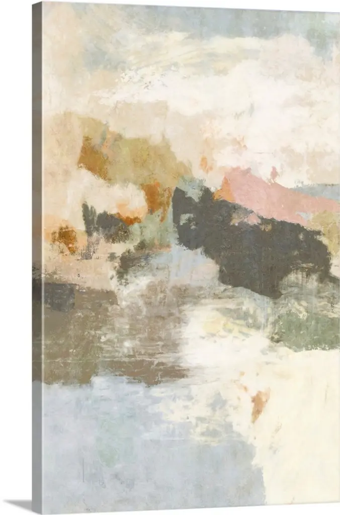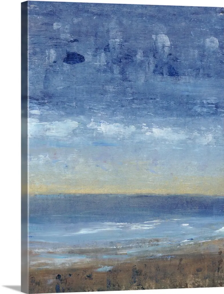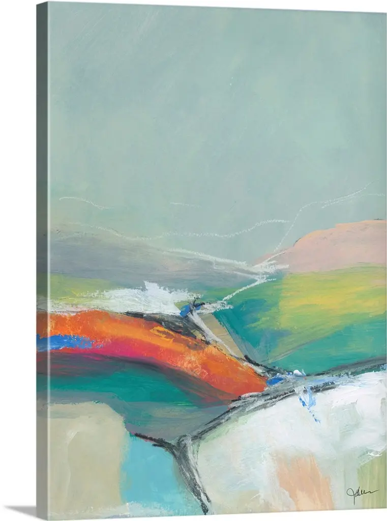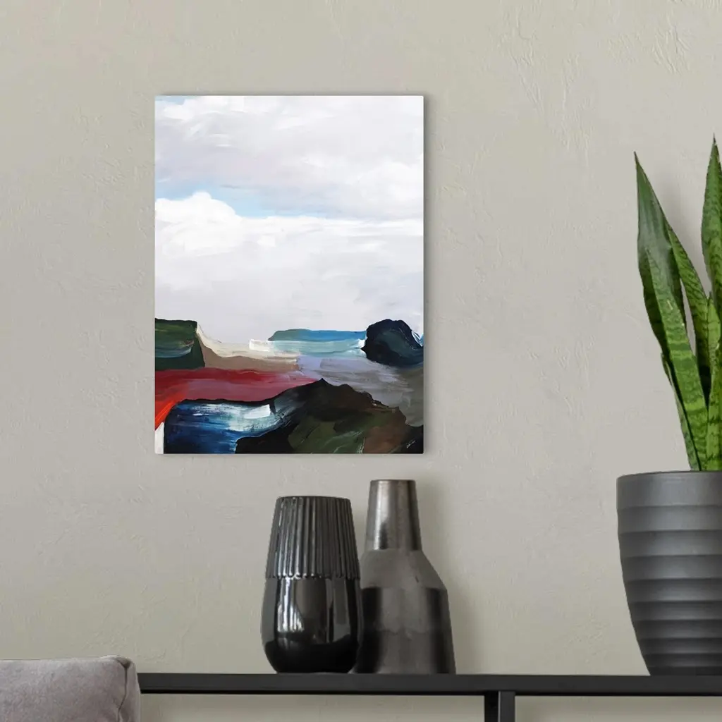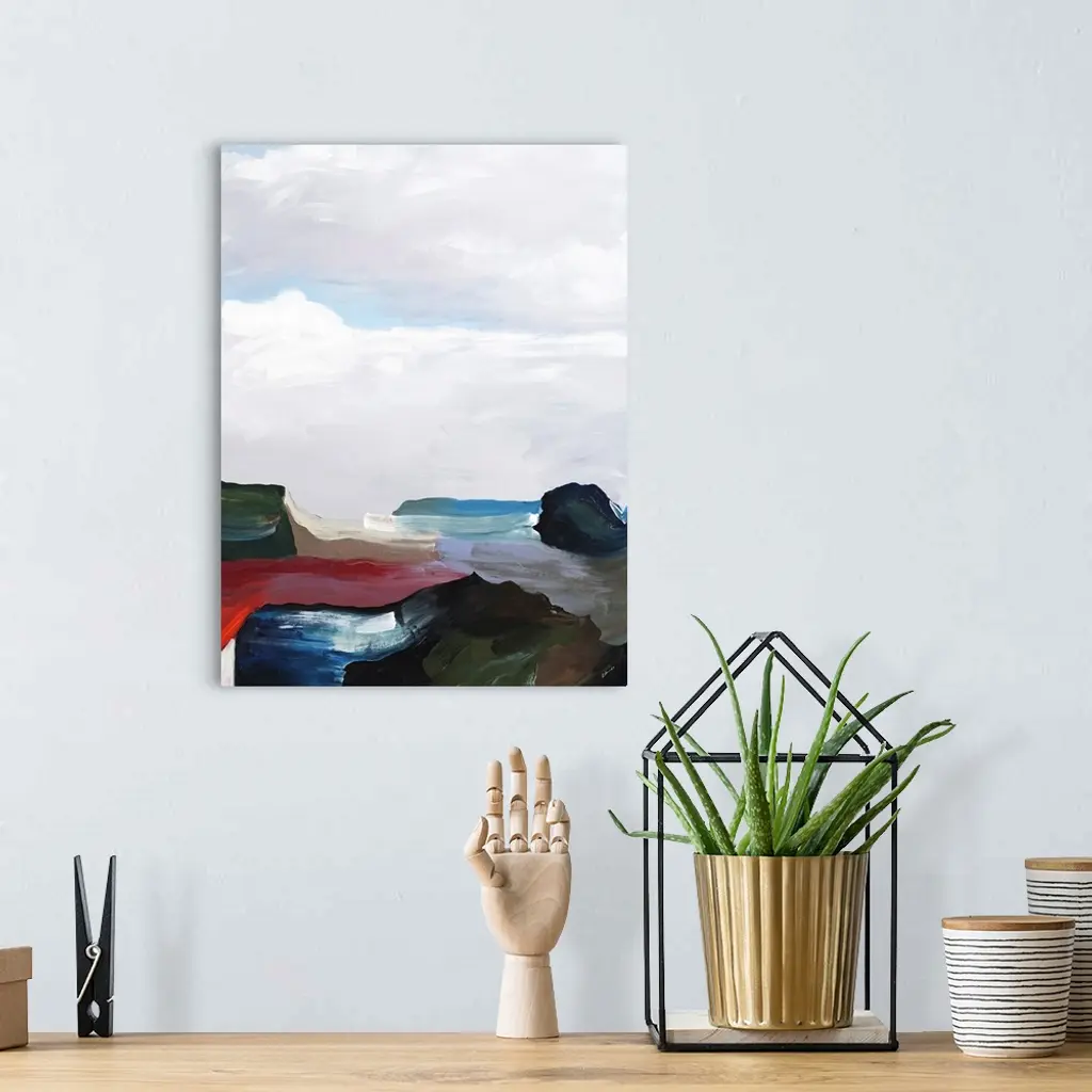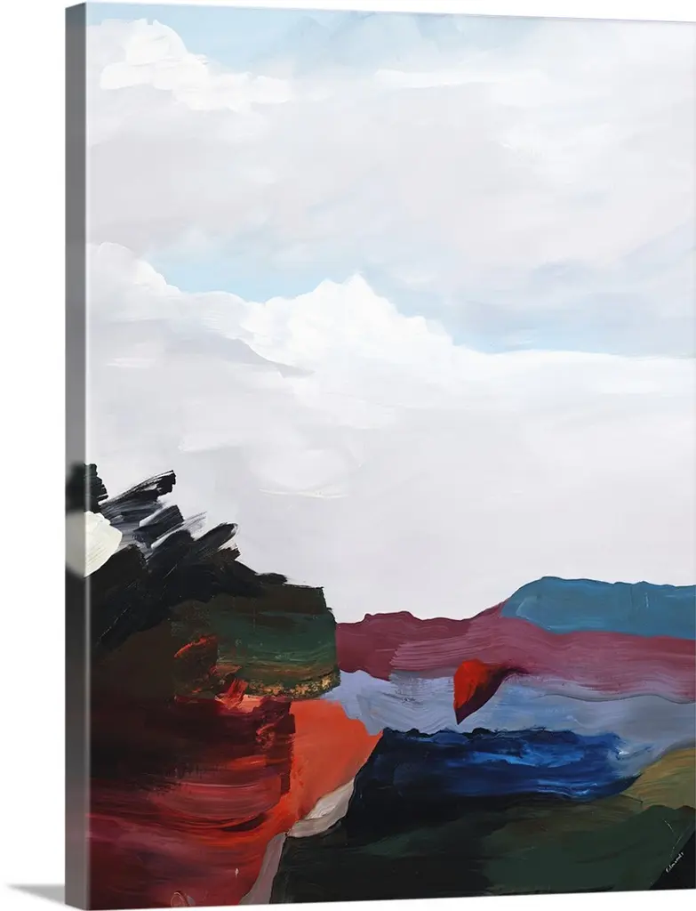 Contemporary abstract painting with deep red and blue, with pale white above, resembling clouds over a landscape.