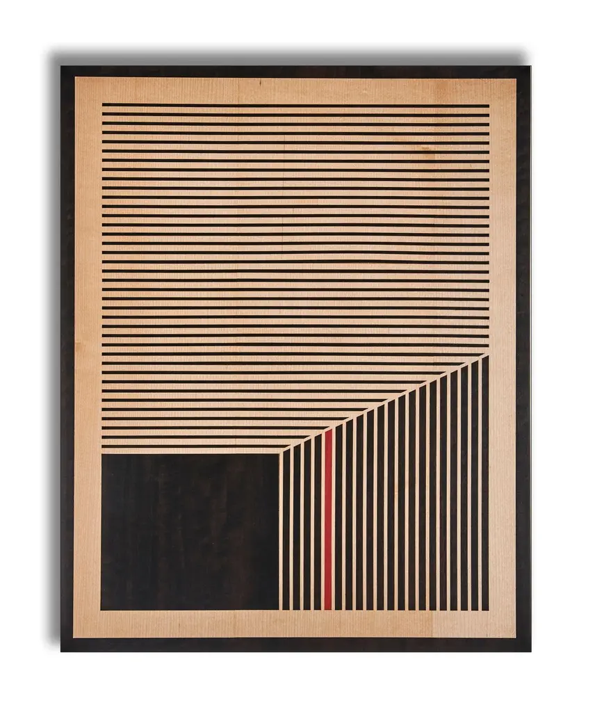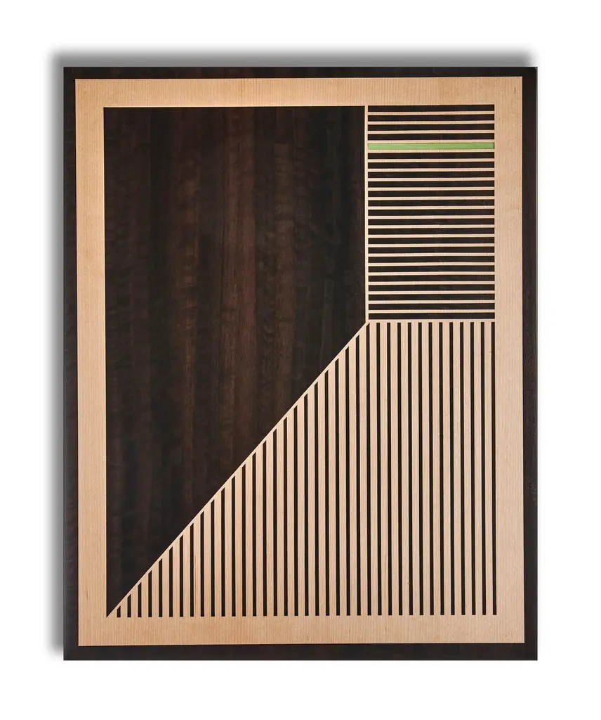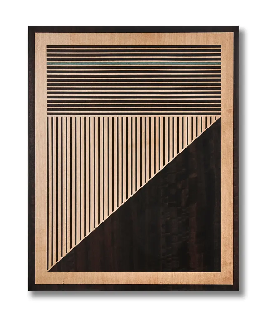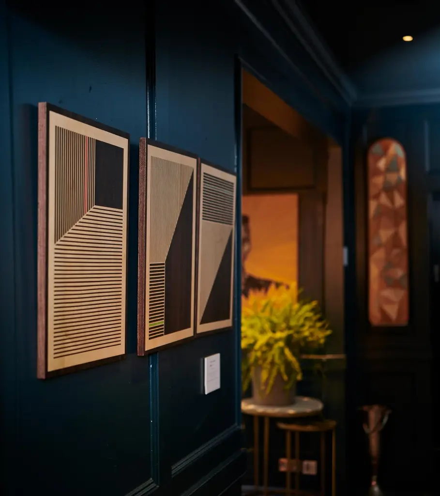This recent triptych from the w o o d p o p studio is an example of the type of modern marquetry that w o o d p o p is becoming synonymous with. Since its inception 10 years ago - the studio has specialised in marquetry and inlay work; meticulous art-forms where pieces of wood veneer are inlaid to create decorative designs or pictures. Emma Wood, who founded the studio 10 years ago in Wales' Black Mountains has gained a reputation for pairing this traditional art-form with contemporary subject matter and its application on to non-traditional surfaces.This triptych is made up of 3 marquetry artworks. Each one features a combination of Sycamore and Fumed Figured Eucalyptus with a pop of dyed American Tulip. Each piece is 400 x 500mm and they are mounted on 15mm board with solid walnut edges. This is a limited run of 20. Each triptych will be numbered and signed.