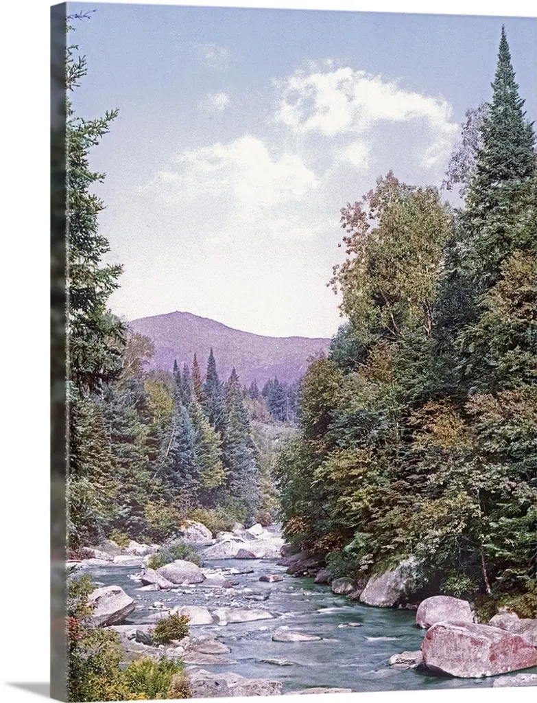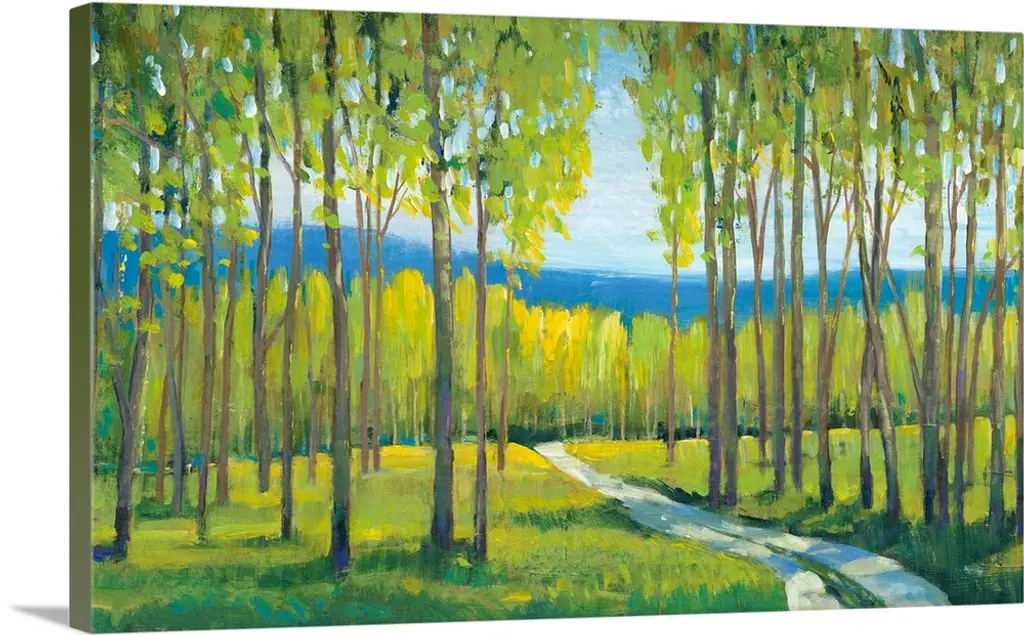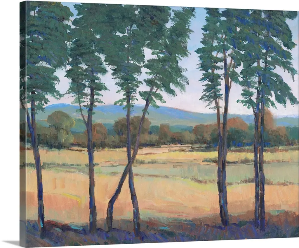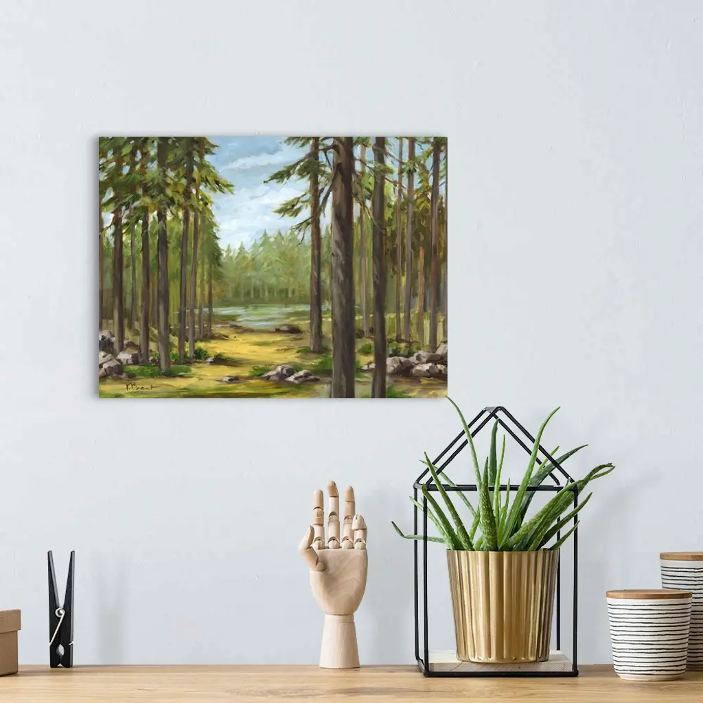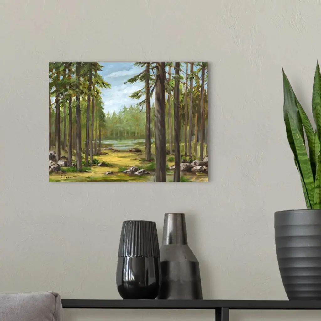 Contemporary landscape painting of a forest with tall pine trees and a river.