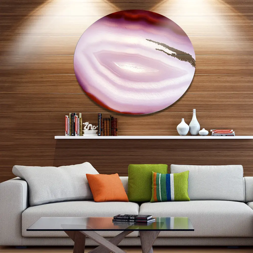 Bring Contemporary Abstraction to your home with this large Circle Metal wall art. This Pink Agate Geode Geological Crystals Metal Artwork makes it the focal point of any room or office. - White Gloss Coating ensures colors are extra vibrant with light reflection.- Aluminum grade Sheet Metal with 1 inch mounting frame on the back giving the illusion that the artwork is floating on the wall..- Mounting Brackets are included along with instructions.- High Quality Digital images are created directly into a glossy aluminum panel producing a stunning and captivating print into the glossy finish of the metal.- Water, Fire and Scratch resistant HD Aluminum panels.- Looks better than any photo paper and guaranteed to last at least 20 years- Easy to clean with a microfiber cloth. Colors are far superior to regular Canvas Art. - Easy to Hang