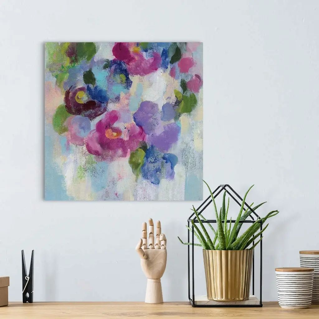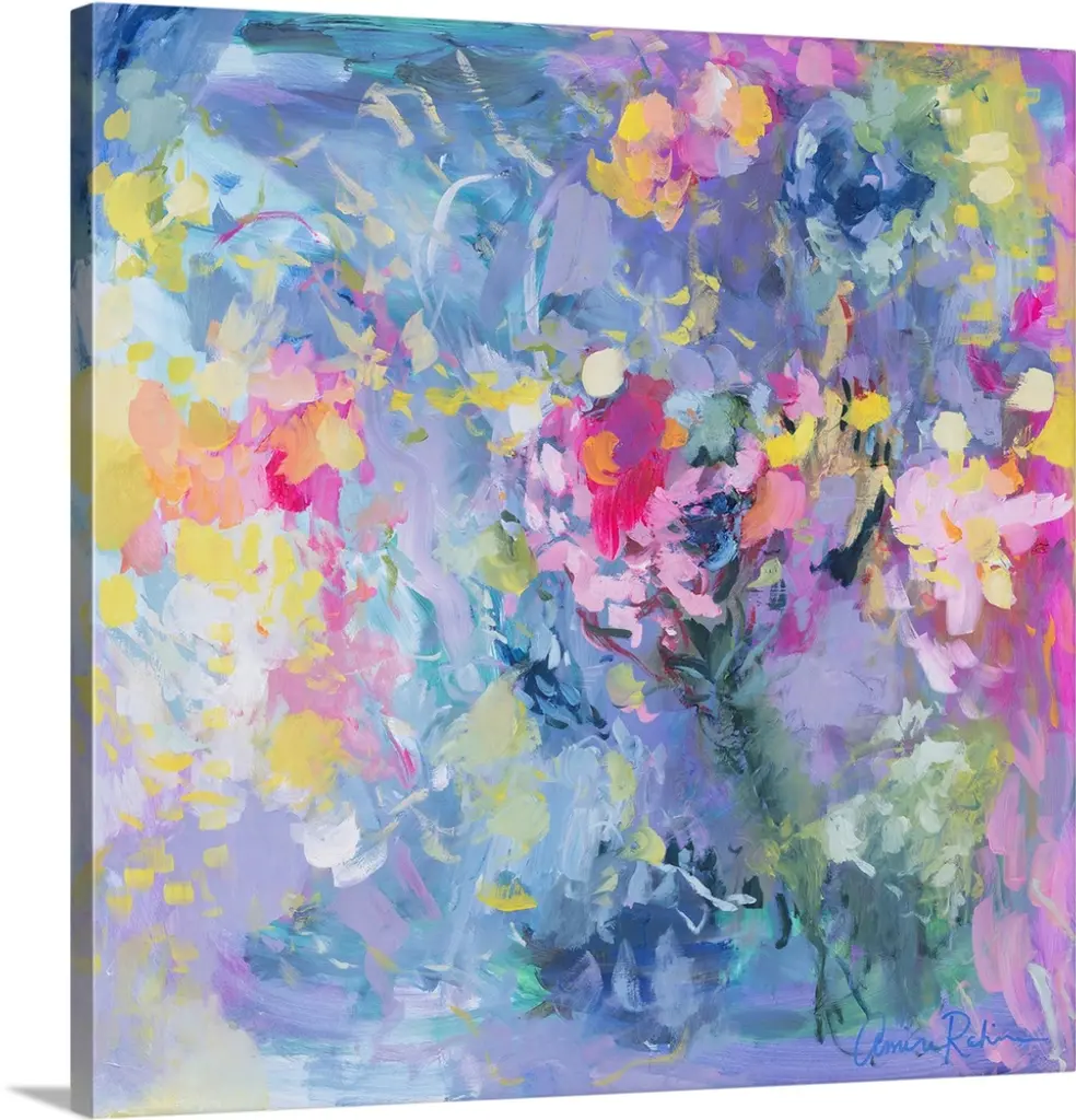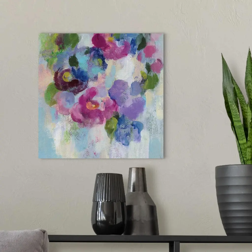 Contemporary painting of blooming flowers in purple and pink.