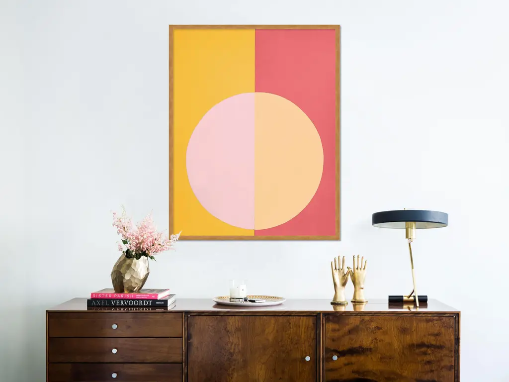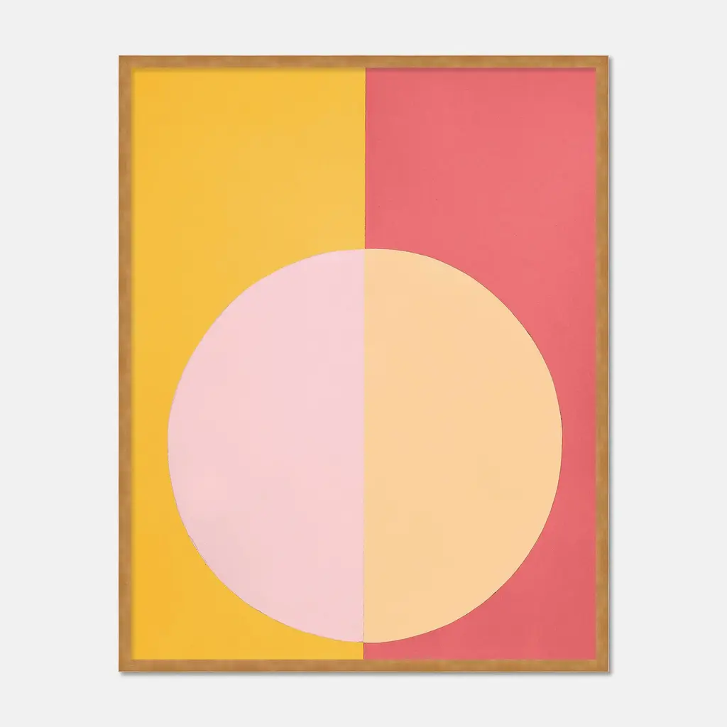 DESCRIPTION: Pink & Orange Forever by Stephanie Henderson in Gold Frame, Medium Art Print SPECIFICATIONS: Type: Framed Paper. Framed Size (in): 28.5x36. Orientation: Vertical. Flush/Float/Matted: Flush. Frame Color: Gold. Hanging Hardware: Picture Perfect. FRAMING: Each art work arrives framed and ready to hang. We use handmade frames with a plexiglass glazing front, because it offers less glare than standard glass. At this time, we only offer framed prints. ARTIST BIO: Stephanie Lear Henderson is a painter living in Ponte Vedra Beach, Florida. Her work can be found in collections throughout the US and Canada. Working primarily in hard-edge abstraction, she also occasionally paints representational works in oil. A native of Thomasville, Georgia, Stephanie earned a B.A. in English Literature from the University of Virginia and an M.A. in Journalism from the University of Georgia. Stephanie’s work revolves around bold, saturated color and how colors communicate with each other and affect the observer. Her paintings contain forms that are simple, allowing the colors to express themselves without complications. Stephanie’s work reveals focus, precision, and an insatiable appetite for evocative combinations of color. She revels in the challenge of painting perfectly clean lines freehand with a brush. No tape. No masking.Stephanie embraces the belief that color alters mood, outlook, and brings absolute joy to life. Stephanie's artwork has appeared in a multitued of publications including House Beautiful and The CUT.