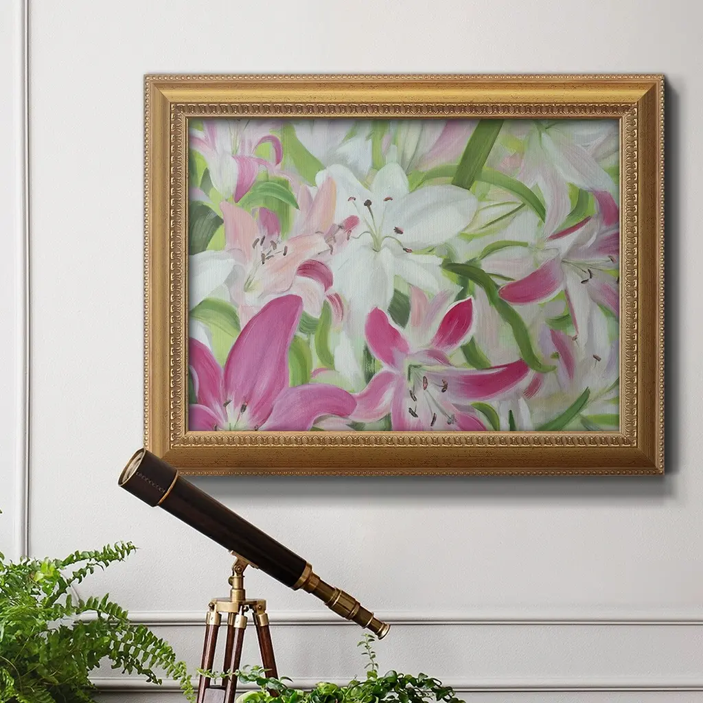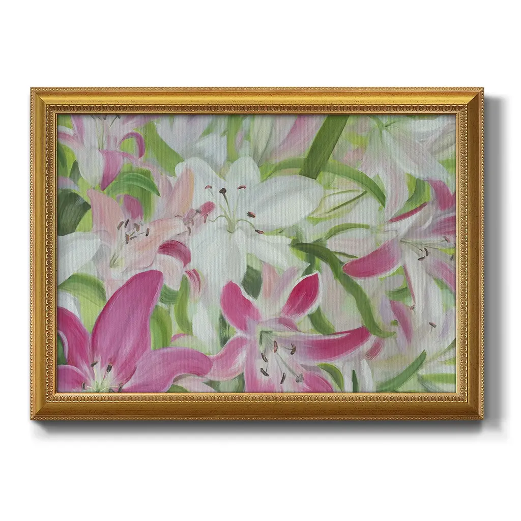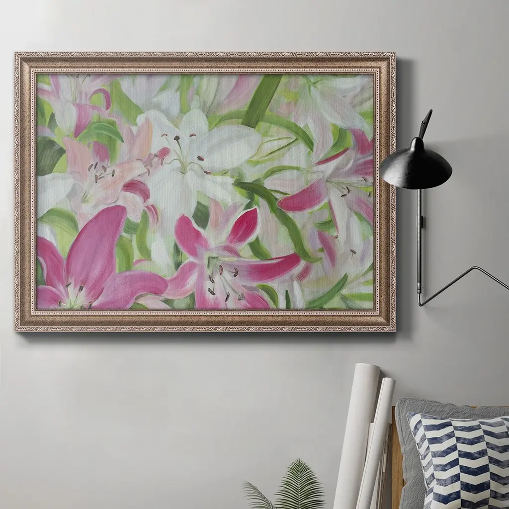Pink and White Lilies II Premium Framed Canvas- Ready to Hang A Premium Framed Canvas created to last. Framed in distressed wood and available in an array of sizes and colors Featuring a beveled a solid wood stretcher bar, each piece comes ready to hand 3 SIZES AVAILABLE 16''X20'' - Overall Size 18'X27'' - Overall Size 24''x36'' - Overall Size Each piece is made to order. Each piece comes with hanging hardware. Made in the USA Ready to Hang Giclee Paper Print Acrylic Glass Beveled Matt Board