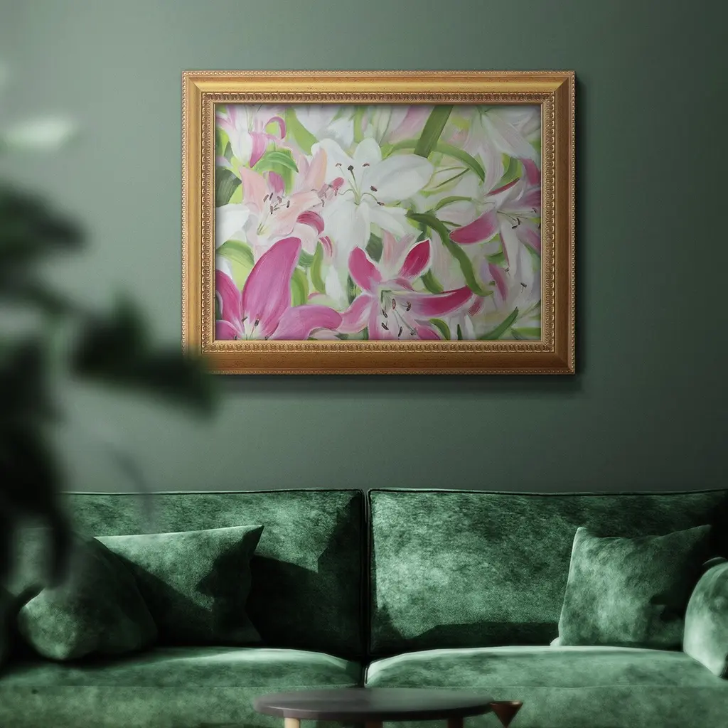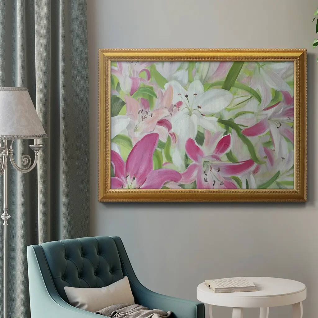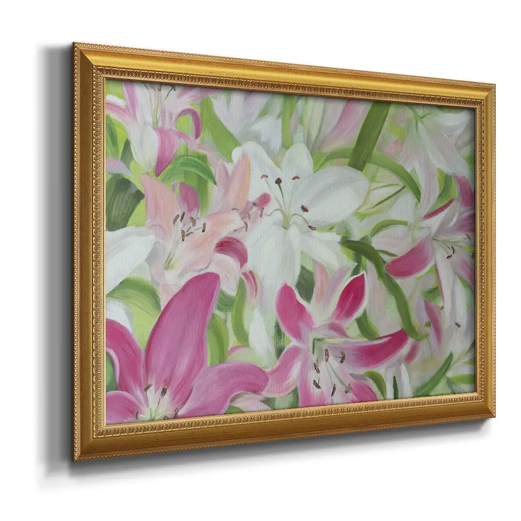 Pink and White Lilies II Premium Framed Canvas- Ready to Hang A Premium Framed Canvas created to last. Framed in distressed wood and available in an array of sizes and colors Featuring a beveled a solid wood stretcher bar, each piece comes ready to hand 3 SIZES AVAILABLE 16''X20'' - Overall Size 18'X27'' - Overall Size 24''x36'' - Overall Size Each piece is made to order. Each piece comes with hanging hardware. Made in the USA Ready to Hang Giclee Paper Print Acrylic Glass Beveled Matt Board
